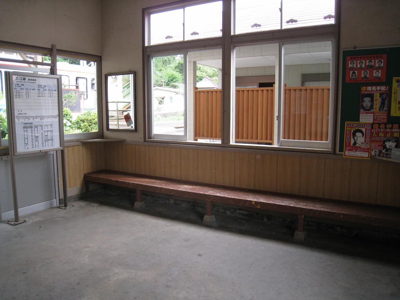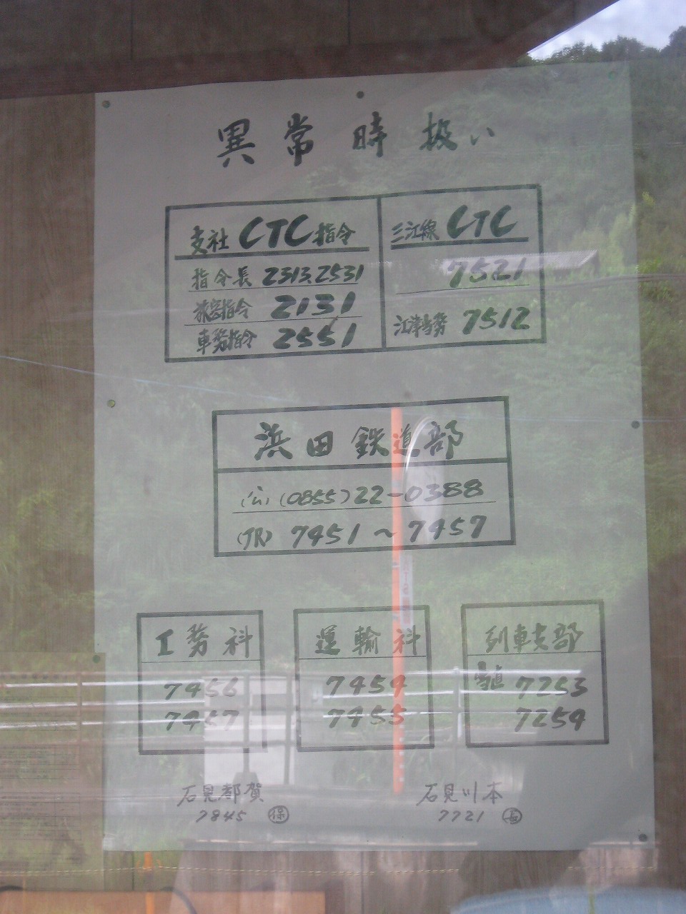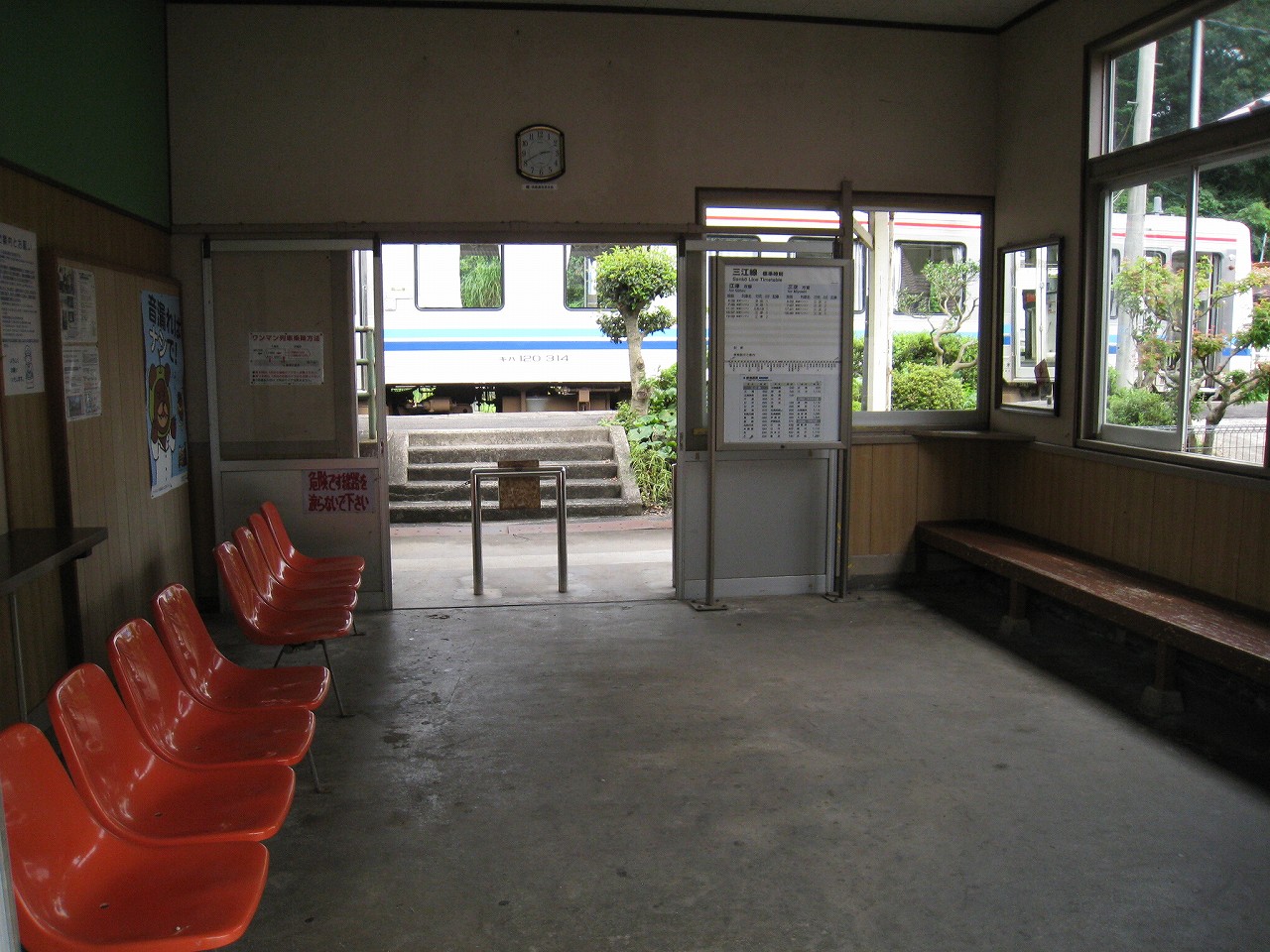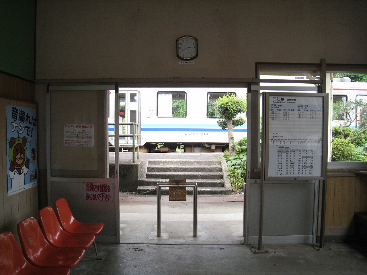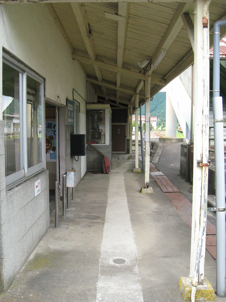 早く車内に入りたかった。ともかくもう暑くて…雲多めで日差しはないがそれでも室内は多少はマシだった。といっても開放型だから外とおんなじみたいなもんだけど… 据え付け長椅子もあり、新設トイレ、三江線には珍しく駅近に自販機があるので、やはりここは駅寝するにはよさそうだ。残念ながらここを起点に取ると最短で全駅来訪ができないのでその予定はないが…窓口は完全に壁と化していて、かつての駅舎内の面影はない。構内側の軒下からは転轍機操作室や電話番号表が見え、以前はここにも人が詰めていたのだなぁと思い耽る。夏は暑く、冬は積雪区間を管理、近くに店もない、メシはどうしていたのだろうと思うが、日の丸弁当ばかりだった中、なんとなし、たまたま料理好きな若手職員が入ってきて、駅務室の簡単な炊事場で親子丼などを作りはじめるや、好評となり定着となるも、しだいになんでおれがこんなことをと"シェフ"の不満が鬱積、ヴェテランが「いやぁ、なんだ、君にはちゃんと仕事も教えとる。しかし教えるたって、教えられりゃ誰でもできることさね、んなに気負うことはねぇ。けど、料理はそうとも限らん。最近は民営化の話もある、ここがダメになっても、お前はなんとかなるじゃねぇか」と諭して駄賃も出し、飯場担当を続ける、そんな物語が思い浮かんだ。