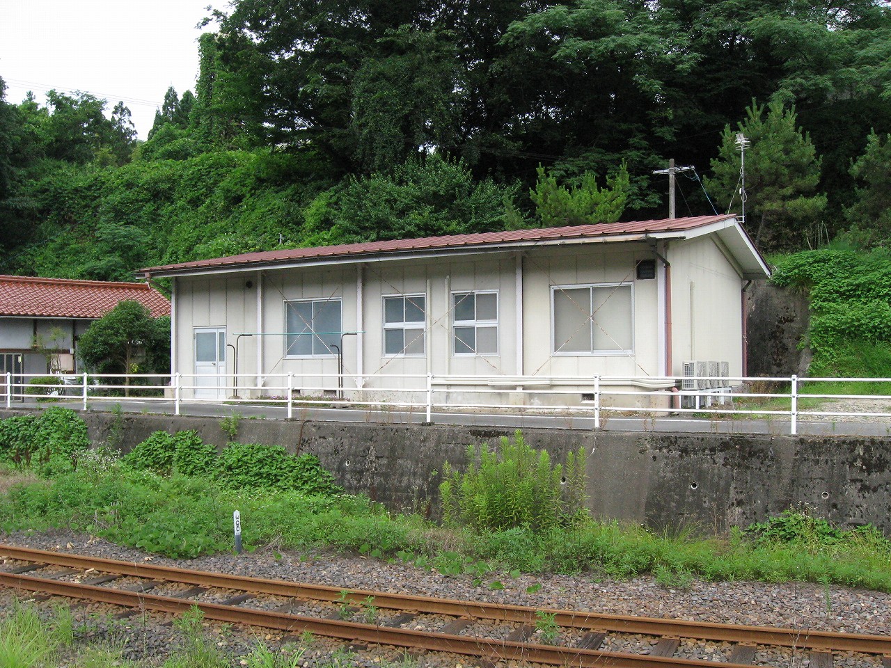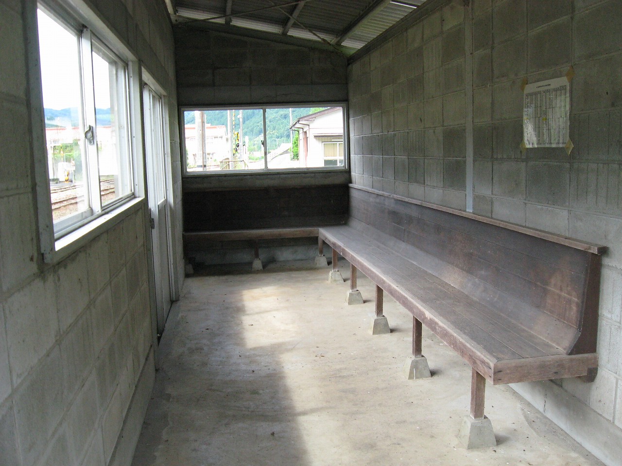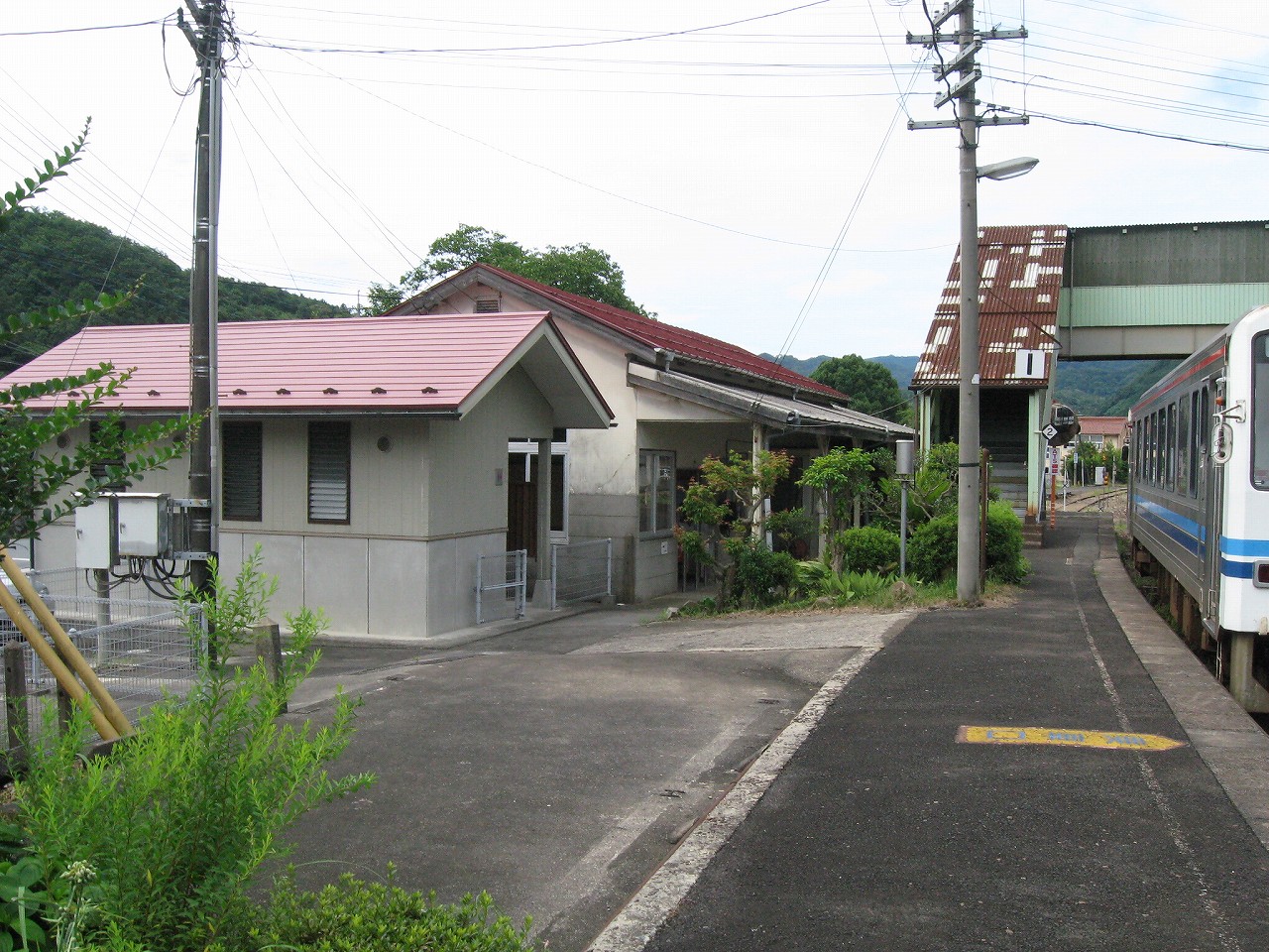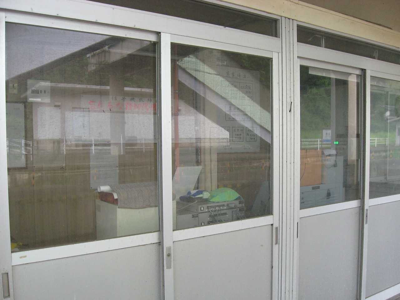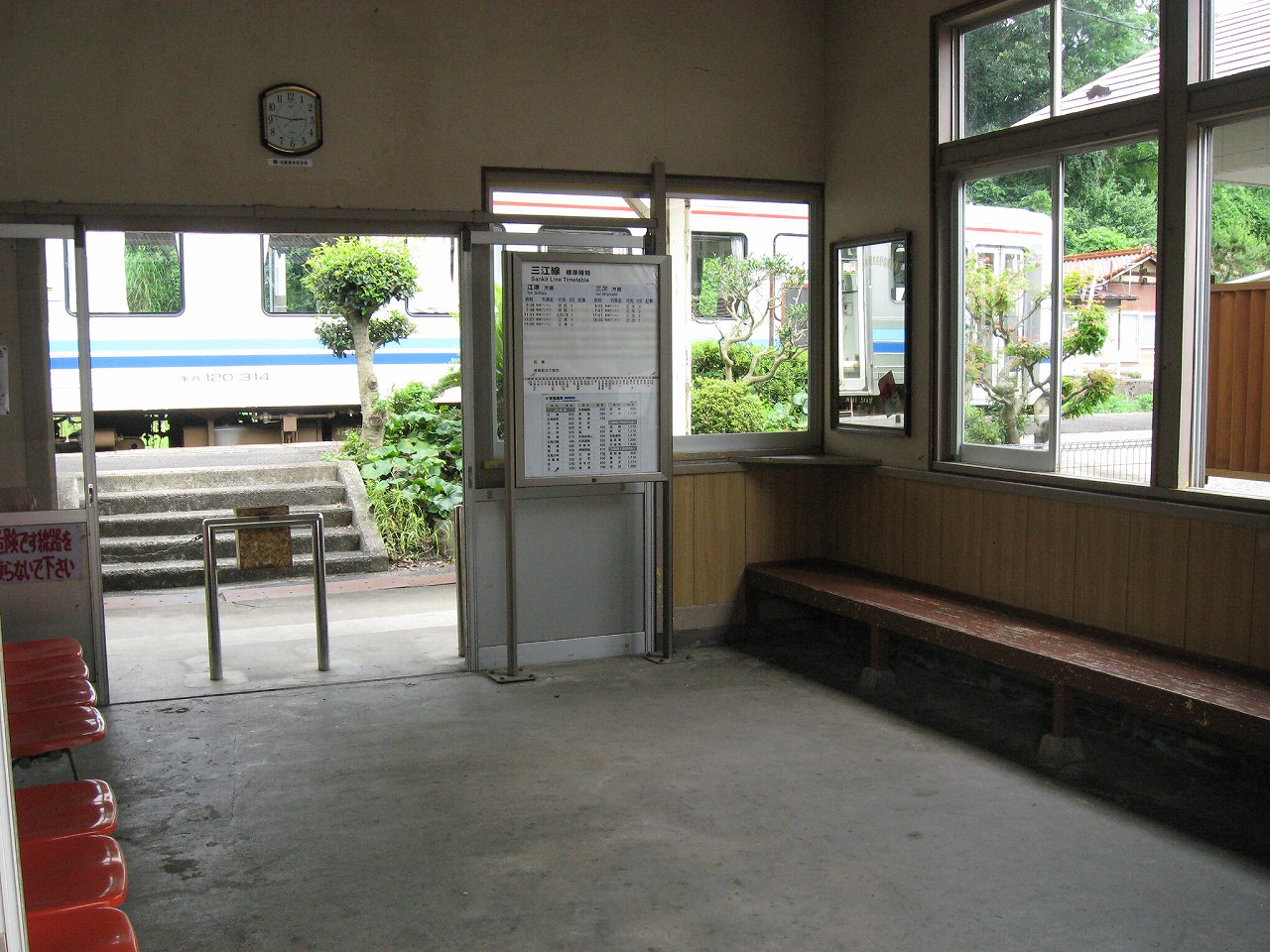 早く車内に入りたかった。ともかくもう暑くて…雲多めで日差しはないがそれでも室内は多少はマシだった。といっても開放型だから外とおんなじみたいなもんだけど… 据え付け長椅子もあり、新設トイレ、三江線には珍しく駅近に自販機があるので、やはりここは駅寝するにはよさそうだ。残念ながらここを起点に取ると最短で全駅来訪ができないのでその予定はないが…窓口は完全に壁と化していて、かつての駅舎内の面影はない。構内側の軒下からは転轍機操作室や電話番号表が見え、以前はここにも人が詰めていたのだなぁと思い耽る。夏は暑く、冬は積雪区間を管理、近くに店もない、メシはどうしていたのだろうと思うが、日の丸弁当ばかりだった中、なんとなし、たまたま料理好きな若手職員が入ってきて、駅務室の簡単な炊事場で親子丼などを作りはじめるや、好評となり定着となるも、しだいになんでおれがこんなことをと"シェフ"の不満が鬱積、ヴェテランが「いやぁ、なんだ、君にはちゃんと仕事も教えとる。しかし教えるたって、教えられりゃ誰でもできることさね、んなに気負うことはねぇ。けど、料理はそうとも限らん。最近は民営化の話もある、ここがダメになっても、お前はなんとかなるじゃねぇか」と諭して駄賃も出し、飯場担当を続ける、そんな物語が思い浮かんだ。