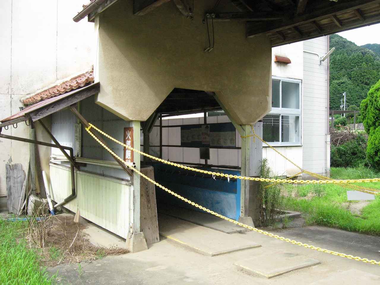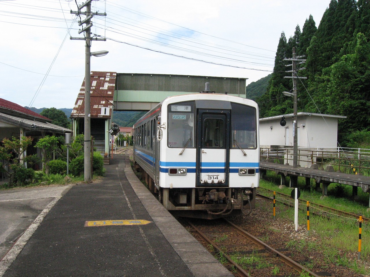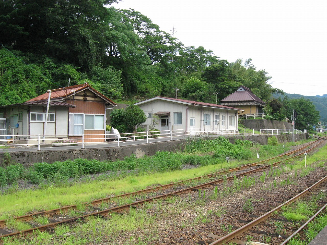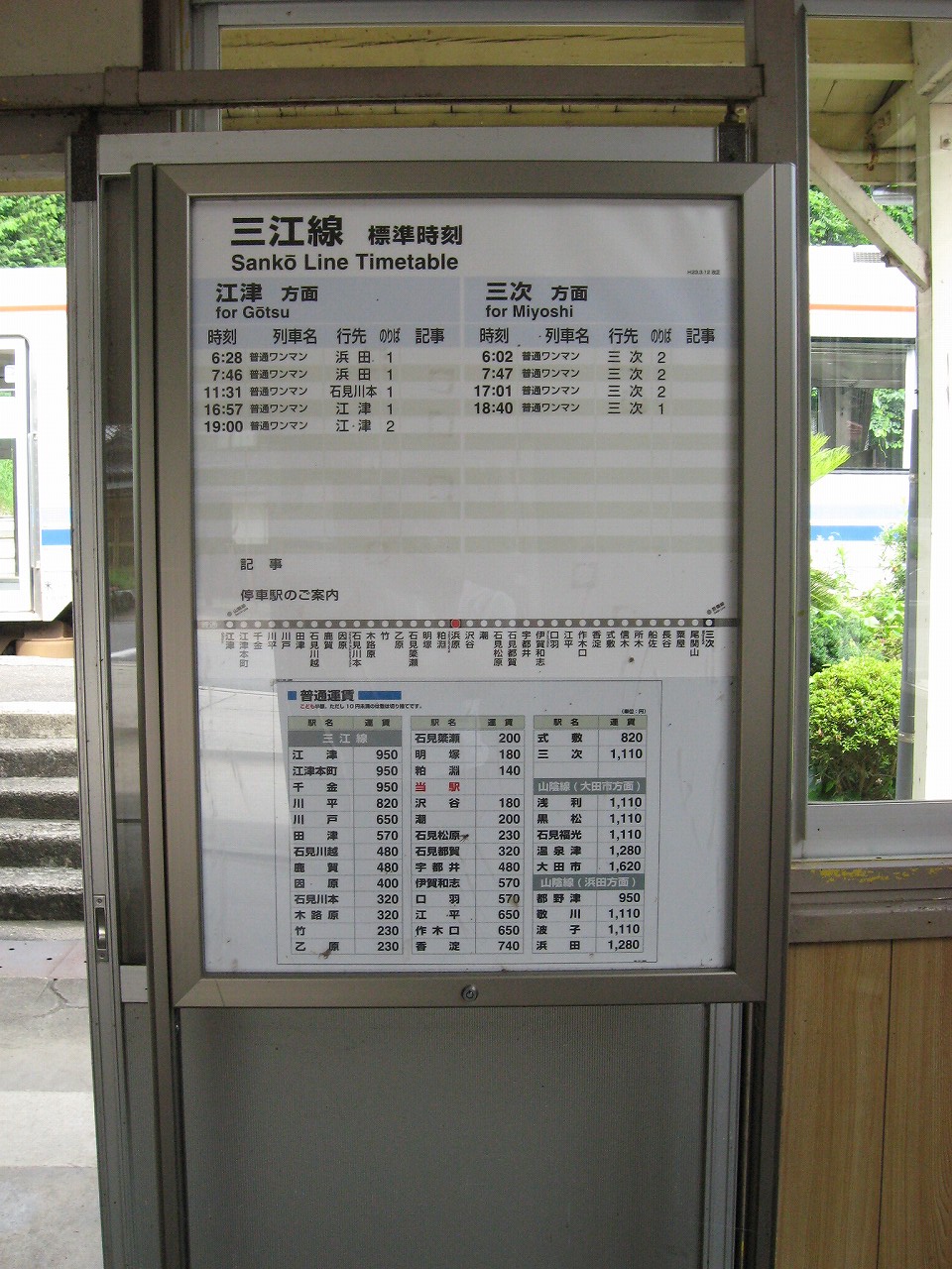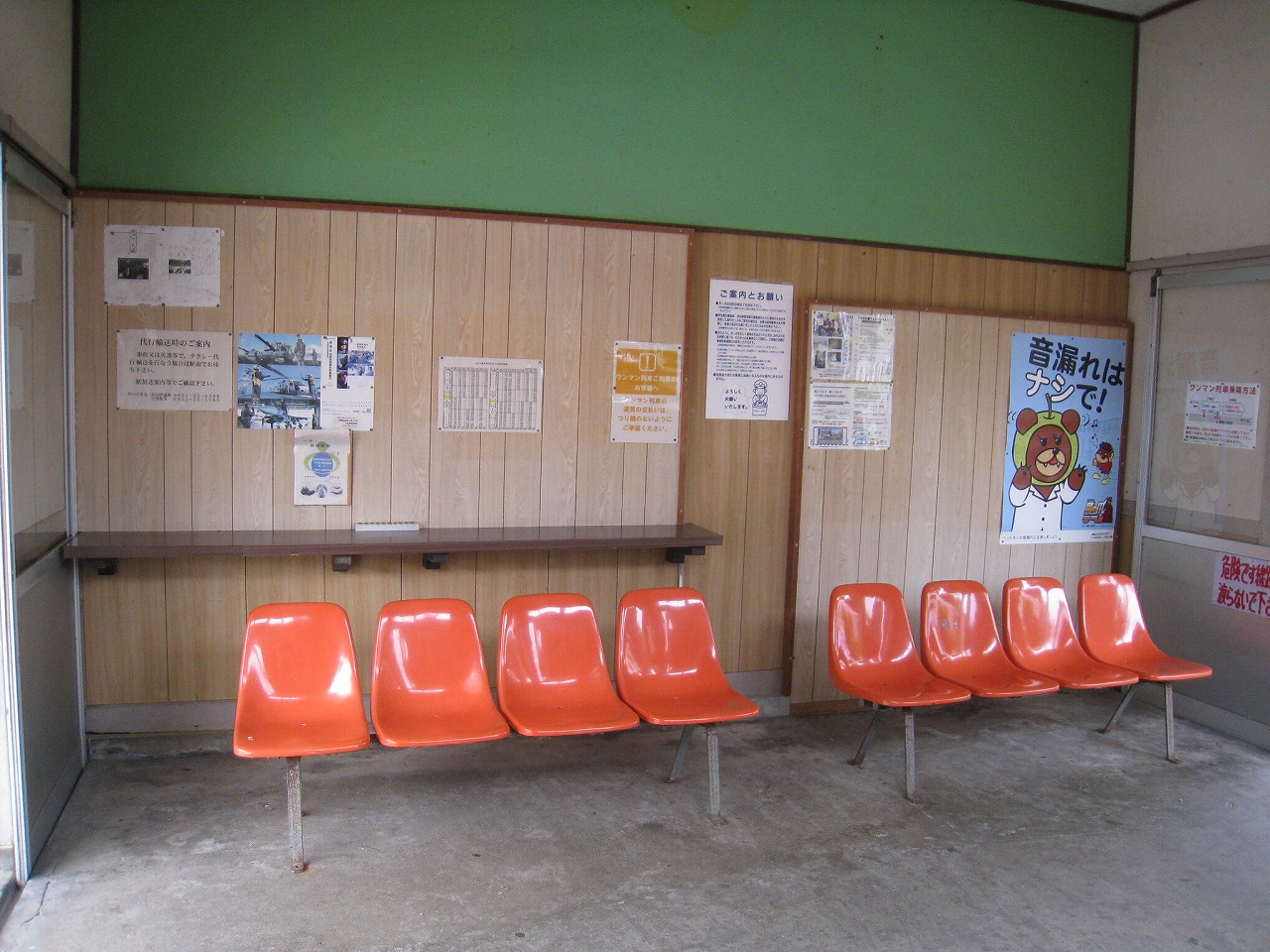 早く車内に入りたかった。ともかくもう暑くて…雲多めで日差しはないがそれでも室内は多少はマシだった。といっても開放型だから外とおんなじみたいなもんだけど… 据え付け長椅子もあり、新設トイレ、三江線には珍しく駅近に自販機があるので、やはりここは駅寝するにはよさそうだ。残念ながらここを起点に取ると最短で全駅来訪ができないのでその予定はないが…窓口は完全に壁と化していて、かつての駅舎内の面影はない。構内側の軒下からは転轍機操作室や電話番号表が見え、以前はここにも人が詰めていたのだなぁと思い耽る。夏は暑く、冬は積雪区間を管理、近くに店もない、メシはどうしていたのだろうと思うが、日の丸弁当ばかりだった中、なんとなし、たまたま料理好きな若手職員が入ってきて、駅務室の簡単な炊事場で親子丼などを作りはじめるや、好評となり定着となるも、しだいになんでおれがこんなことをと"シェフ"の不満が鬱積、ヴェテランが「いやぁ、なんだ、君にはちゃんと仕事も教えとる。しかし教えるたって、教えられりゃ誰でもできることさね、んなに気負うことはねぇ。けど、料理はそうとも限らん。最近は民営化の話もある、ここがダメになっても、お前はなんとかなるじゃねぇか」と諭して駄賃も出し、飯場担当を続ける、そんな物語が思い浮かんだ。