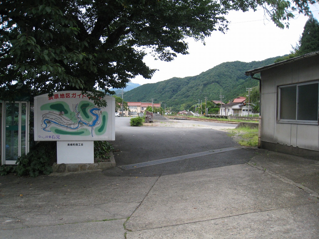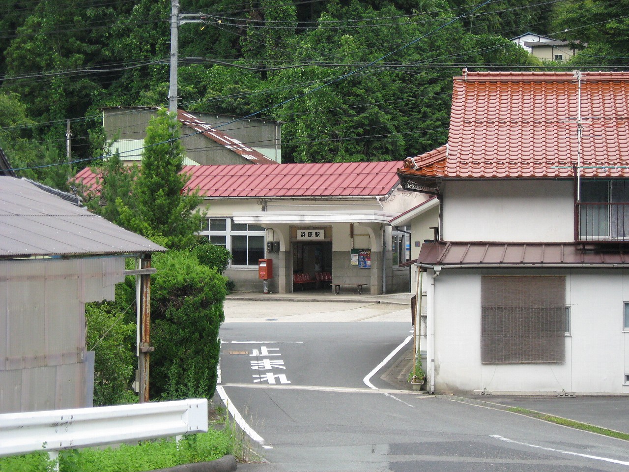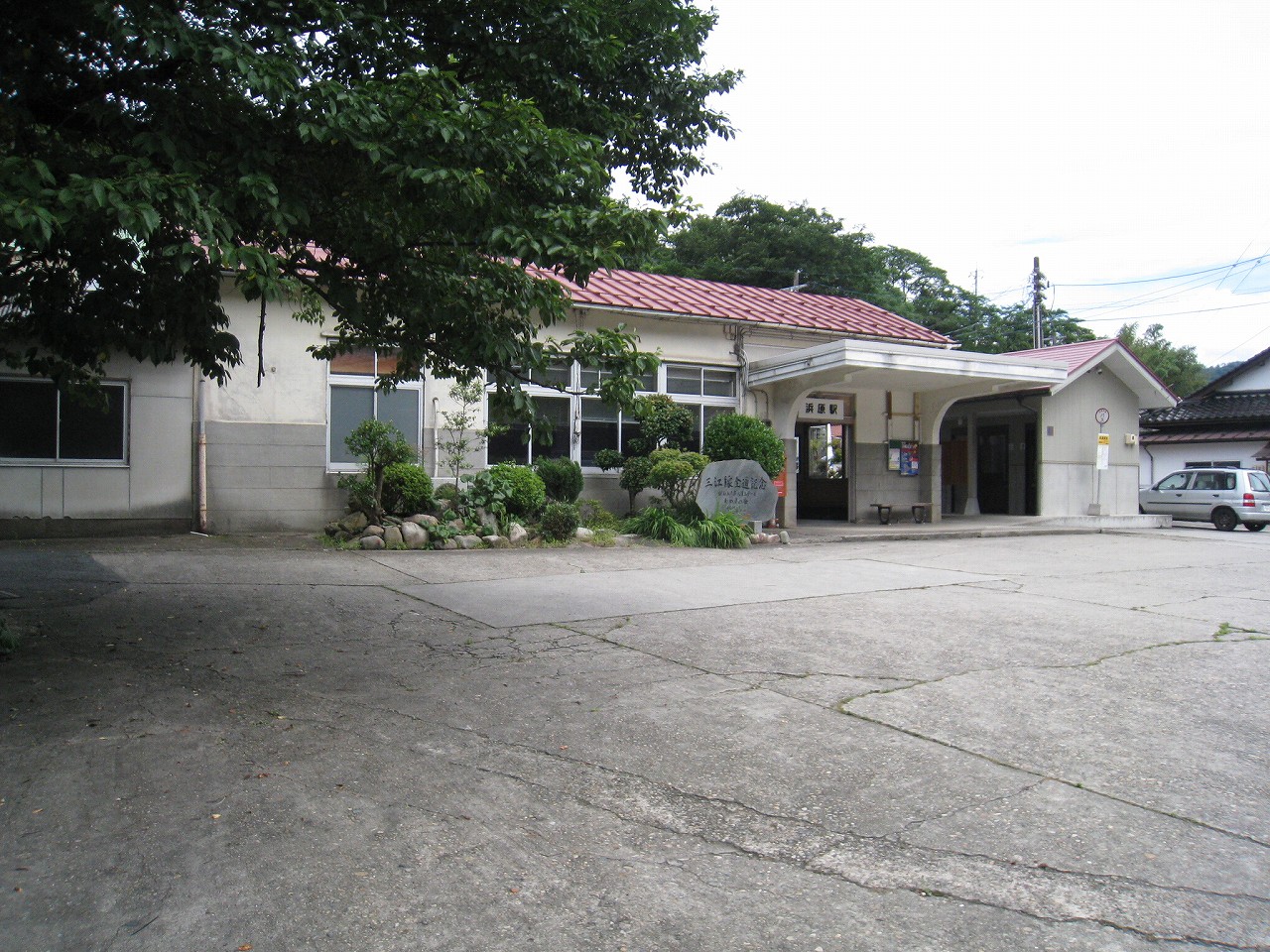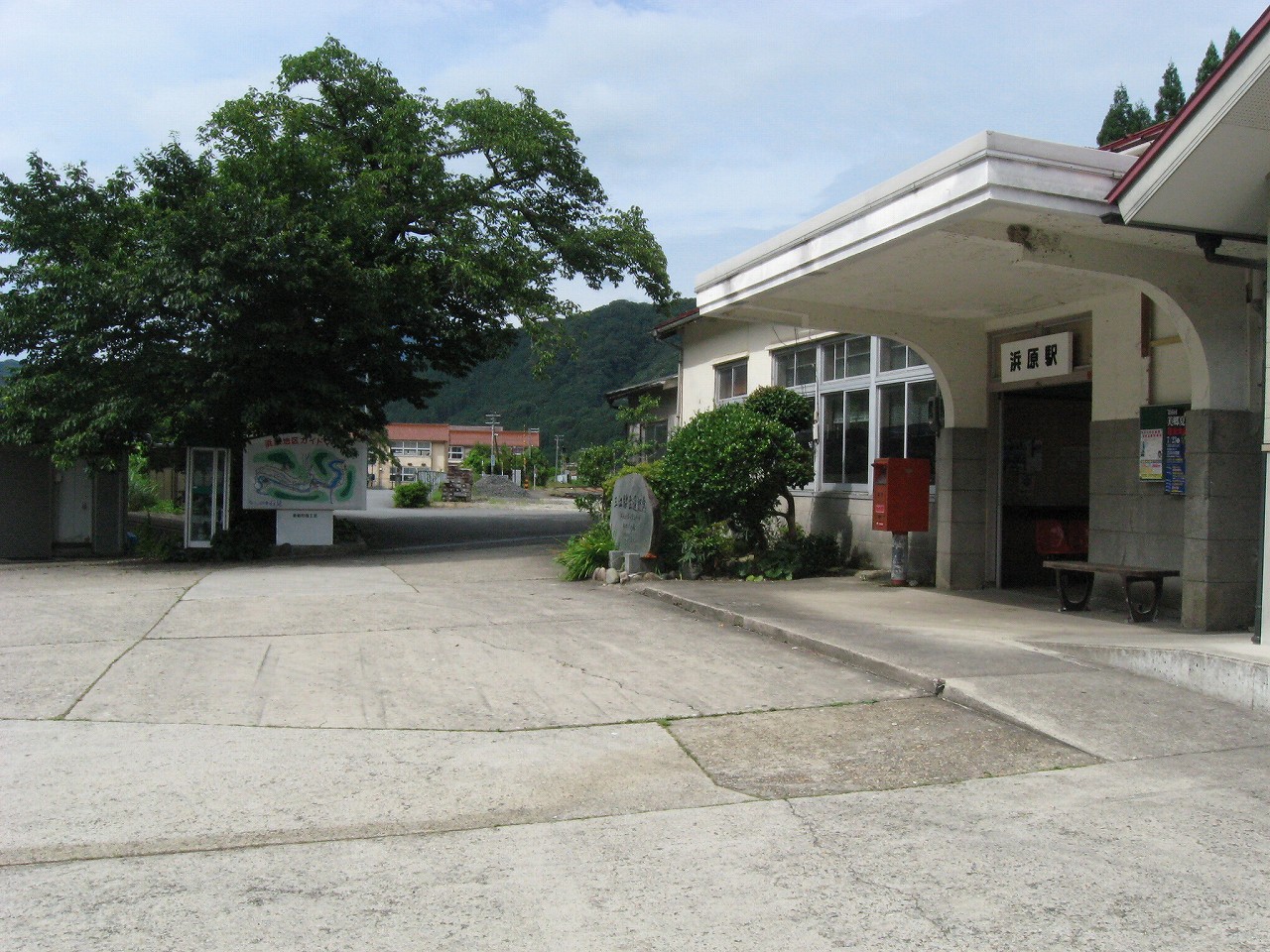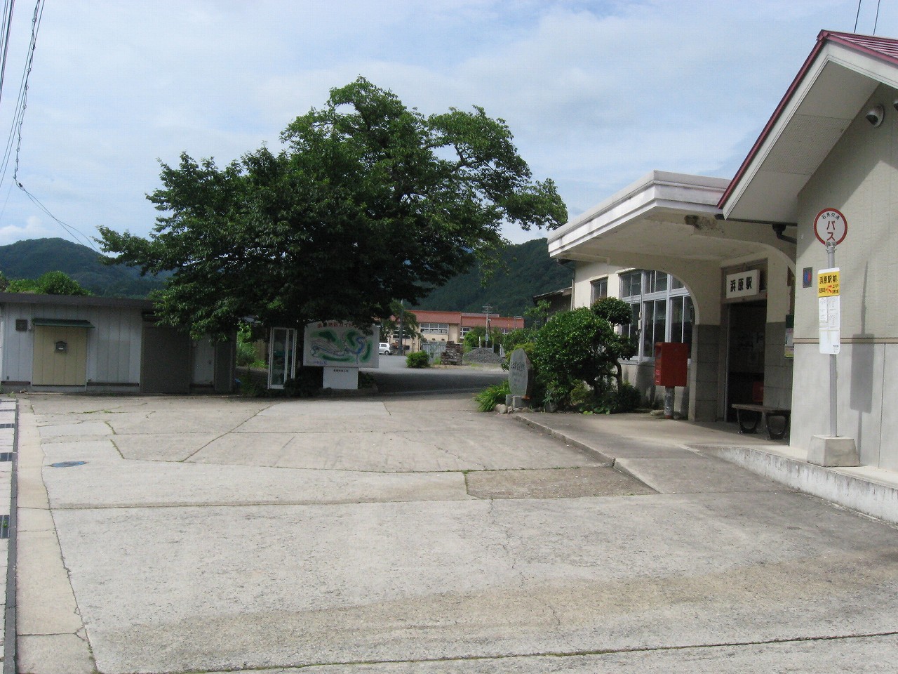 駅から出るとコンクリ敷きが迎えるが、すぐ民家と橋で、どうも本来的にはここはほかの無人駅とあんまり変わらない立地なのかもしれない。それでも浜原本町というように、旧い街道沿いの町もあるので、やはり格としては上がってくるのだろう。それが証拠にか、駅舎は立派なコンクリの庇の付いたもので、この水運のなせる山里の町に、近代化の威容と文化の侵入を感じさせるものだった。