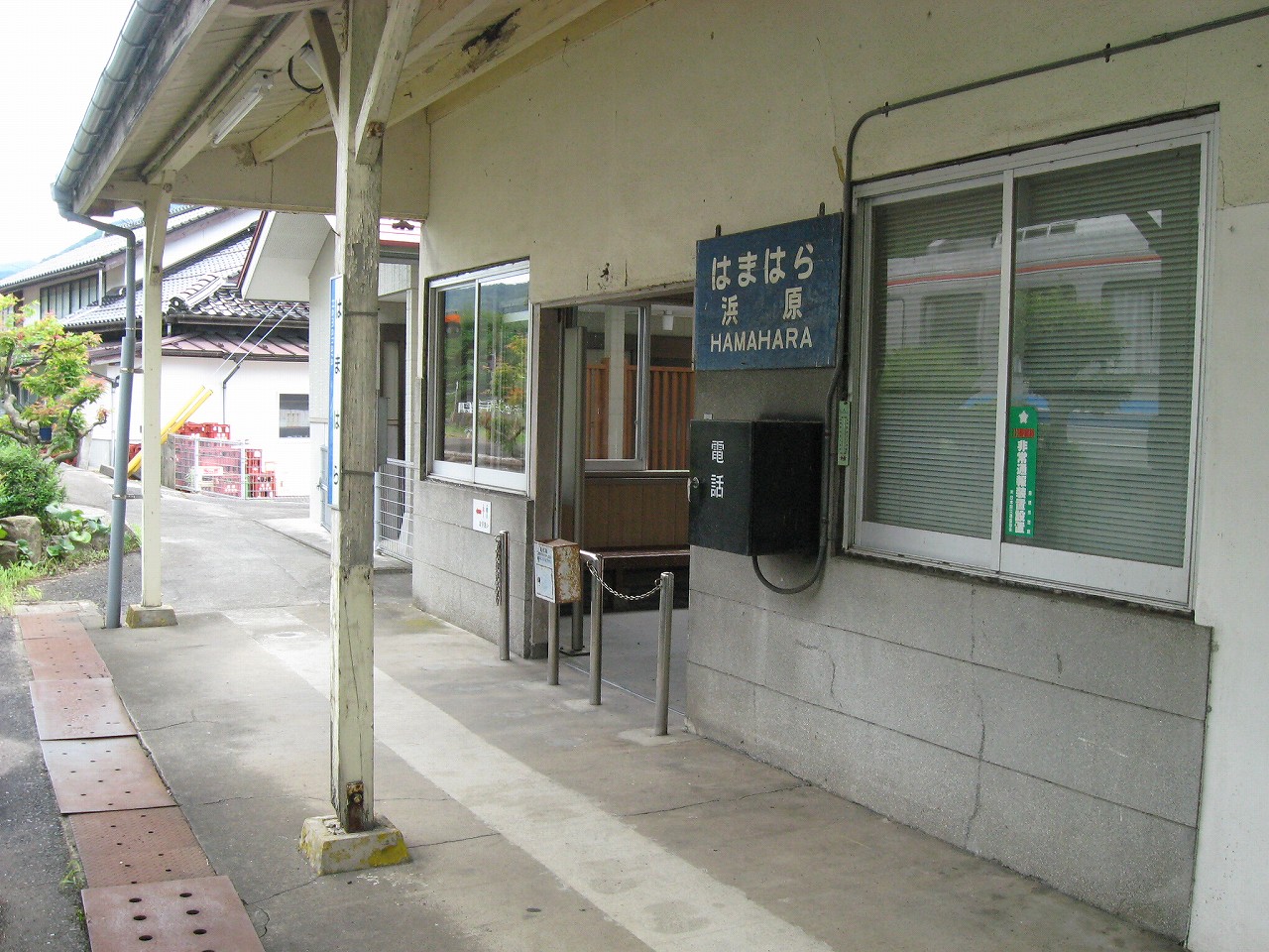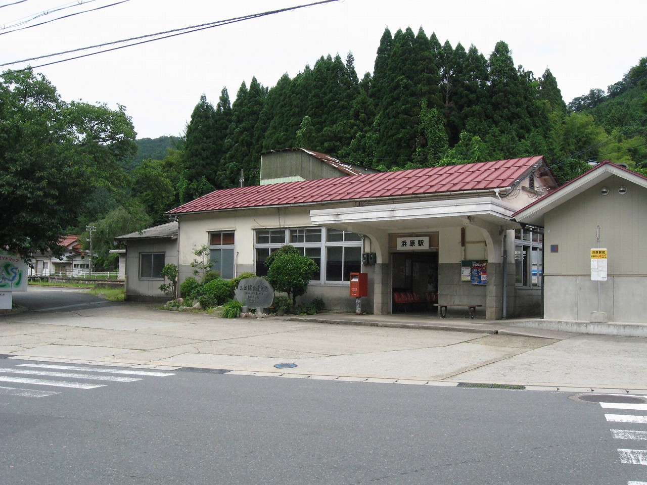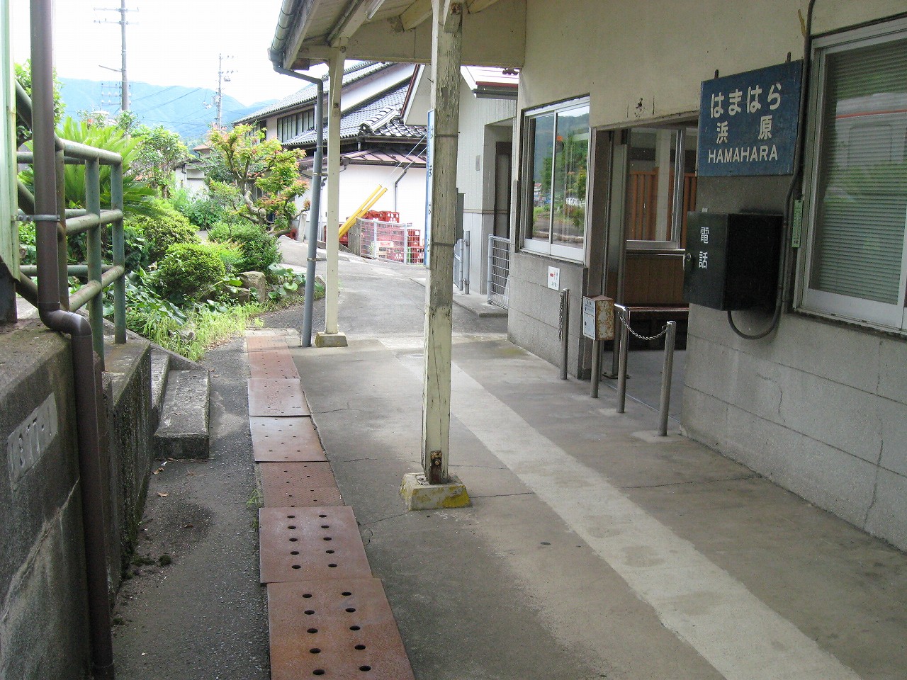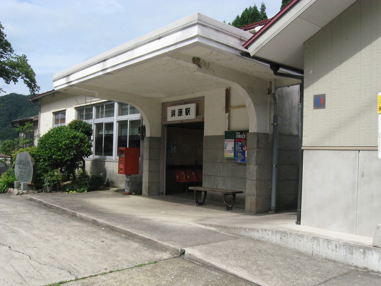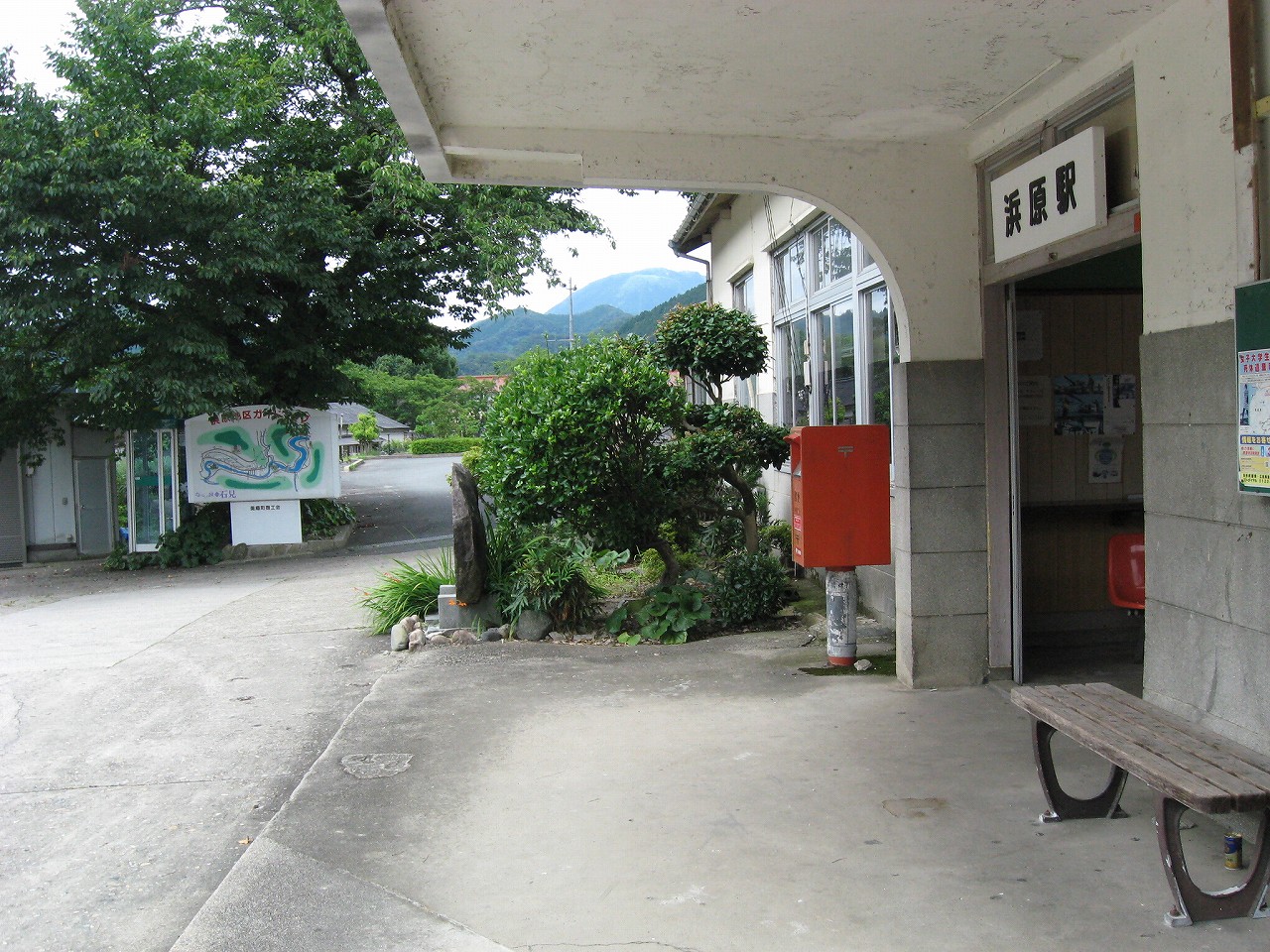 駅から出るとコンクリ敷きが迎えるが、すぐ民家と橋で、どうも本来的にはここはほかの無人駅とあんまり変わらない立地なのかもしれない。それでも浜原本町というように、旧い街道沿いの町もあるので、やはり格としては上がってくるのだろう。それが証拠にか、駅舎は立派なコンクリの庇の付いたもので、この水運のなせる山里の町に、近代化の威容と文化の侵入を感じさせるものだった。