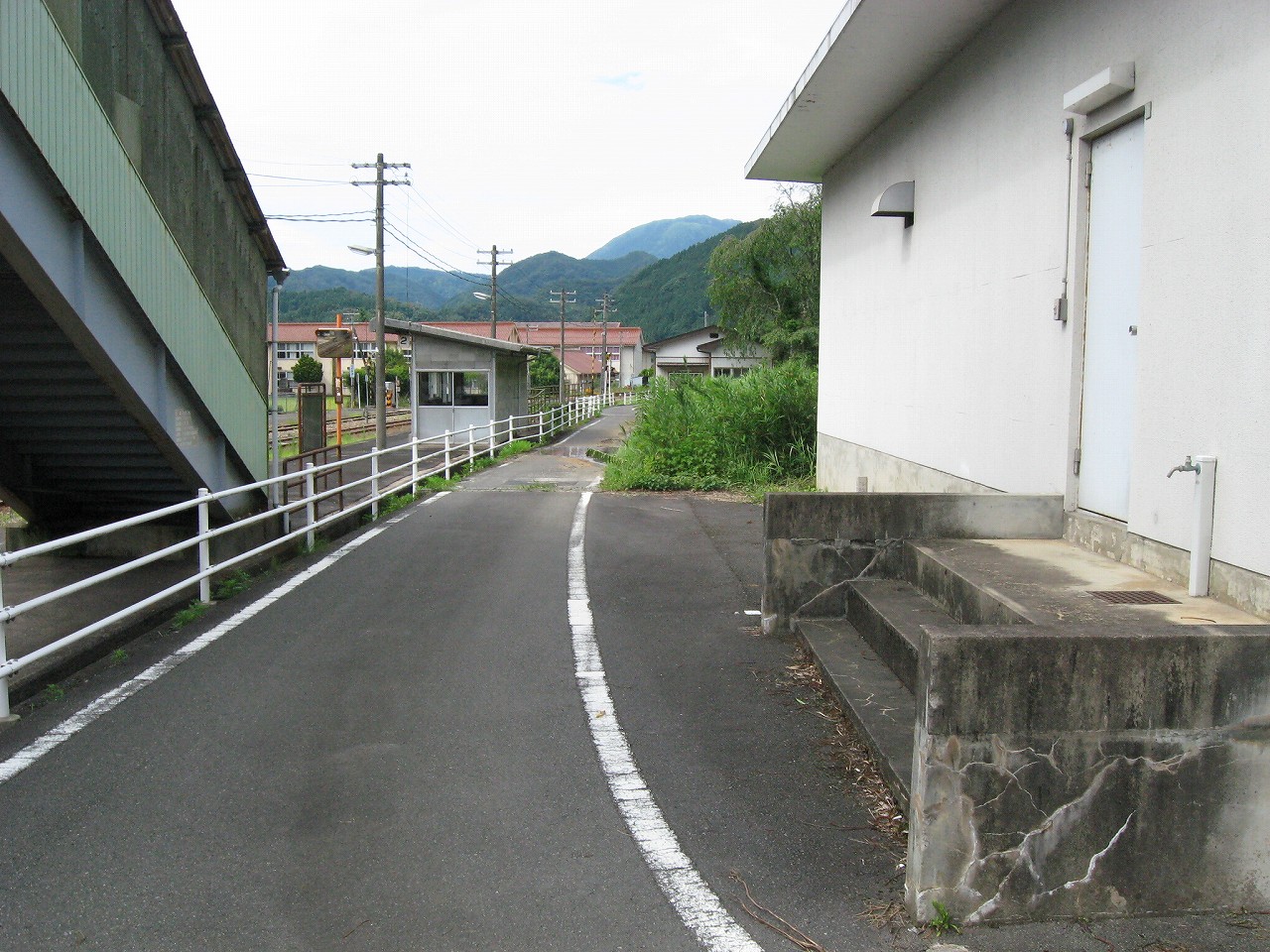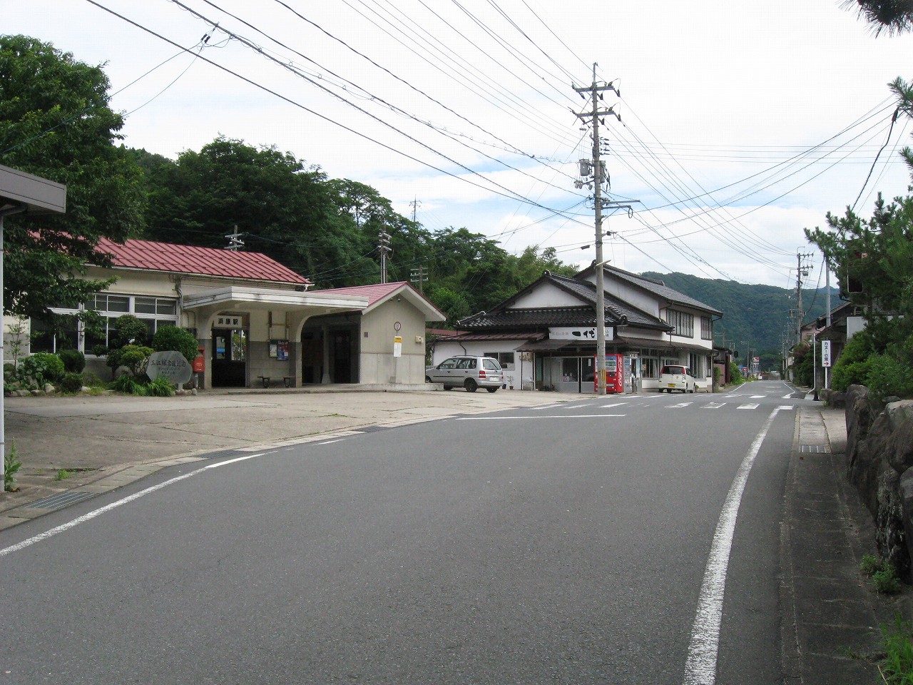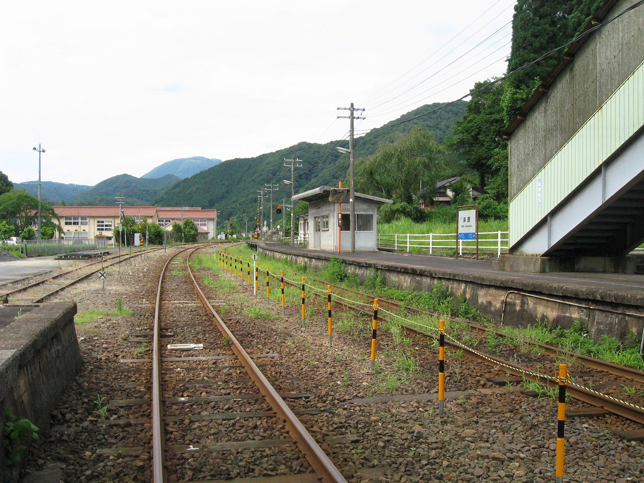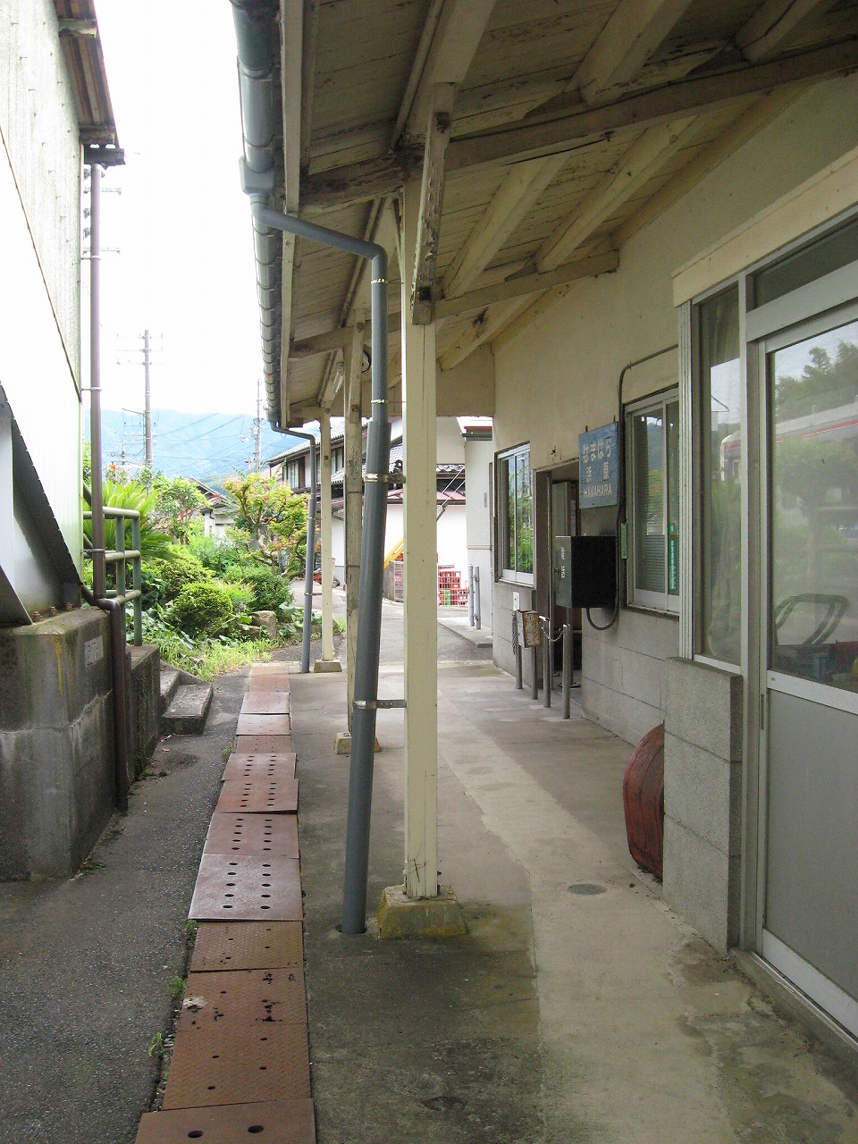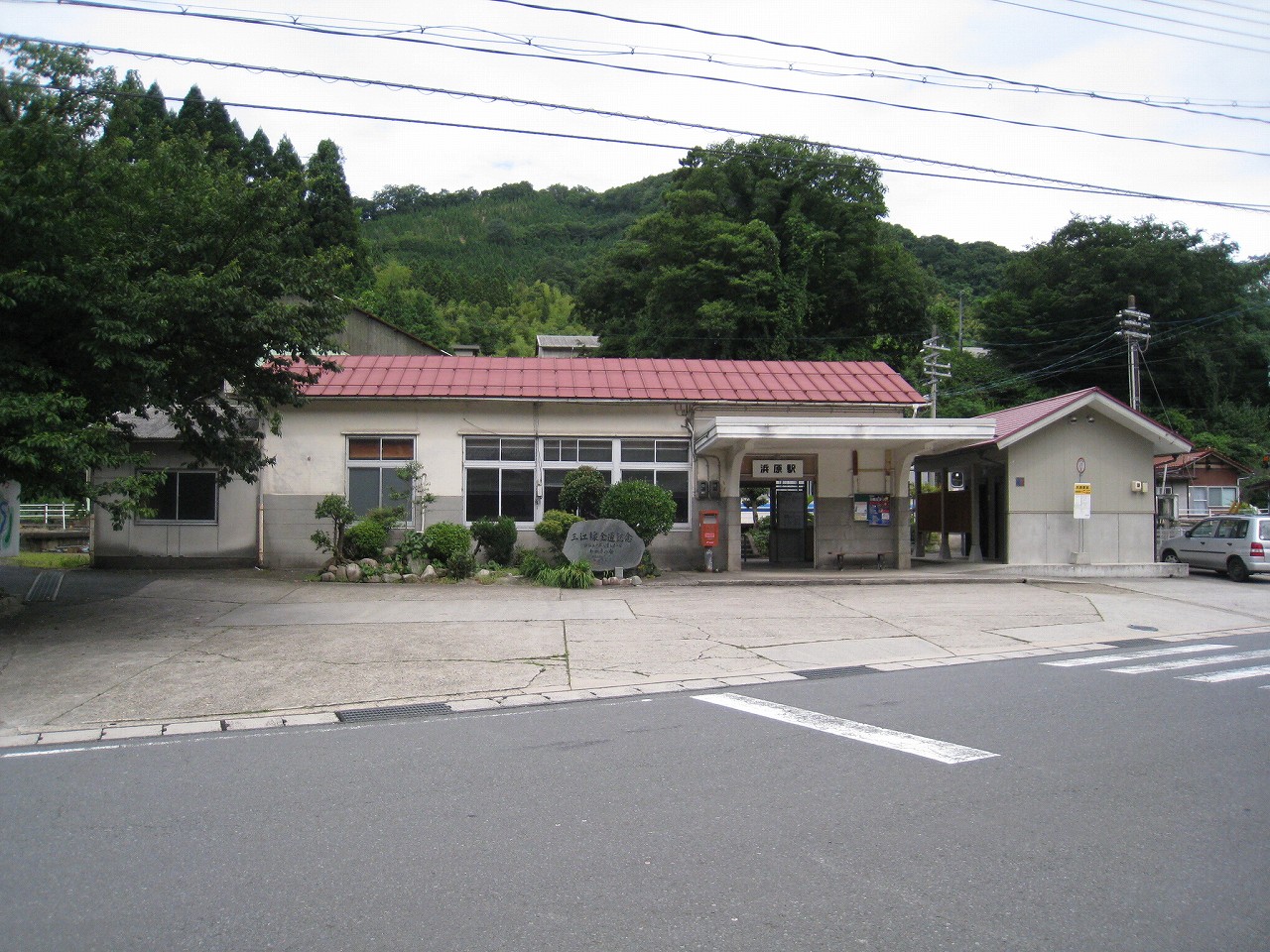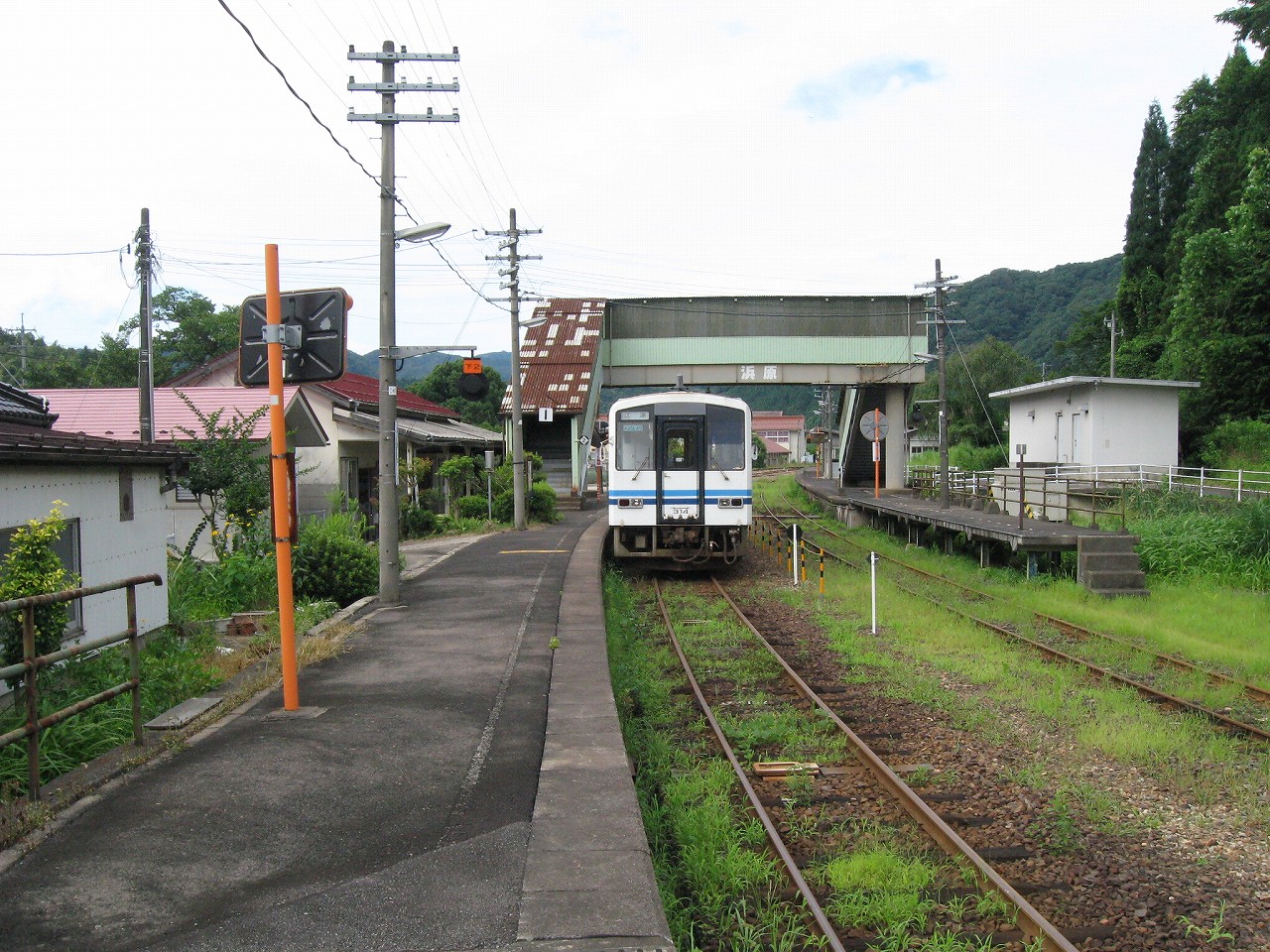 駅から出るとコンクリ敷きが迎えるが、すぐ民家と橋で、どうも本来的にはここはほかの無人駅とあんまり変わらない立地なのかもしれない。それでも浜原本町というように、旧い街道沿いの町もあるので、やはり格としては上がってくるのだろう。それが証拠にか、駅舎は立派なコンクリの庇の付いたもので、この水運のなせる山里の町に、近代化の威容と文化の侵入を感じさせるものだった。