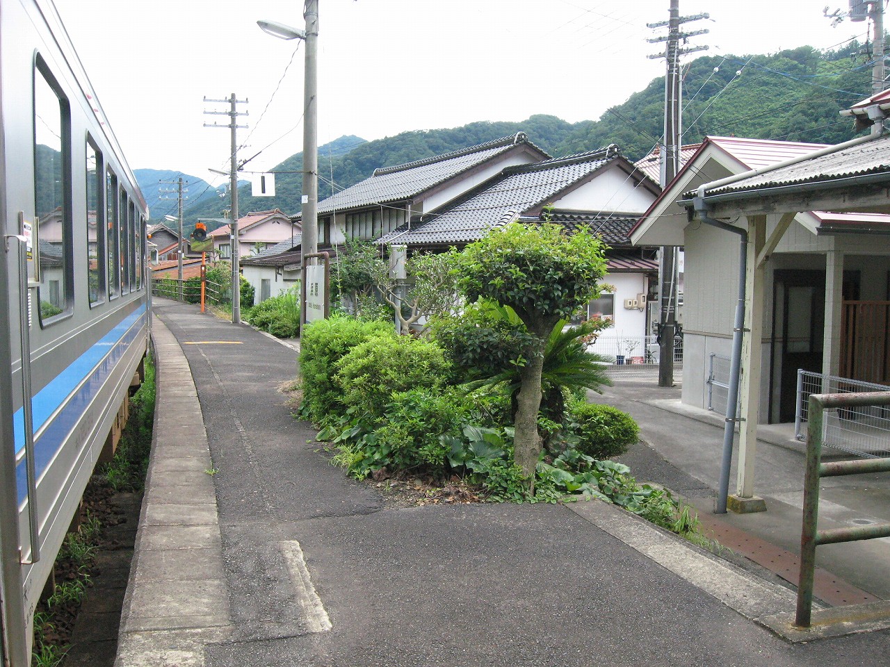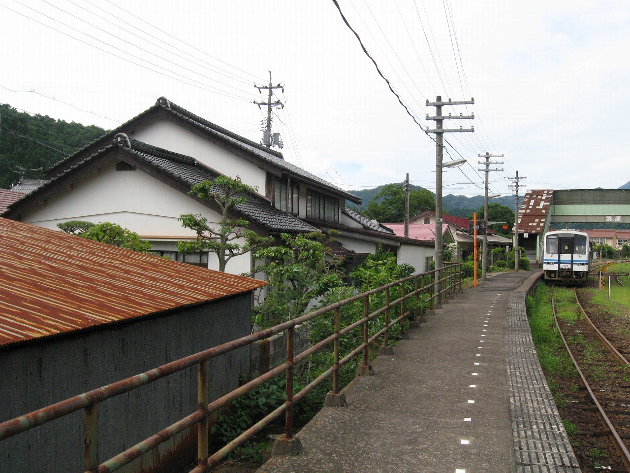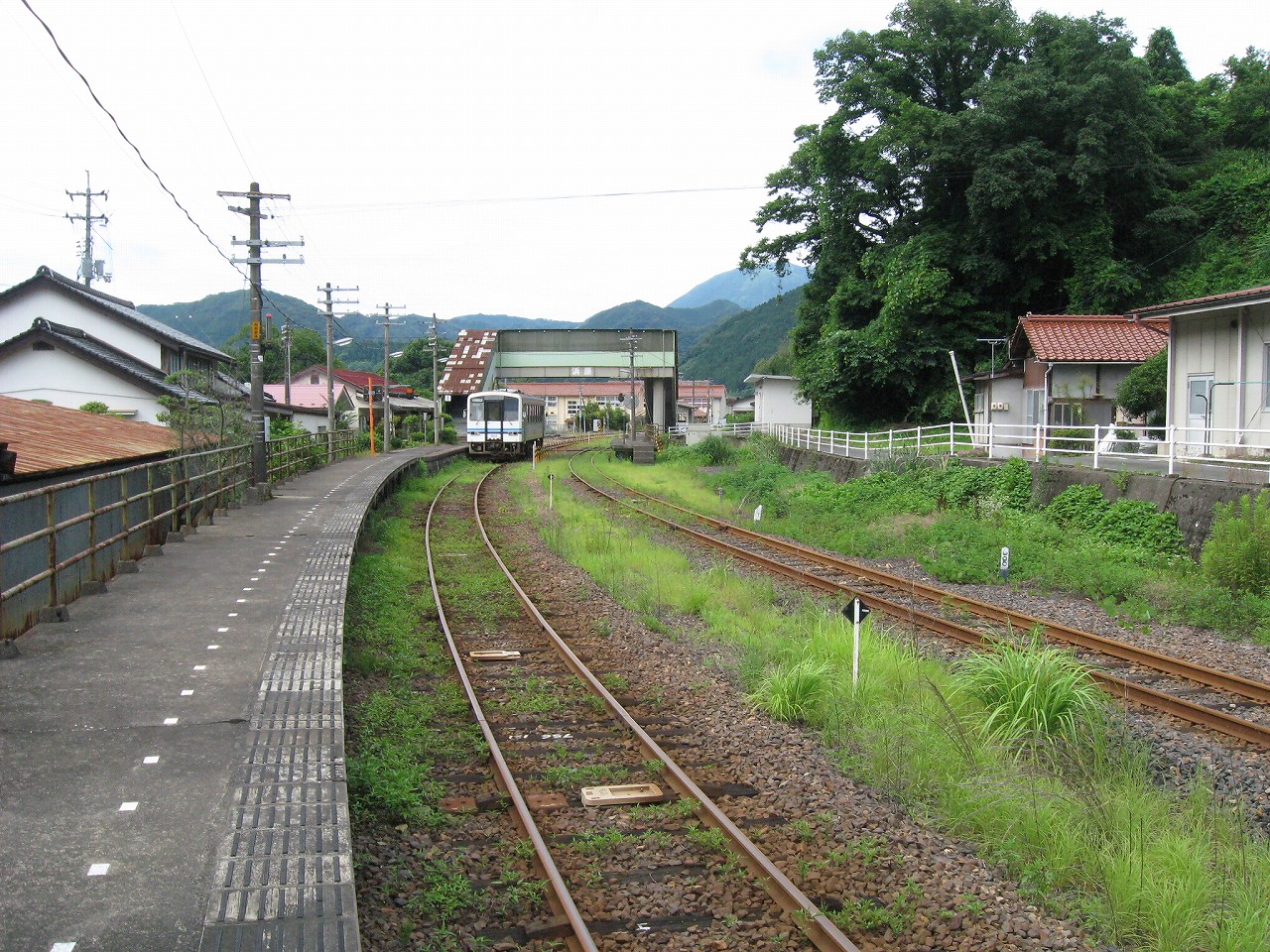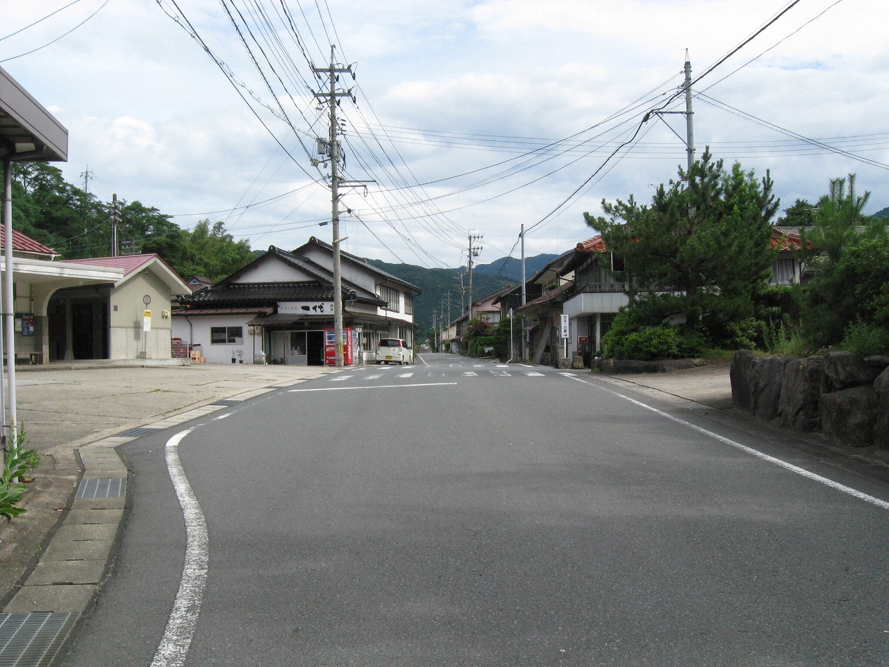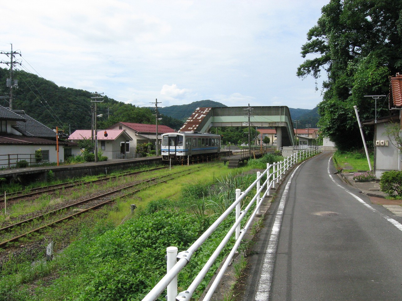 駅から出るとコンクリ敷きが迎えるが、すぐ民家と橋で、どうも本来的にはここはほかの無人駅とあんまり変わらない立地なのかもしれない。それでも浜原本町というように、旧い街道沿いの町もあるので、やはり格としては上がってくるのだろう。それが証拠にか、駅舎は立派なコンクリの庇の付いたもので、この水運のなせる山里の町に、近代化の威容と文化の侵入を感じさせるものだった。