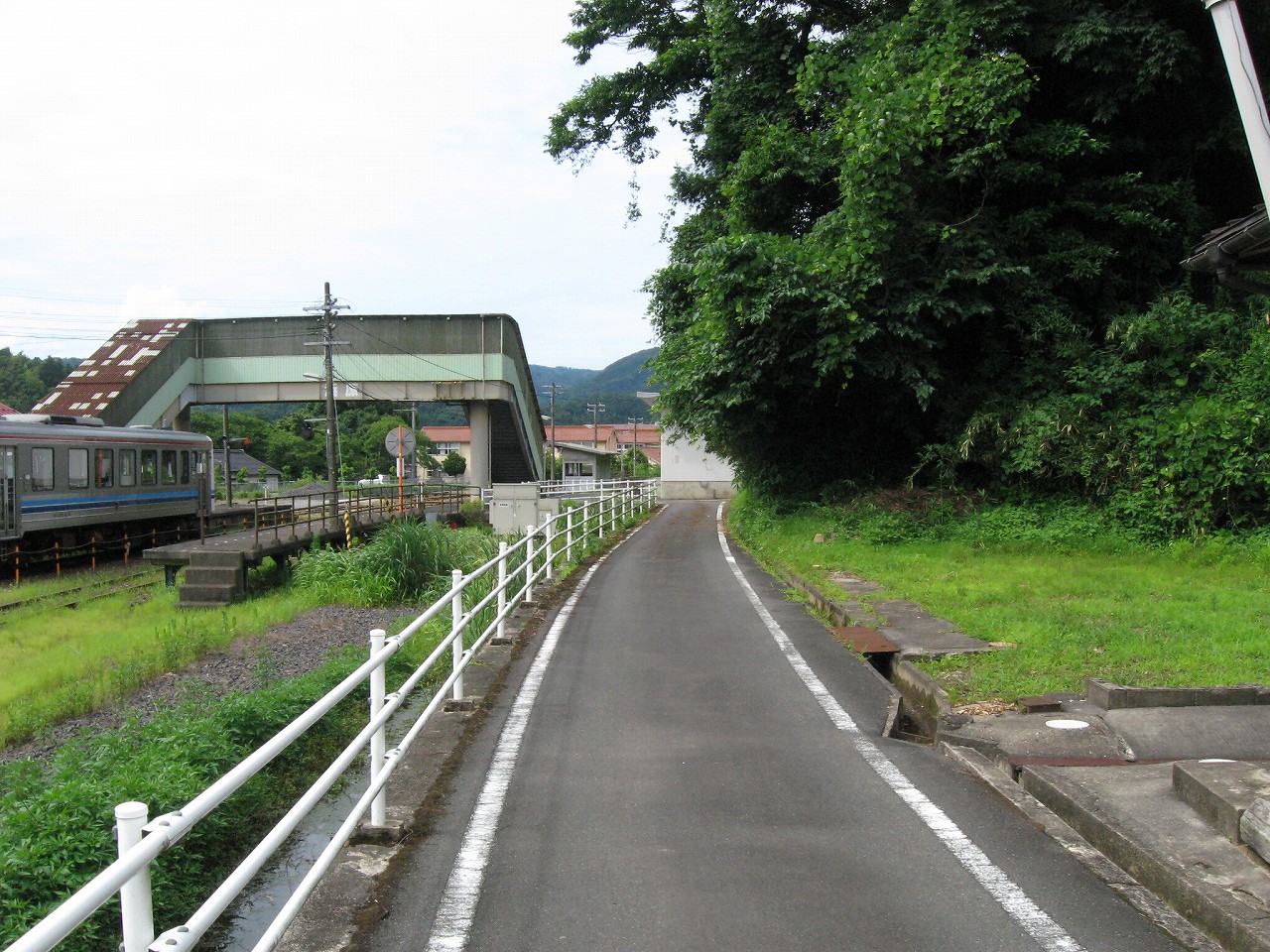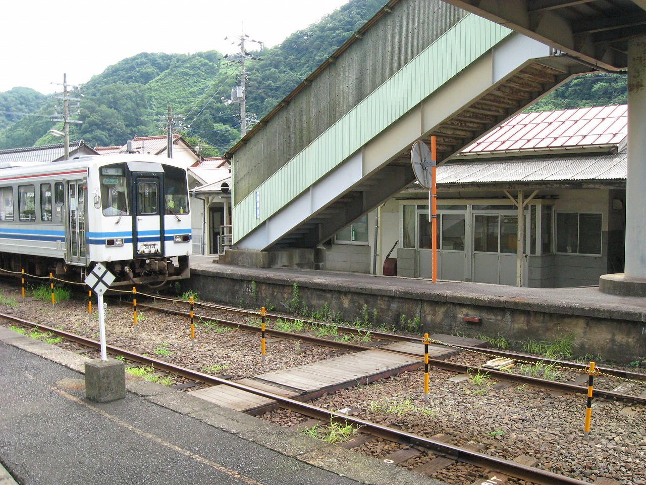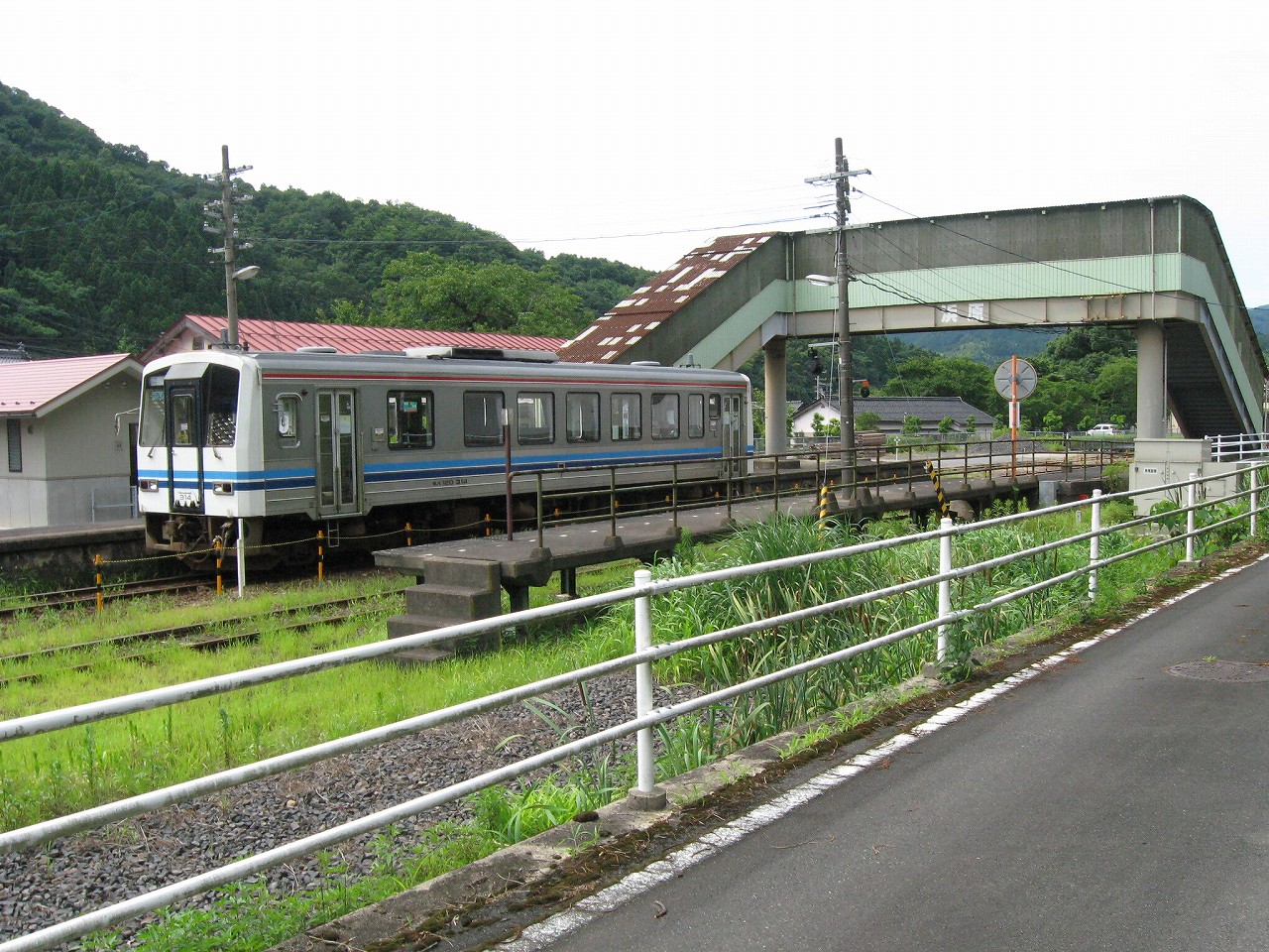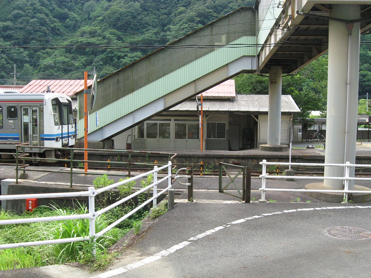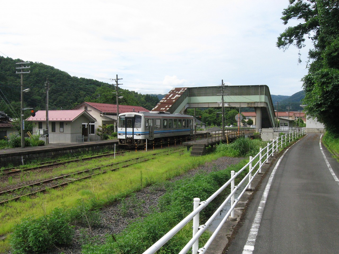 駅舎内はおいておいて、いったん構内に戻って全貌を捉えると、ちょっとは思ってた駅とは違うな、と。もっとこう、ひと気があるほうかと思っていたのだが、全体的に放置気味で、跨線橋も錆び錆びである。当然無人駅だし、ここまで来た運転士も車内で寝てるだけである。エンジン駆動だし、もはやバスみたいな感じだ。が、これは鉄道も持てるポテンシャルをまったく生かせていないということなのだろう。こんなところ企画列車が走ったら、チケットは取れなくなるだろう。災害の度にこれまで自治体の甚大なる助成があり、そして再びこんなところに鉄路を通すことは絶えてないということをアピールすれば、貴重な体験と受け取られるはずだ。生かされることなく葬られている草生した路線を見ていると、何かこの国の未来が占えるようで気分が暗然とした。いま自分にできるのは…この猛暑の空気を相手に、両手に持ったダガーナイフで切り裂く練習を積むことだけだ。