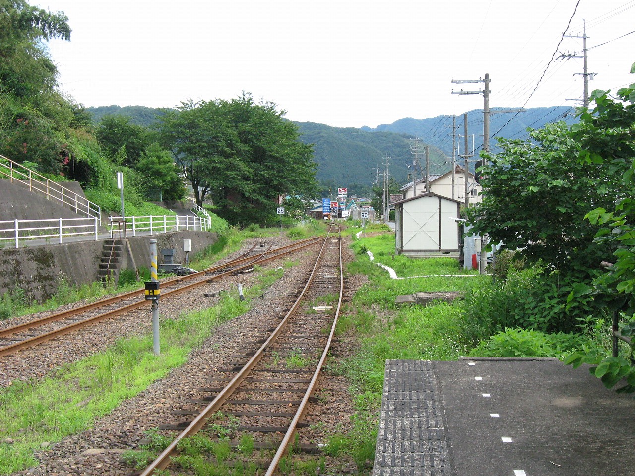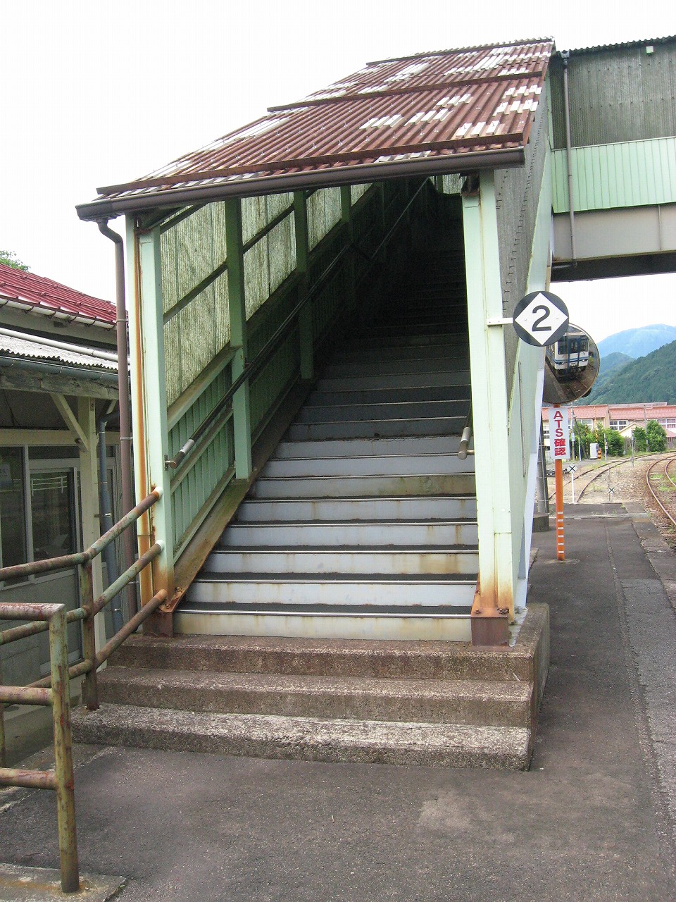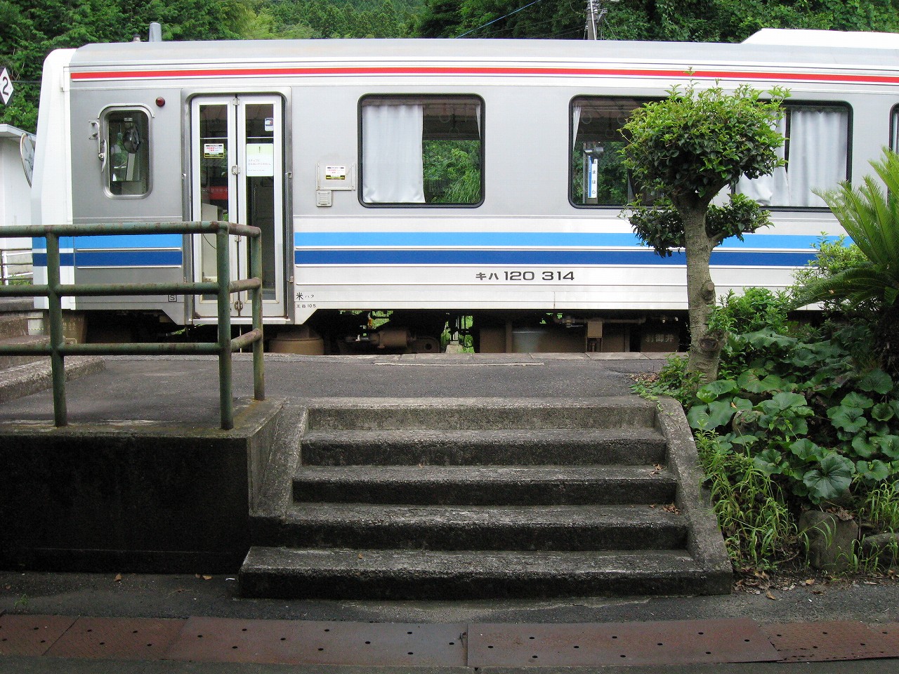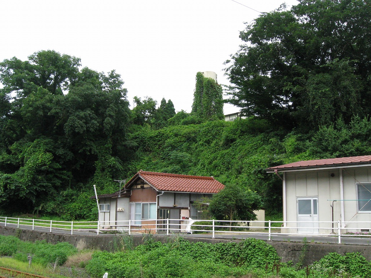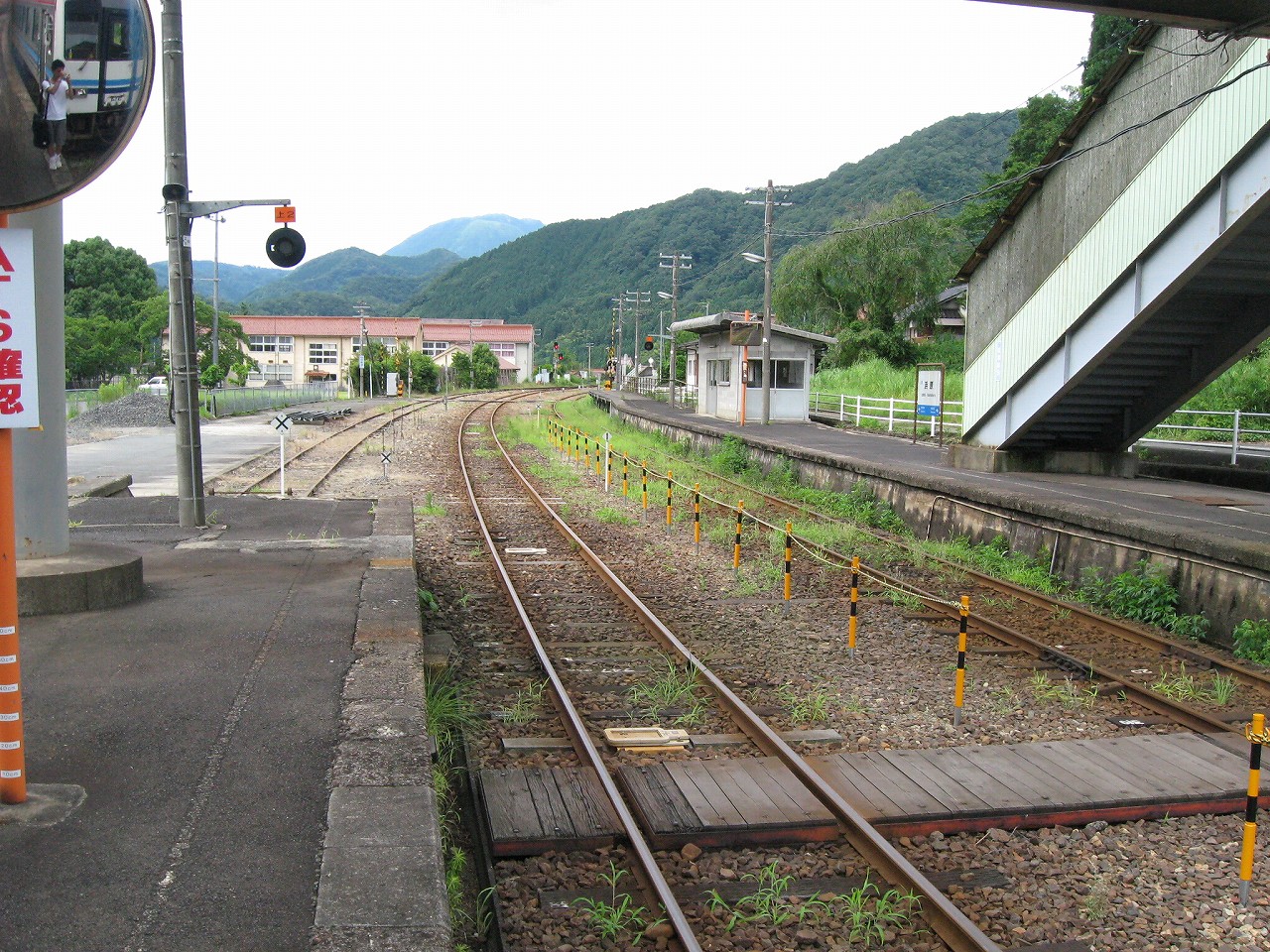 駅舎内はおいておいて、いったん構内に戻って全貌を捉えると、ちょっとは思ってた駅とは違うな、と。もっとこう、ひと気があるほうかと思っていたのだが、全体的に放置気味で、跨線橋も錆び錆びである。当然無人駅だし、ここまで来た運転士も車内で寝てるだけである。エンジン駆動だし、もはやバスみたいな感じだ。が、これは鉄道も持てるポテンシャルをまったく生かせていないということなのだろう。こんなところ企画列車が走ったら、チケットは取れなくなるだろう。災害の度にこれまで自治体の甚大なる助成があり、そして再びこんなところに鉄路を通すことは絶えてないということをアピールすれば、貴重な体験と受け取られるはずだ。生かされることなく葬られている草生した路線を見ていると、何かこの国の未来が占えるようで気分が暗然とした。いま自分にできるのは…この猛暑の空気を相手に、両手に持ったダガーナイフで切り裂く練習を積むことだけだ。