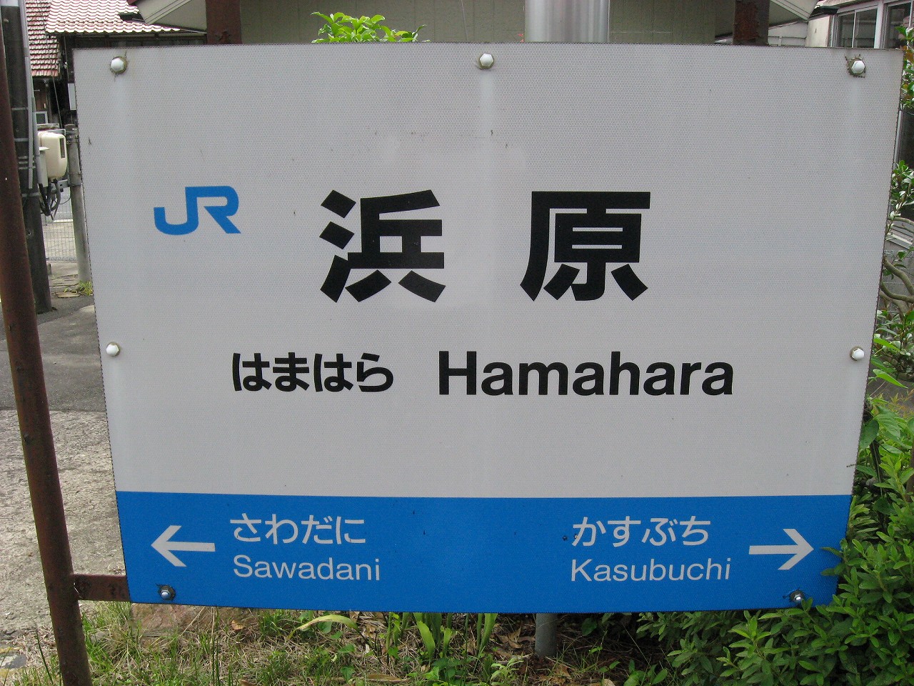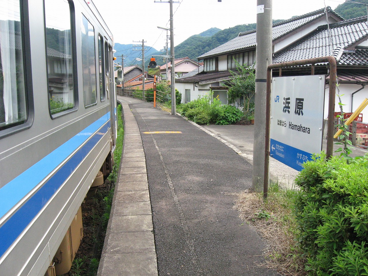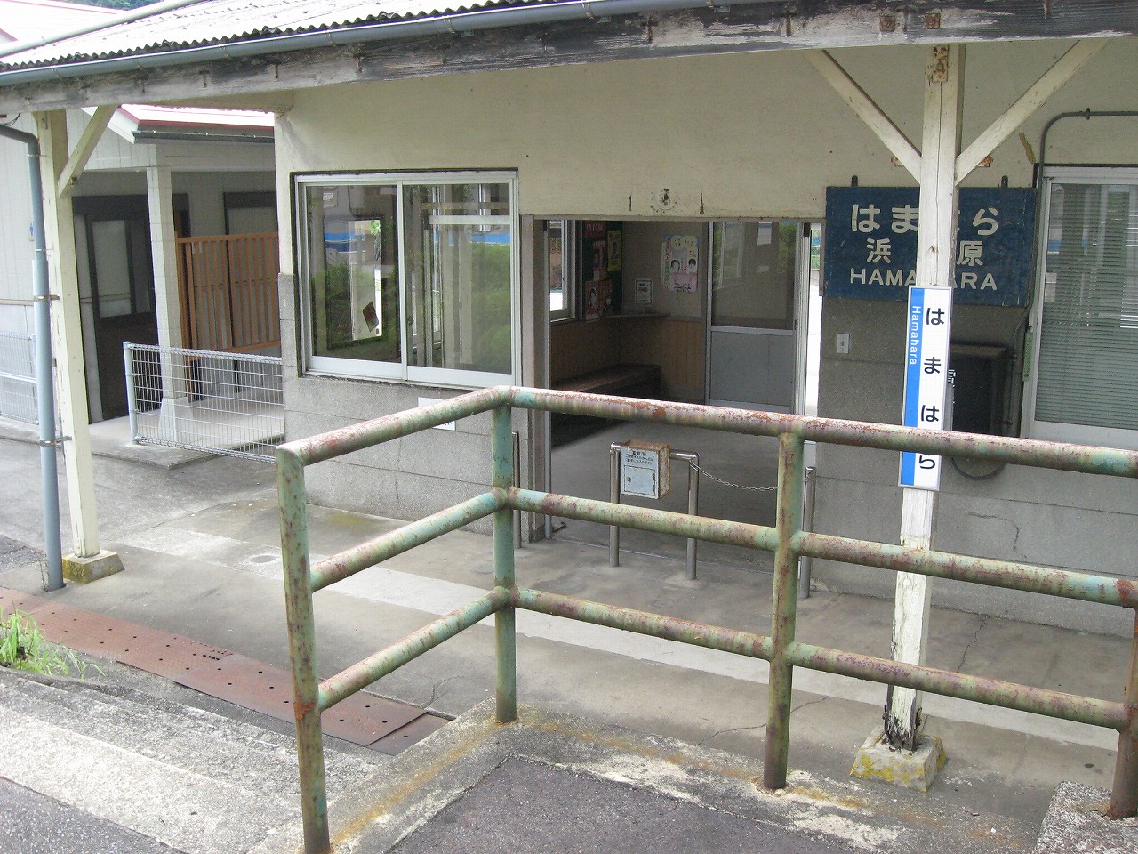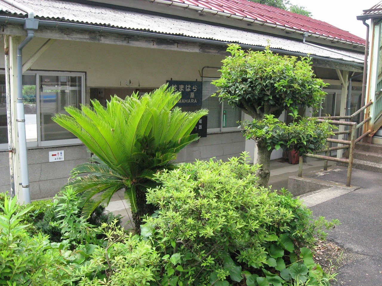 三江線沿線はもとい、山の中にはときどき海辺みたいな地名があるが、ここもそのうちの一つ。むろん この江の川の偉大なる屈曲部における砂州のことを指すというのは、おのずと想像されるものである。 構内は当然交換駅だが、草生して、蝉の方がうるさかった。汗で体が焼けるように熱い。少々曇っているのになんでこんな暑いんだと思った。とりあえず駅舎側の道路見たら自販機が見えて、貸す分確保可能が確定し胸をなでおろした。二時間待ちで飲み物なかったら辛い。まぁ浜原は歩いたらさすがに自販機くらいはありそうだが… 白線の構内を夕方前のしじまに歩き、駅舎へいったんと向かう。伸びたソテツの葉に膚を切られつつも、青い駅表札に誘い出されたのだ。「はまはら」のその文字だけでも、何か汽笛が聞こえてきそうだ。