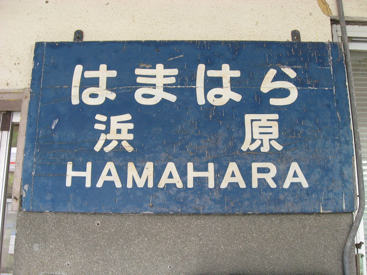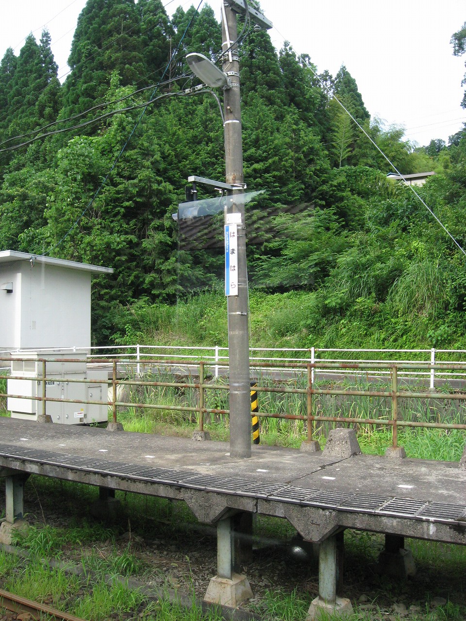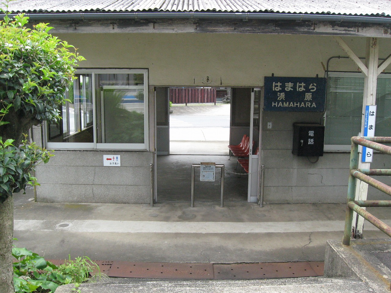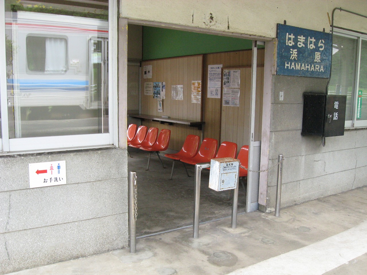 三江線沿線はもとい、山の中にはときどき海辺みたいな地名があるが、ここもそのうちの一つ。むろん この江の川の偉大なる屈曲部における砂州のことを指すというのは、おのずと想像されるものである。 構内は当然交換駅だが、草生して、蝉の方がうるさかった。汗で体が焼けるように熱い。少々曇っているのになんでこんな暑いんだと思った。とりあえず駅舎側の道路見たら自販機が見えて、貸す分確保可能が確定し胸をなでおろした。二時間待ちで飲み物なかったら辛い。まぁ浜原は歩いたらさすがに自販機くらいはありそうだが… 白線の構内を夕方前のしじまに歩き、駅舎へいったんと向かう。伸びたソテツの葉に膚を切られつつも、青い駅表札に誘い出されたのだ。「はまはら」のその文字だけでも、何か汽笛が聞こえてきそうだ。