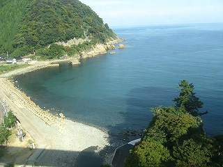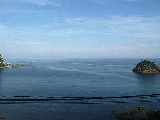 車窓からの香住海岸。左手に回って行くと鎧袖がある。右手の小島は