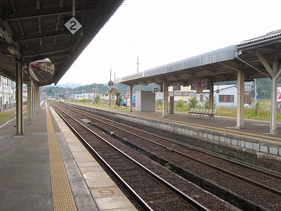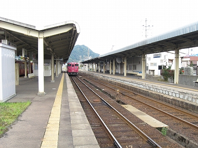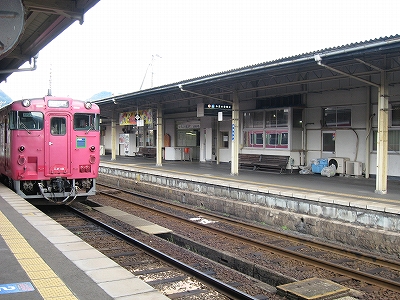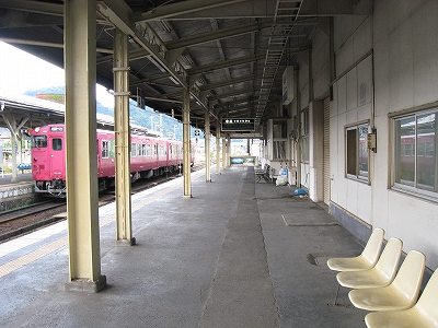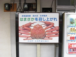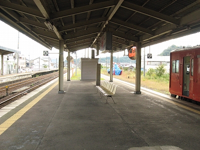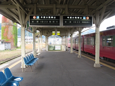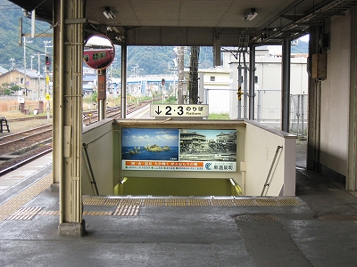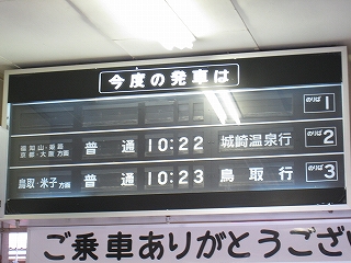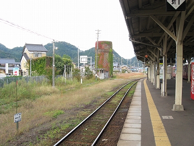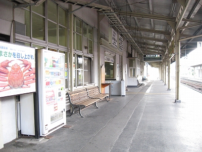 鳥取行きに接続しているからほとんどの人がいそいそと乗り換える。特に旅行者はそうで、地下道を通って改札まで行くのは地元らしい身なりの人だけだった。給水塔や蟹を描いた広告に、昔から凝り固まったように同じ営みの繰り返されてきた街に思われた。けれどもプラットホームからの風景としては、元 とある村落という様相で、旅情は乏しい。優遇される1番線のホームも高い屋根は埃っぽく、色合いはモノトーンで、改札口も2人分くらい、香住よりも狭かった。