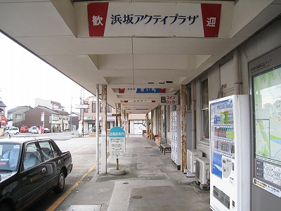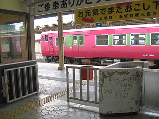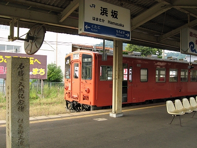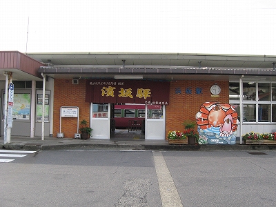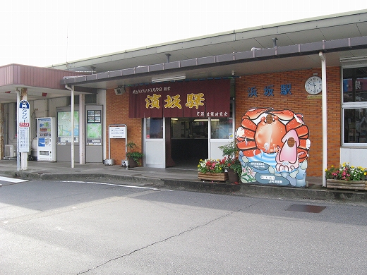 その地名に似つかわしく、狭い谷底平野を見下ろすようにしながら汽車は下っていく。そうなると、もうまもなく浜坂になる。平地が現れ、案内が流れると、大きな駅に着く気持ちがして来て、そわそわした。気動車は「はまさか。はまさかです。切符、運賃は駅の改札口にお渡しください」と放送を流しながらゆっくりと進み、転轍機で車体を揺らす。しかし降りてみるとこじんまりした駅だった。