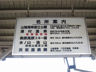 足湯の背は元貨物扱いのところだから、汽車発着は手に取るようにわかる。少しばかり肉声の放送も聞こえる。そろそろ上下とも発車時刻らしくて、少し向こう見えている例の暖簾に、方々からゆっくり歩いてくる町の人々が引き寄せられていく。気持ちを切り変えて足を拭いくつを履く。駅舎の軒下を歩いて行って、暖簾のところから中に入ると、すでに客らが列車を待ち、出札は数人並んでいた。売店でも車内での時間つぶしを目当てに、買い求める人がちらほらいる。発車はまだだが、列車が上下とも入り、「ご乗車ありがとうございました、はまさか、はまさかです」と駅員は改札しつつ音量を上げて流すと、降りてきた数人はほかの人を出し抜いて売店に来て、弁当やおにぎりを求めた。籠棚の中はすぐにまばらになった。