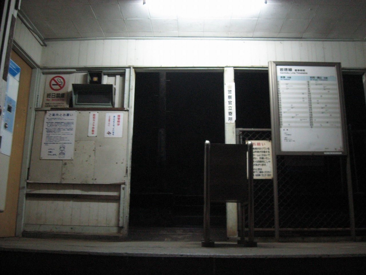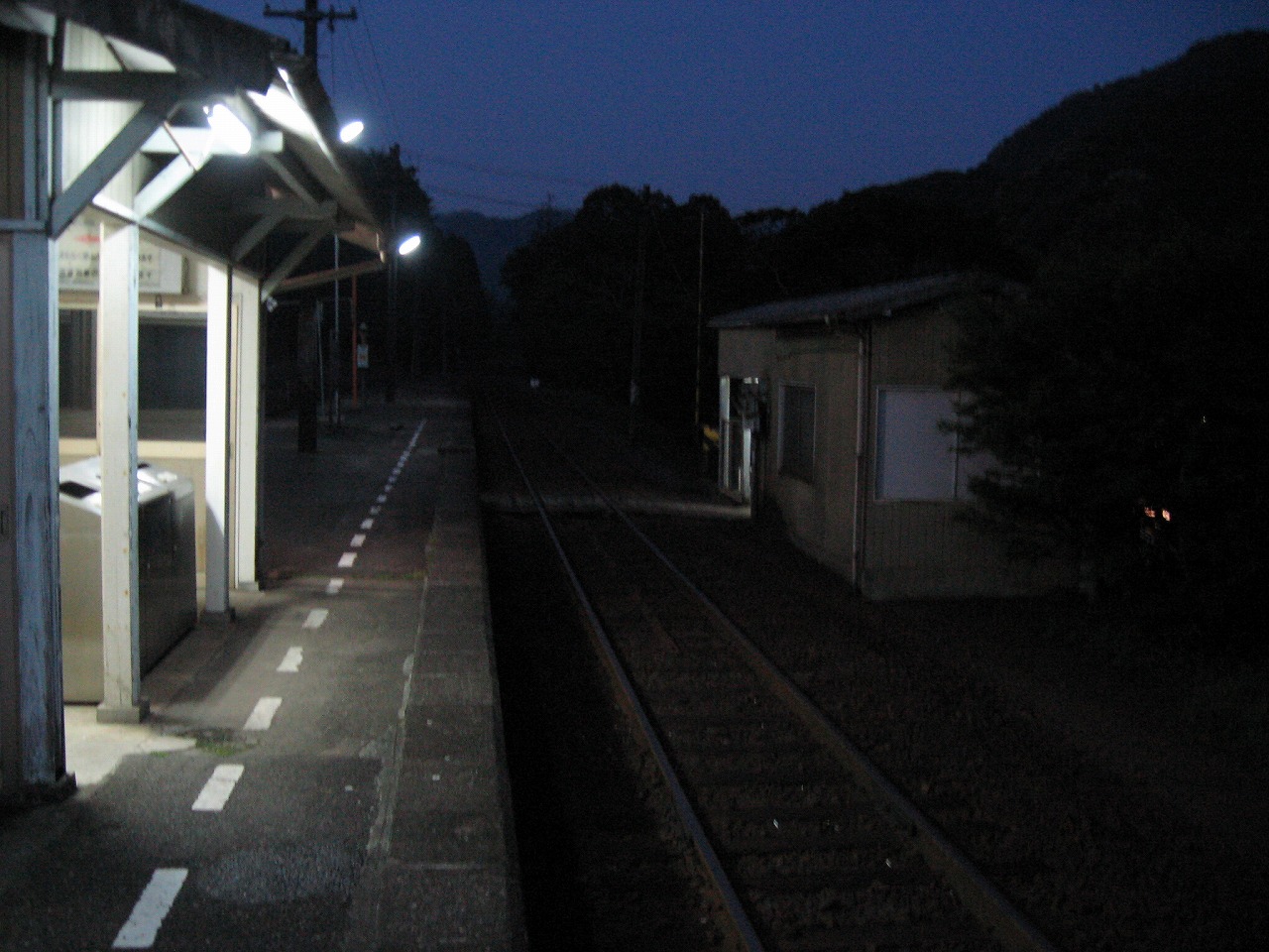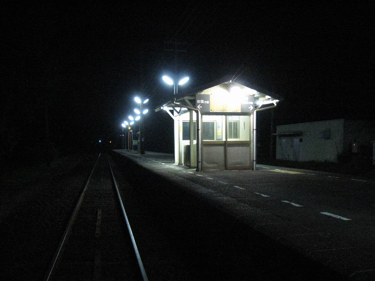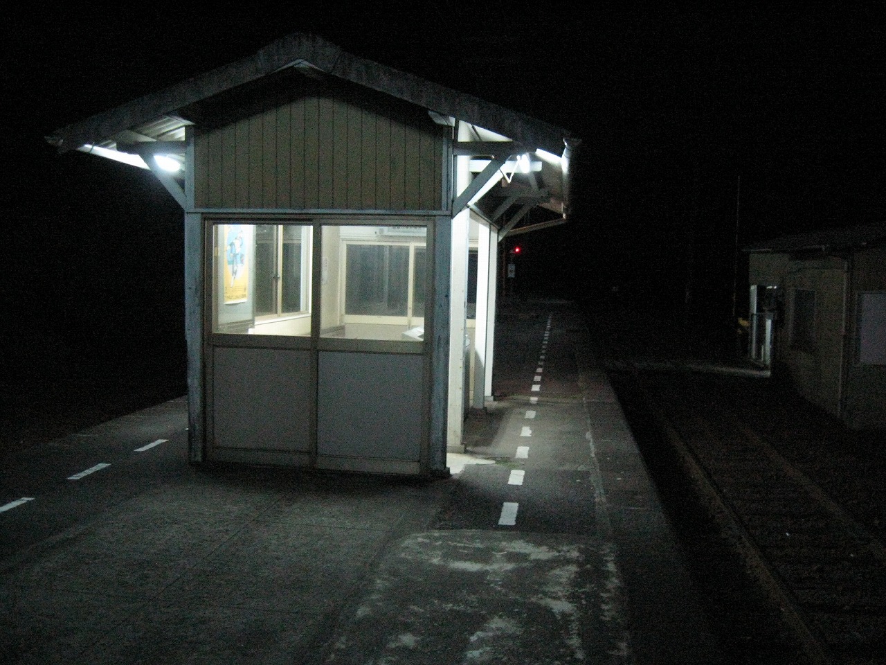 正直、降りるまでこんなに寂しい駅だとは思ってもみなかった。ホームはやや高台らしく、どうも盛り土の上のようだ。そして真っ暗な中、線路まで下りてレールを跨ぐと、屋根をまとった一本の階段が、タラップのように異界に闇に向かって脚を降ろしている。それはまるで神社の階段のようだった。 階段を降りるギリギリ手前のところに券売機などがあり駅舎の中みたいになっていた。寝るならそこで寝ろ、というような雰囲気だったが、椅子などは全くなかったので、ホームの待合室の方に椅子があってほんとによかったと思った。 それにしてもこの空間は狭苦しい。あわや階段を転げ落ちそうになるくらいだ。