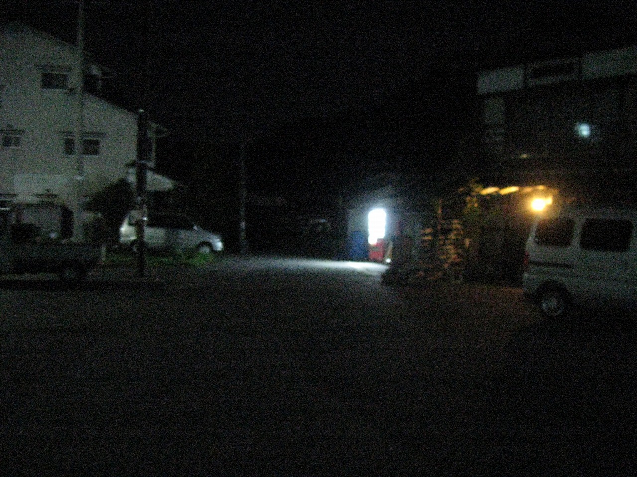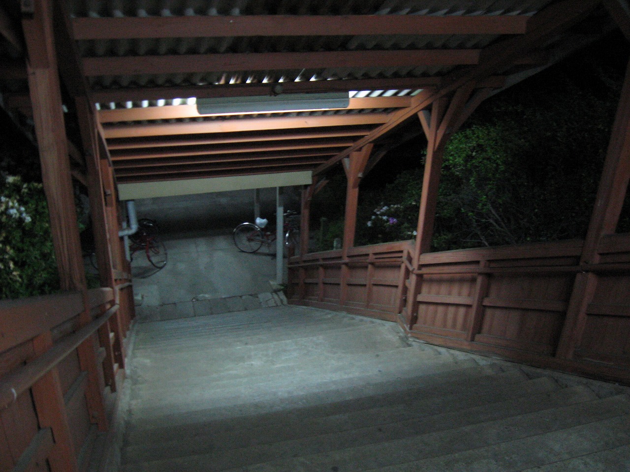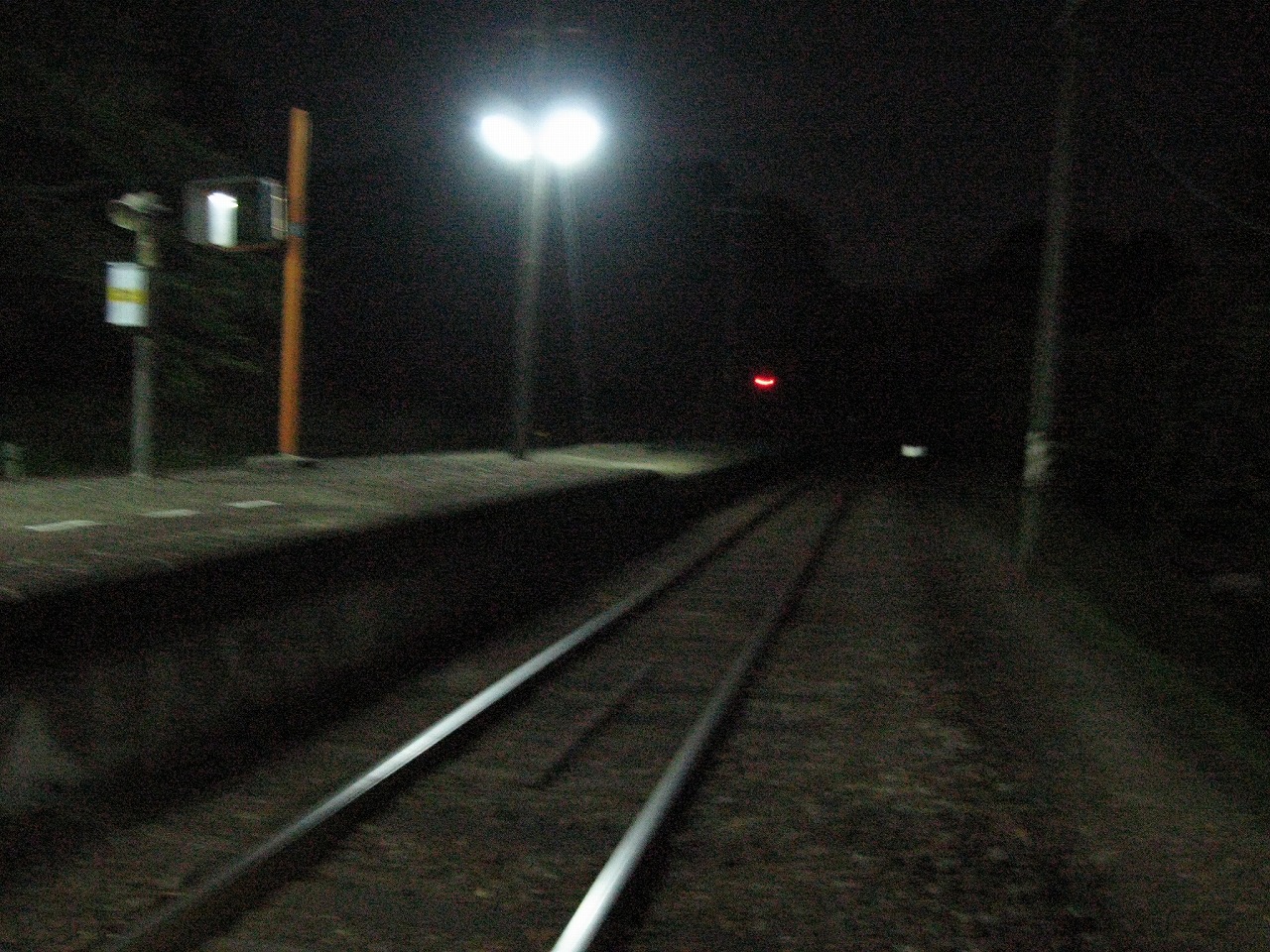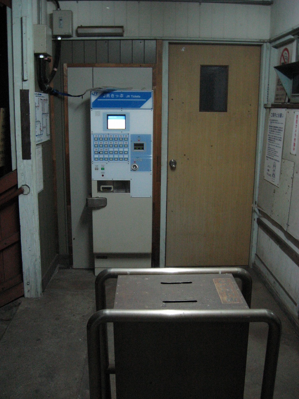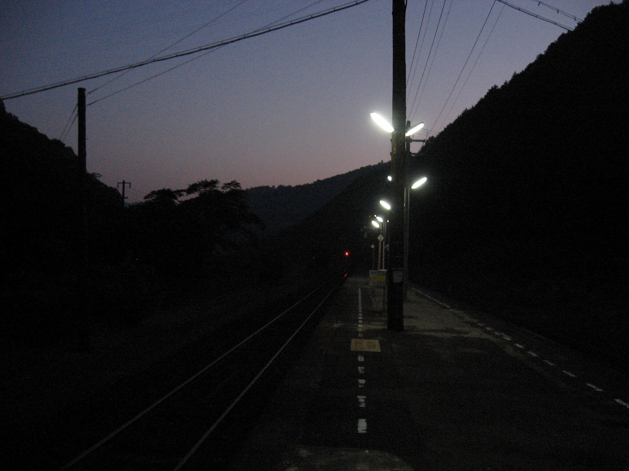 正直、降りるまでこんなに寂しい駅だとは思ってもみなかった。ホームはやや高台らしく、どうも盛り土の上のようだ。そして真っ暗な中、線路まで下りてレールを跨ぐと、屋根をまとった一本の階段が、タラップのように異界に闇に向かって脚を降ろしている。それはまるで神社の階段のようだった。 階段を降りるギリギリ手前のところに券売機などがあり駅舎の中みたいになっていた。寝るならそこで寝ろ、というような雰囲気だったが、椅子などは全くなかったので、ホームの待合室の方に椅子があってほんとによかったと思った。 それにしてもこの空間は狭苦しい。あわや階段を転げ落ちそうになるくらいだ。