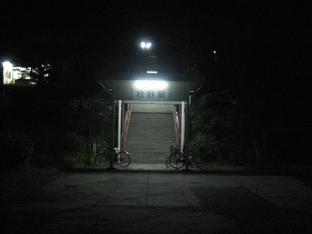 こわごわ階段を下りた。下りると気温が高くなった。広々とした砂利敷きで、向うに民家があり、奥の方の蛍光灯の明かりが漏れていて、晩酌の時間の音が聞こえていた。 「住んでるんだ…」 柱野というから柱の立派に立った洋館のような駅舎をイメージしていた。というのも岩徳線にはそんな感じの駅があるからだった。しかしこの様子からだと、どうも取り壊されて久しいらしかった。