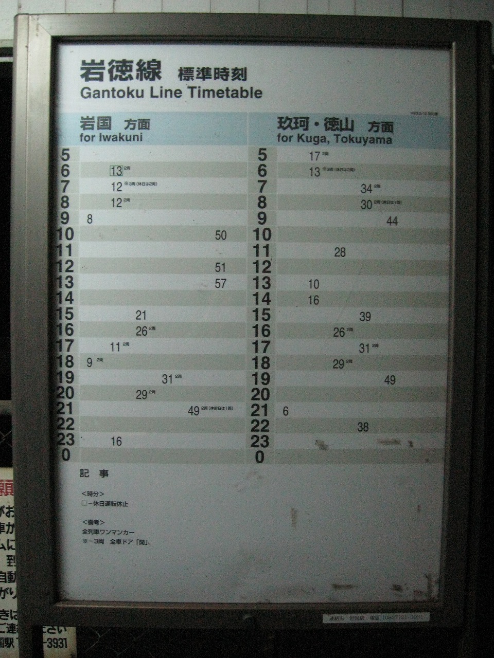 水銀灯の灯る広大な岩国駅の構内を、一両の気動車が引き裂いていく。ガーガーいう黄色と白のこの列車は、速度が乗ってくるとさほど苦しそうではなかったが、ときたまいったんギアを外され惰行しも再び唸ることがあった。罅割れた女声の自動放送が、闇夜の車窓に、一輪の恐怖を添えた。 今夜はそれほど遠くへ行かないのであまり緊張はなかったが、それでも駅舎も何もない無人駅で寝るというのは、深夜の時間いっぱいまで使った下車目的という旅でもなければ、そんなに気の進むものではない。 けれど、ひとっっ風呂浴びて、曲がりなりにも店で食事をし、そうして駅寝しにまた鉄道で別の駅に向かうので、まっとうなSTBってこんな感じなのかな、とも思っていた。 川西という駅ではスーツ姿の人が降りて行った。錦川清流線との乗換駅なので、それに乗って帰るのかな、などと想像する。 旅人はどんどん勝手に都合よく想像する。それは旅人の純真さだ。