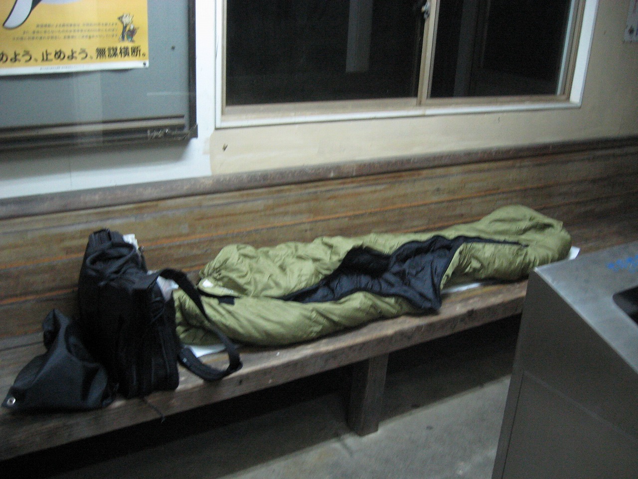 もう時間も遅いので早々とホームの待合室にシュラフを敷く。正直、三夜目ともなると慣れたものである。ホームの待合室には夜中に人が来ることもほとんどないし寝やすいのだが、どうにも気持ち悪いことがある。けれど、ここはやや開放的で大丈夫そうだ。