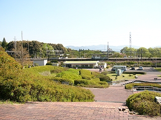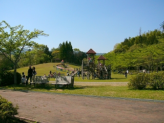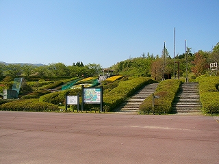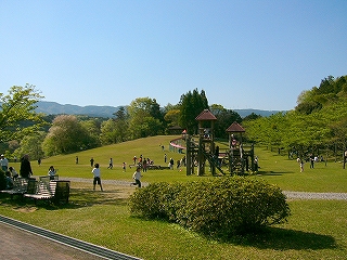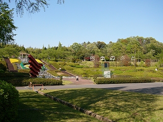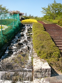 駅前から斜面前の赤い広場に行って、階段を上りはじめた。 しだいに胸に突き上げてくる楽しさ、上はどうなっているのだろうかという楽しみ。 斜面の花壇の脇に来ると、花壇の両脇に滝が流れていて、 公園に躍動感が宿っていた。 子供は水に入るのが好きだが、ここは急な流れの斜面だから、見るだけだ。 花壇も背丈ほどある緑の柔らかい網で囲われていて、侵入者に備えていた。 もっと親しみたいものだが…。 階段を上りきると、そこは広い芝生の丘、力強く芽吹いた明るすぎるぐらいの緑の木々。 その明るさとびやかさの中に、おもしろそうな遊具が佇んでいた。 遊具には子供がいっぱい纏わり付き、 遠くからの歓声の切れ切れは、温みの高まった空気に抑えつけられ、こもって聞こえてきた。 遊具だけでなく、周りの芝生にも年寄りと子供が一緒に歩いたりして、 小さな子を連れた家族連ればかりであった。単行など誰もいない。