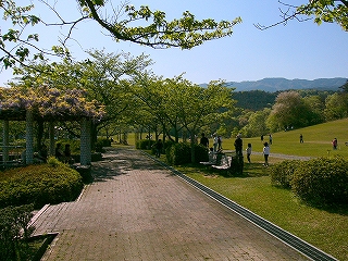 芝生の外周はレンガの小径で、藤棚の下のベンチでは大人が休んでいた。