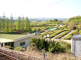 車窓からは見渡す限りいちめんの新緑そして花時計のような花壇。
