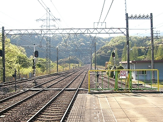ホームの端にて。遠くに青山トンネルが口をあけている。