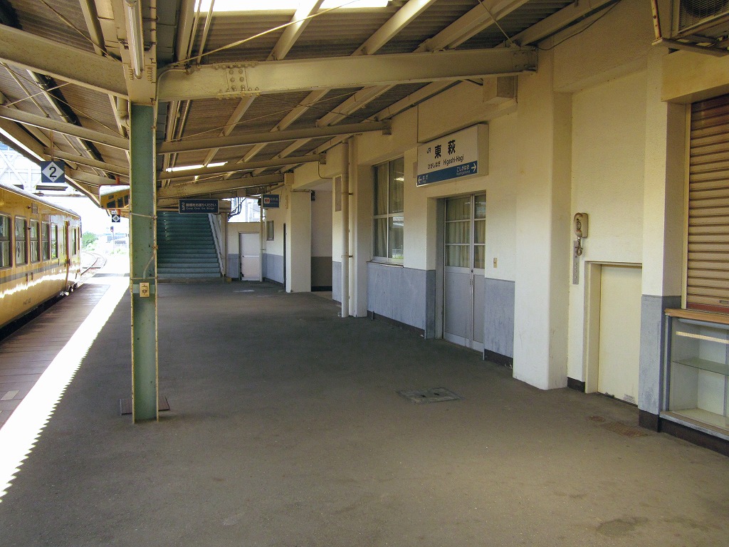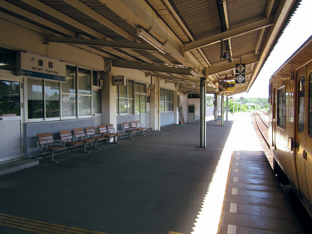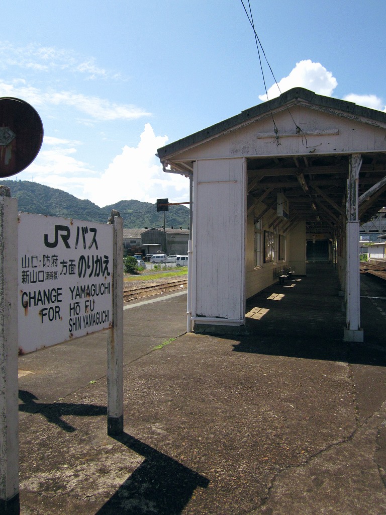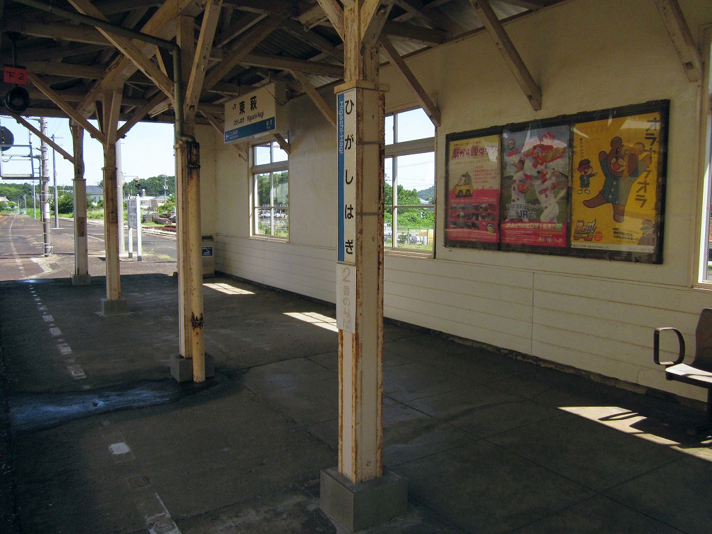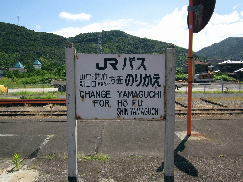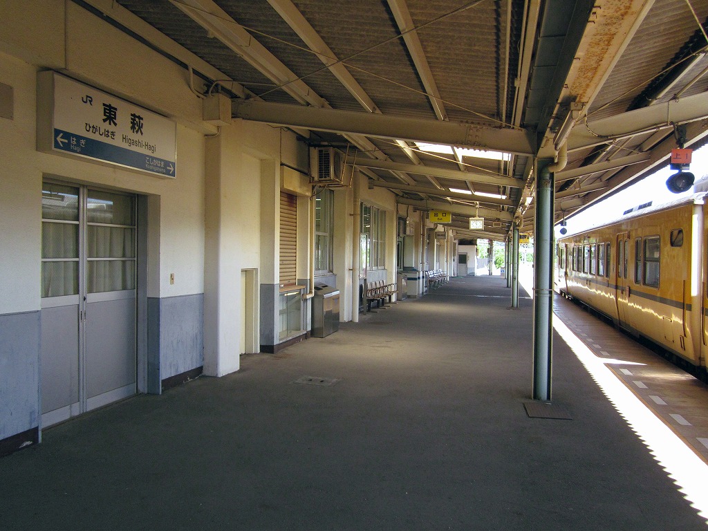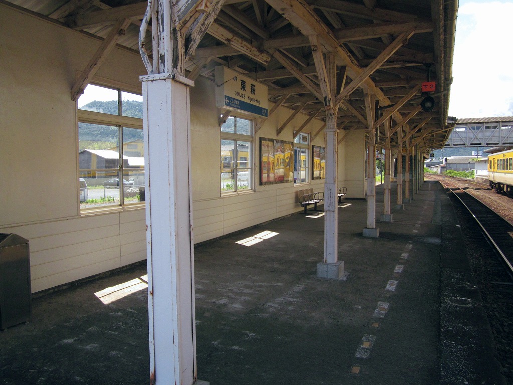 東萩は雑草で構内が荒れていて、またとんでもなく古い木製の乗換案内などがぽつんと残っているようなところだった。はっきりていって、海の感じはまったくなく、そこは山の山口の駅である。そもそも萩という地名も、ただただ暑苦しいものだった。