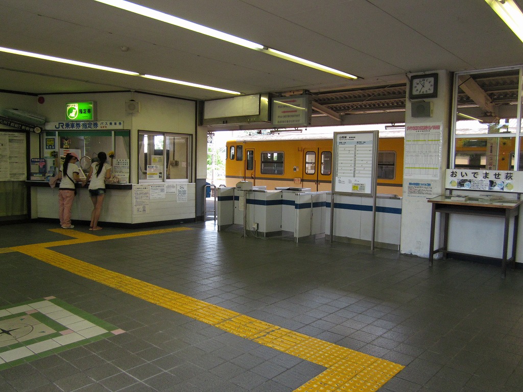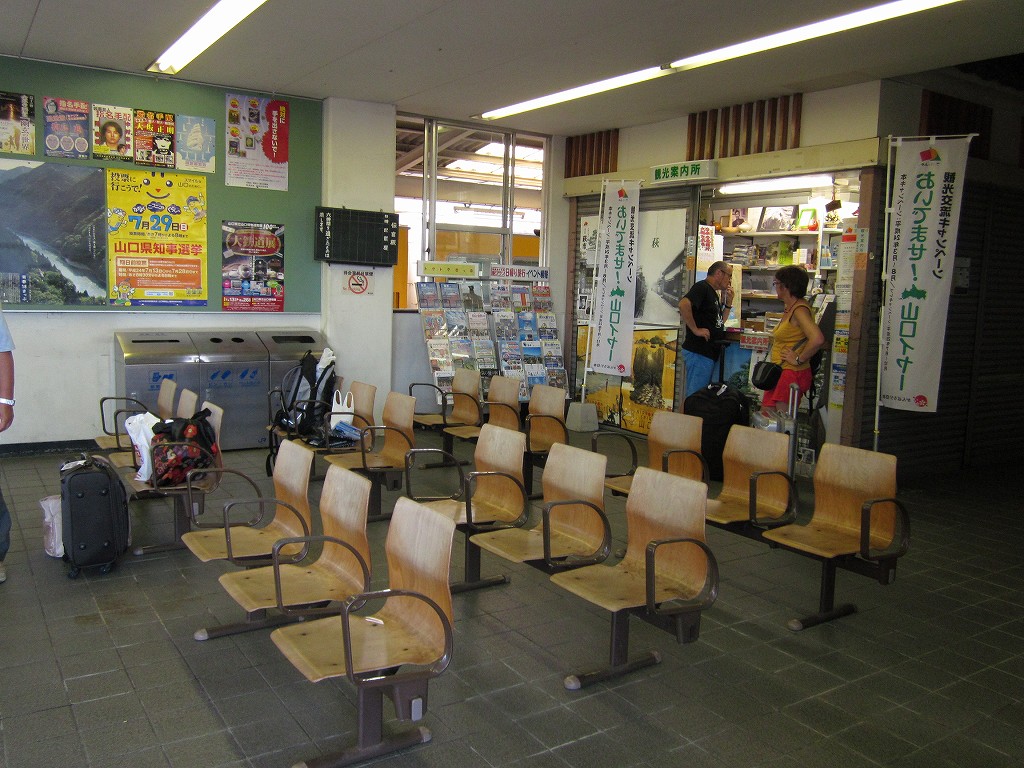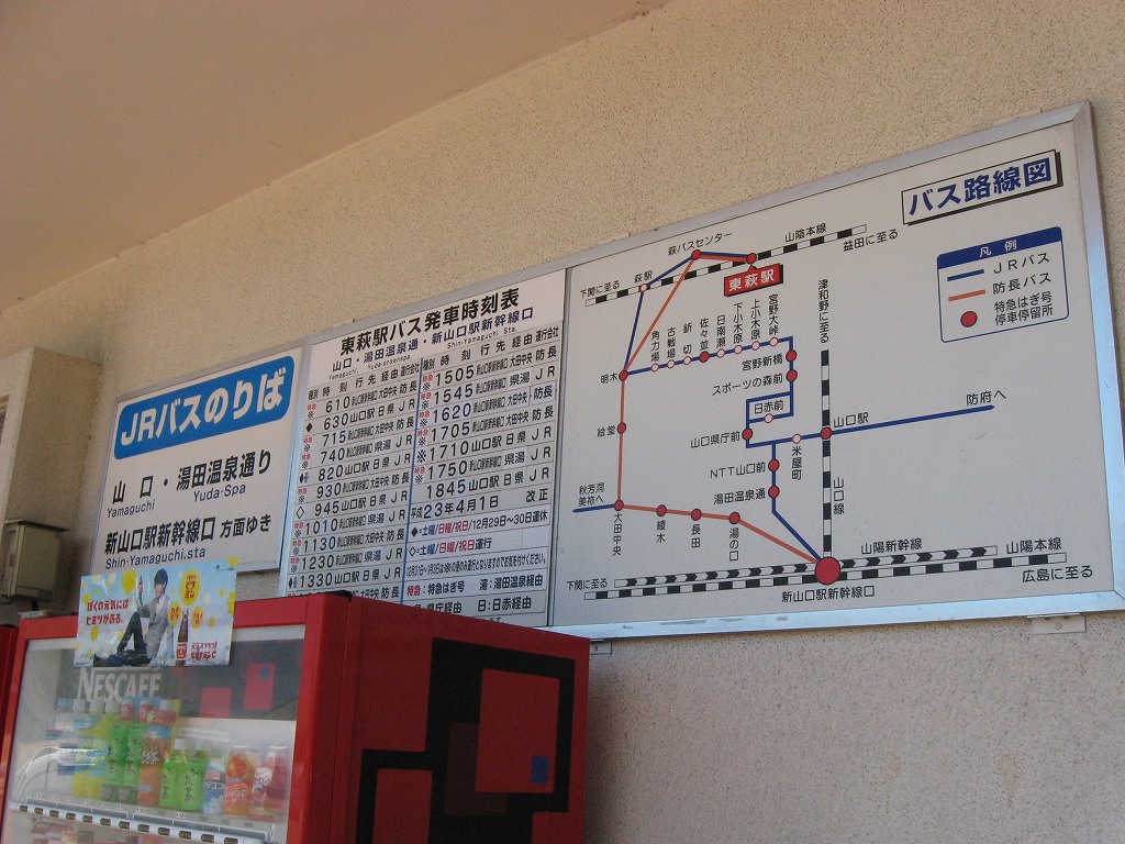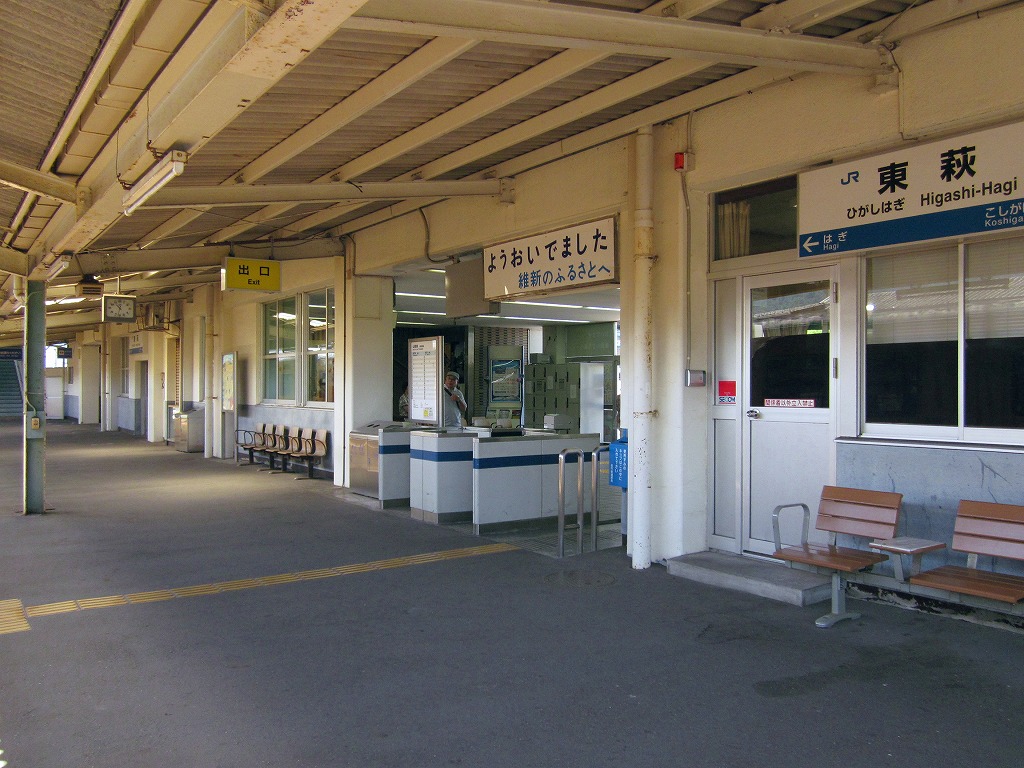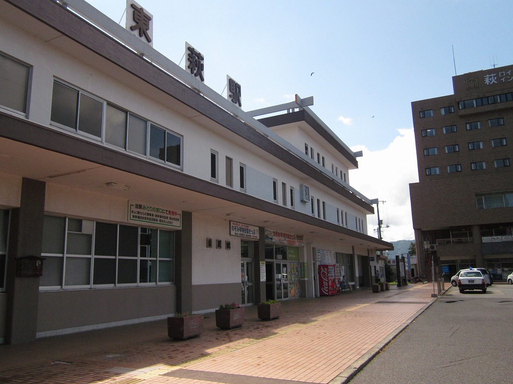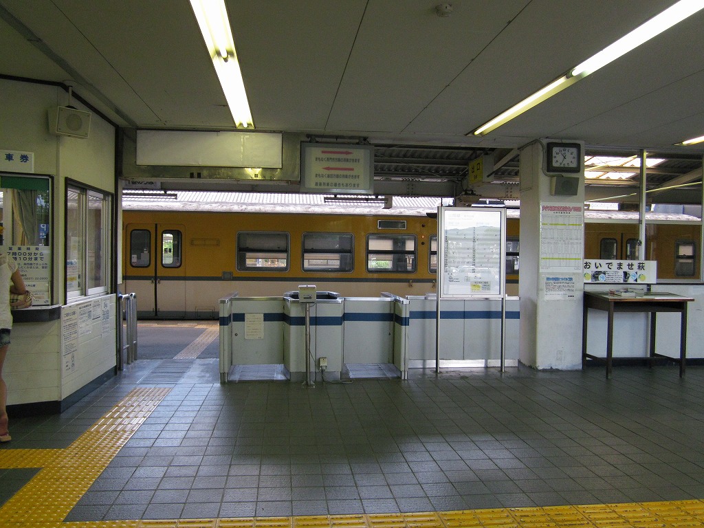 東萩は雑草で構内が荒れていて、またとんでもなく古い木製の乗換案内などがぽつんと残っているようなところだった。はっきりていって、海の感じはまったくなく、そこは山の山口の駅である。そもそも萩という地名も、ただただ暑苦しいものだった。