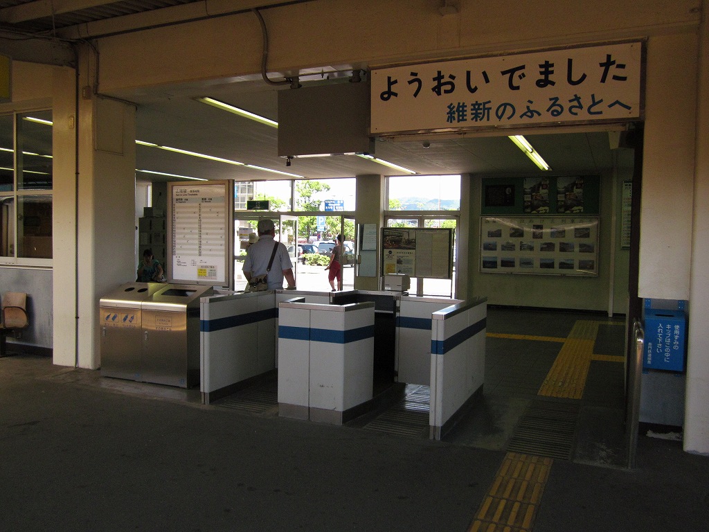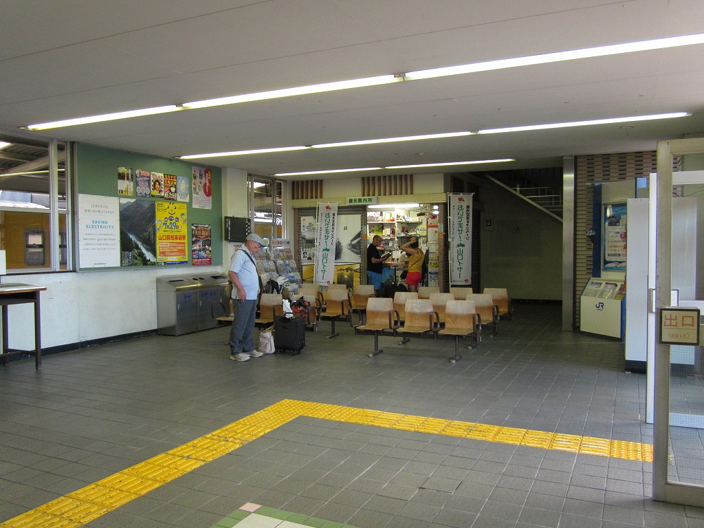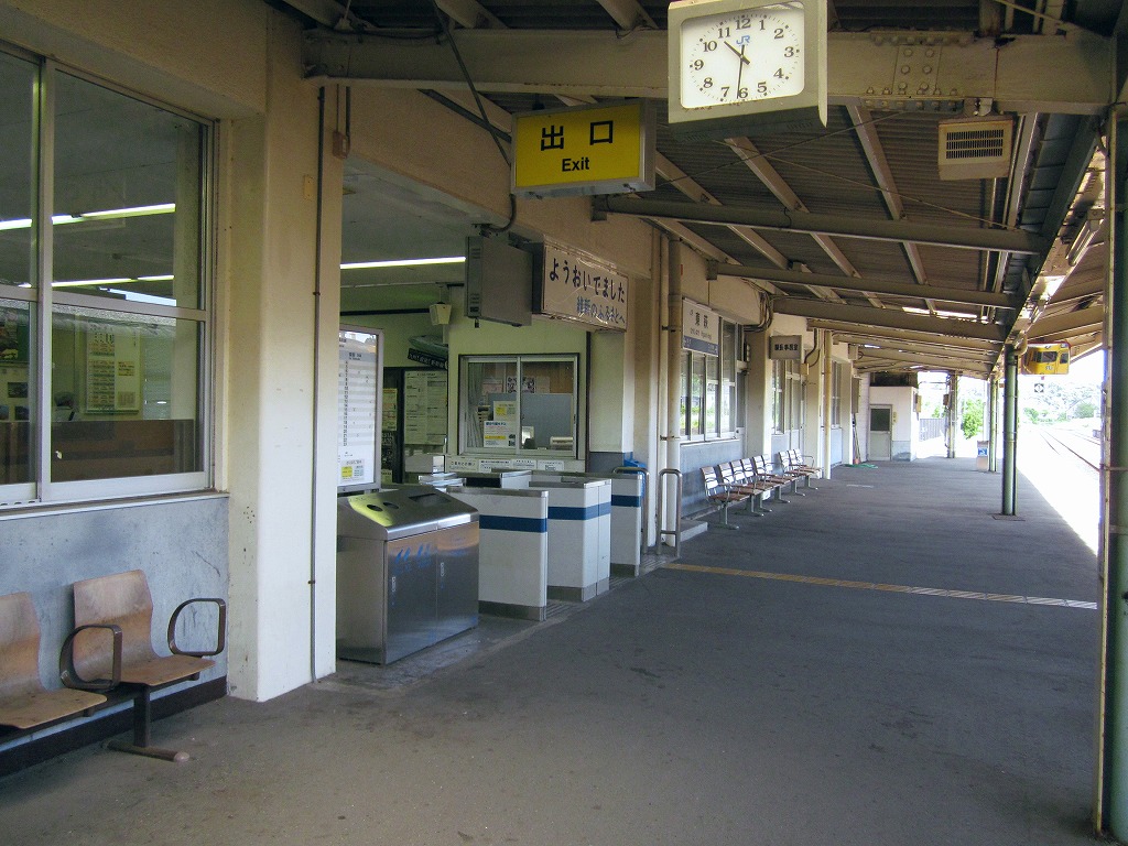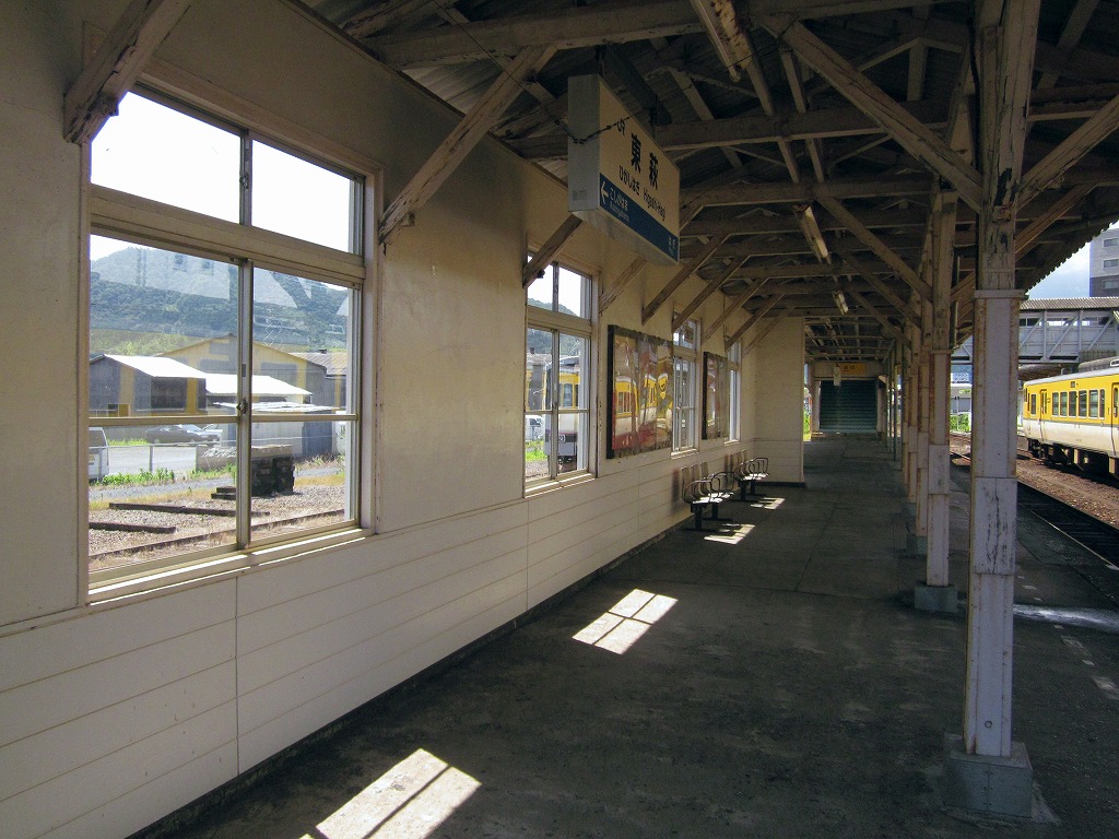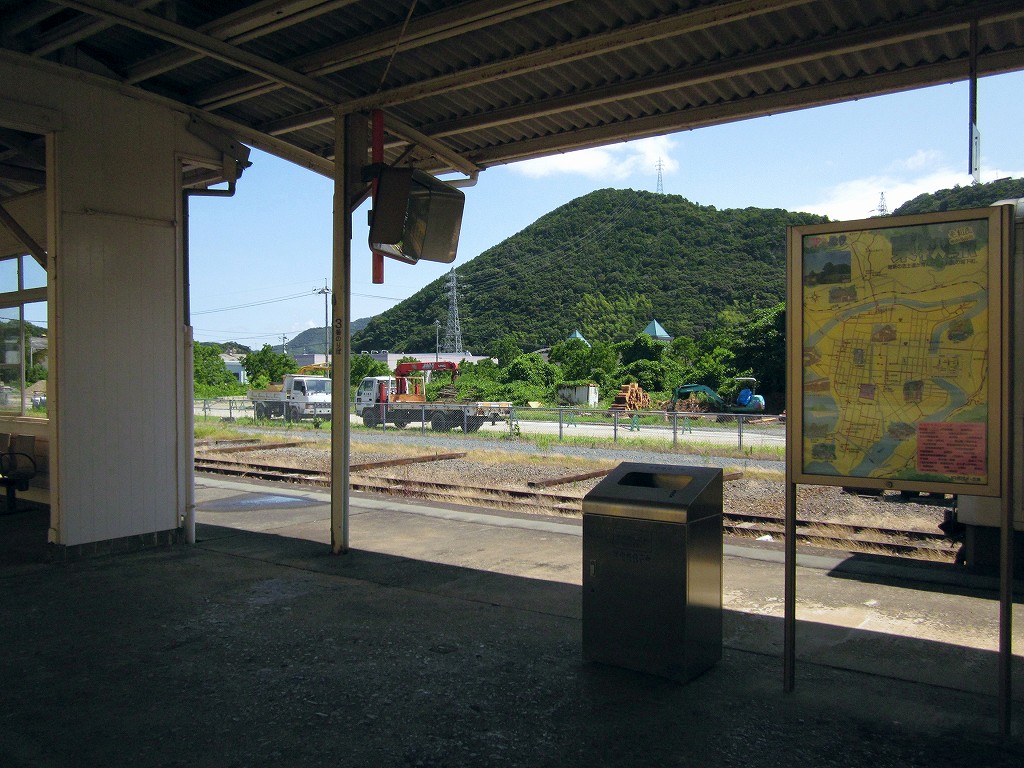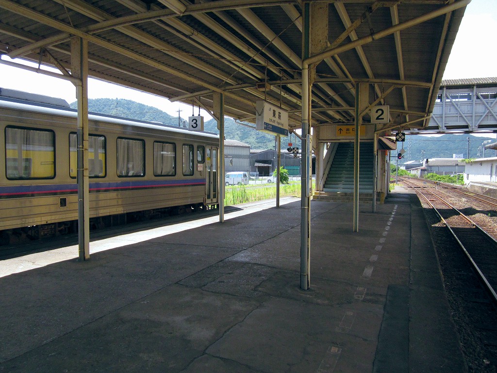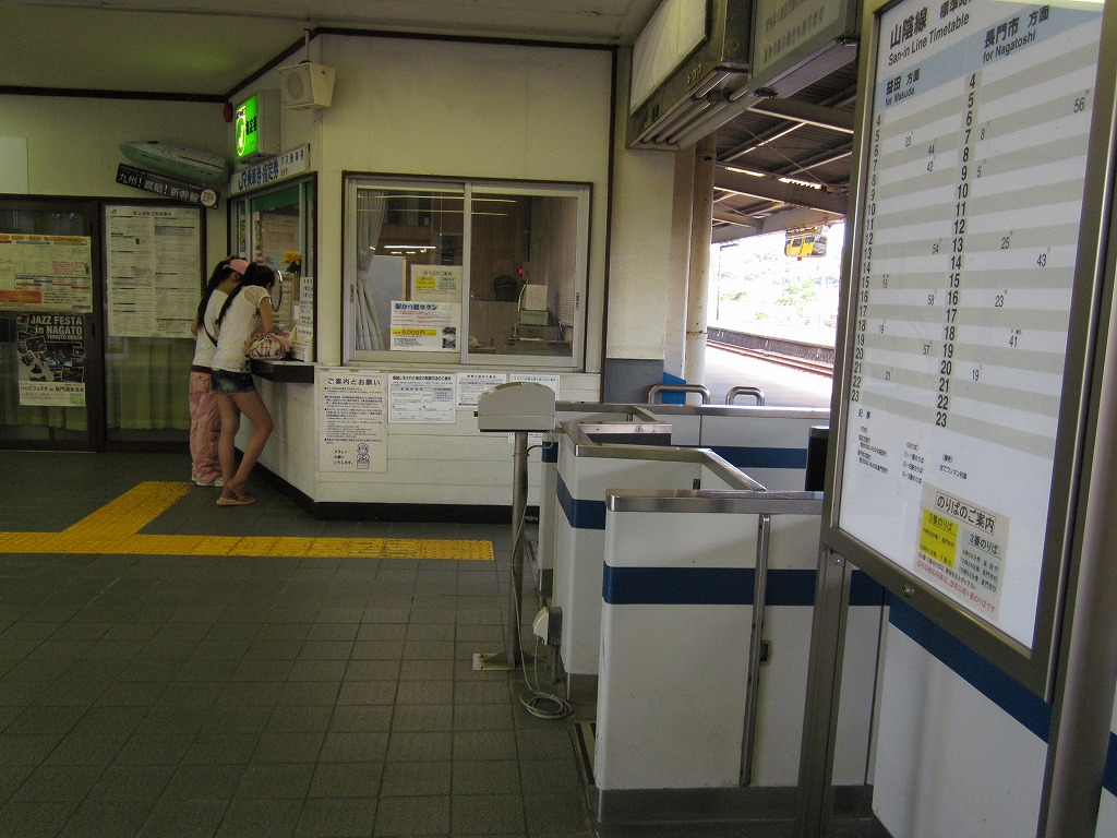 東萩は雑草で構内が荒れていて、またとんでもなく古い木製の乗換案内などがぽつんと残っているようなところだった。はっきりていって、海の感じはまったくなく、そこは山の山口の駅である。そもそも萩という地名も、ただただ暑苦しいものだった。