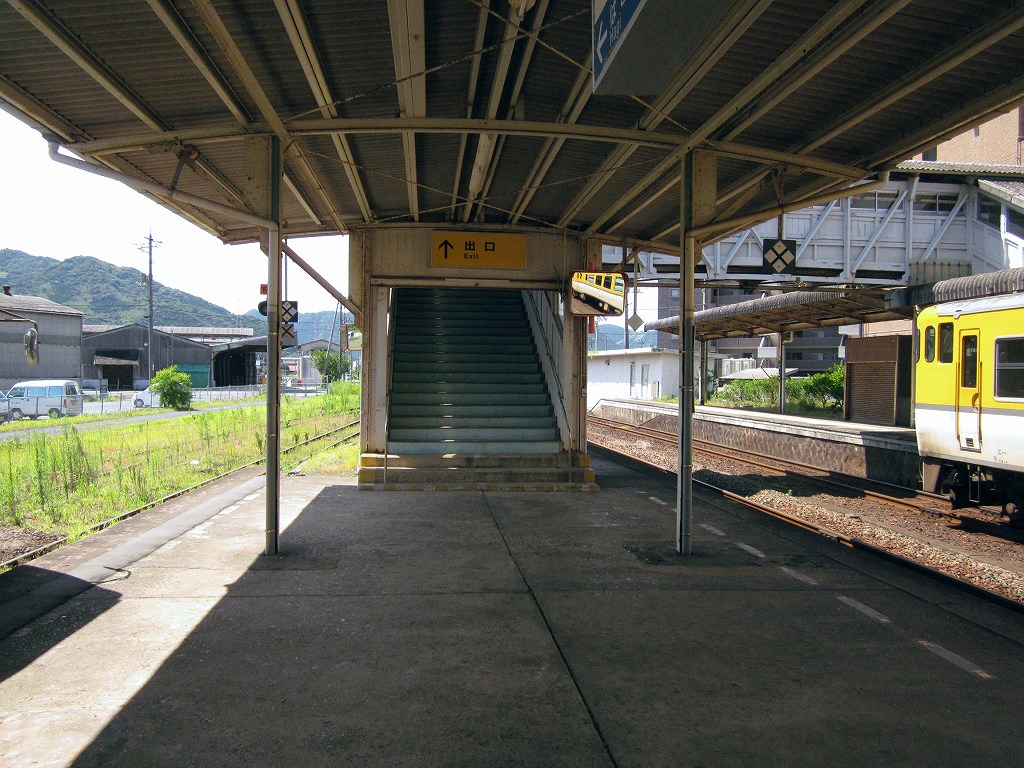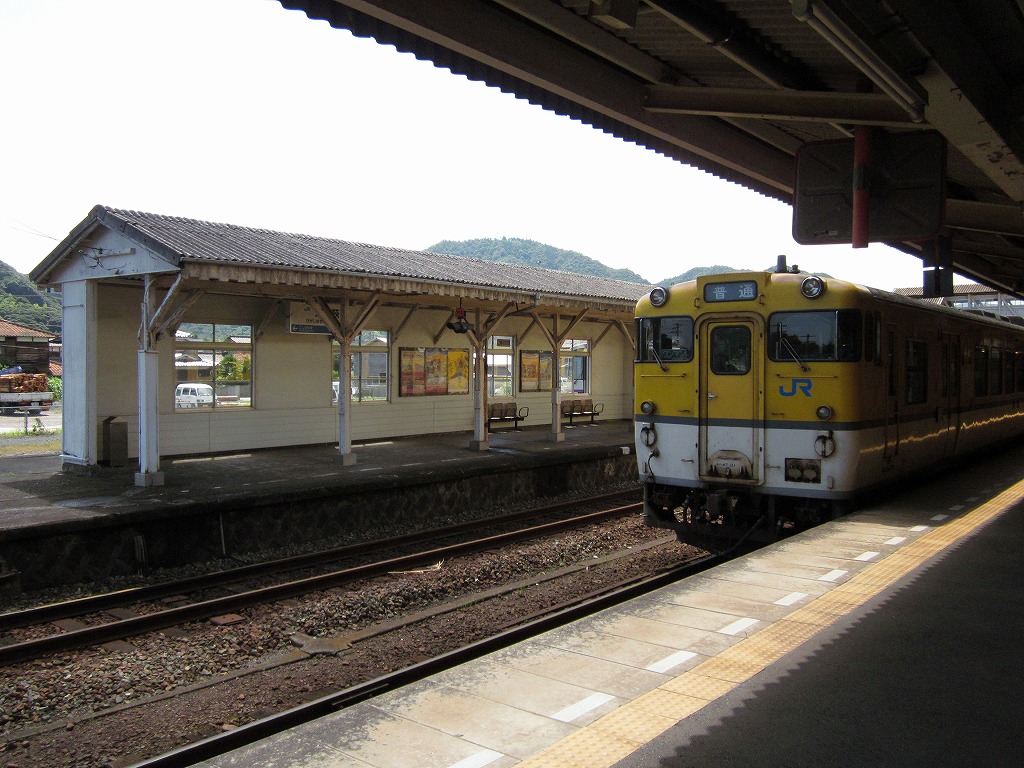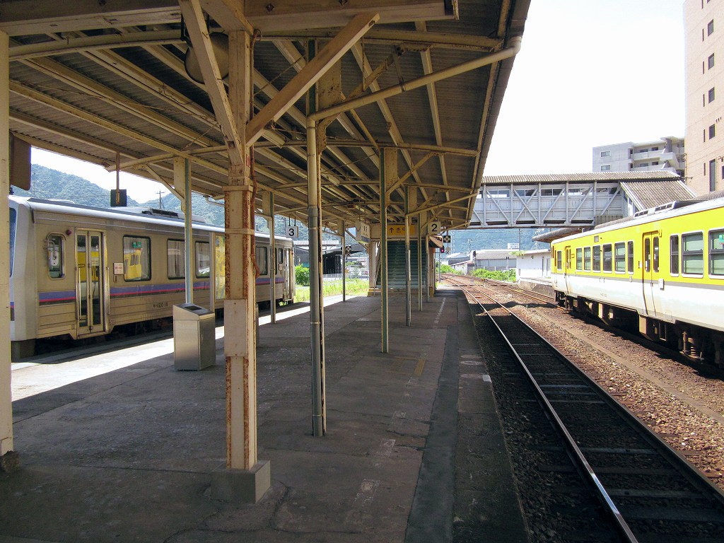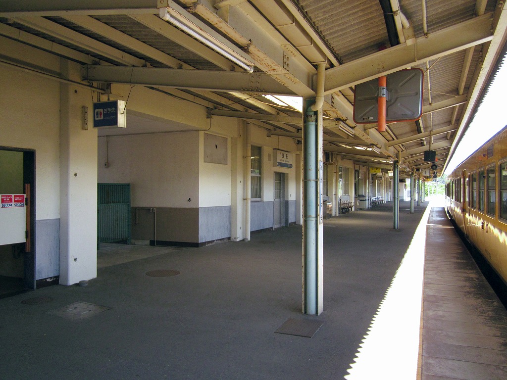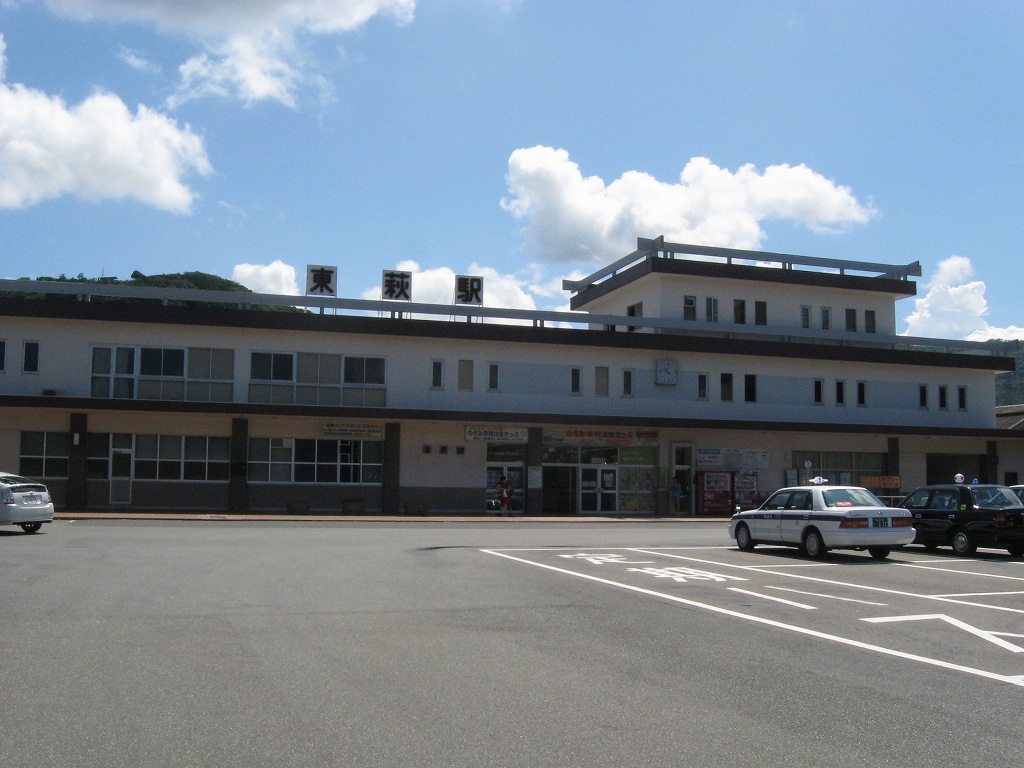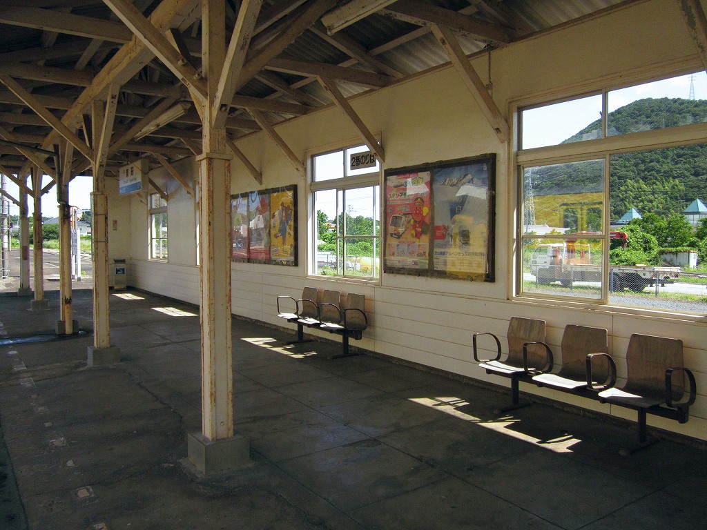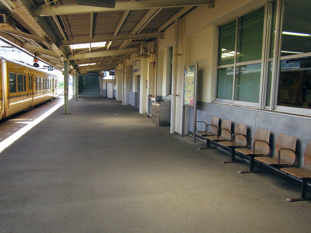 東萩は雑草で構内が荒れていて、またとんでもなく古い木製の乗換案内などがぽつんと残っているようなところだった。はっきりていって、海の感じはまったくなく、そこは山の山口の駅である。そもそも萩という地名も、ただただ暑苦しいものだった。