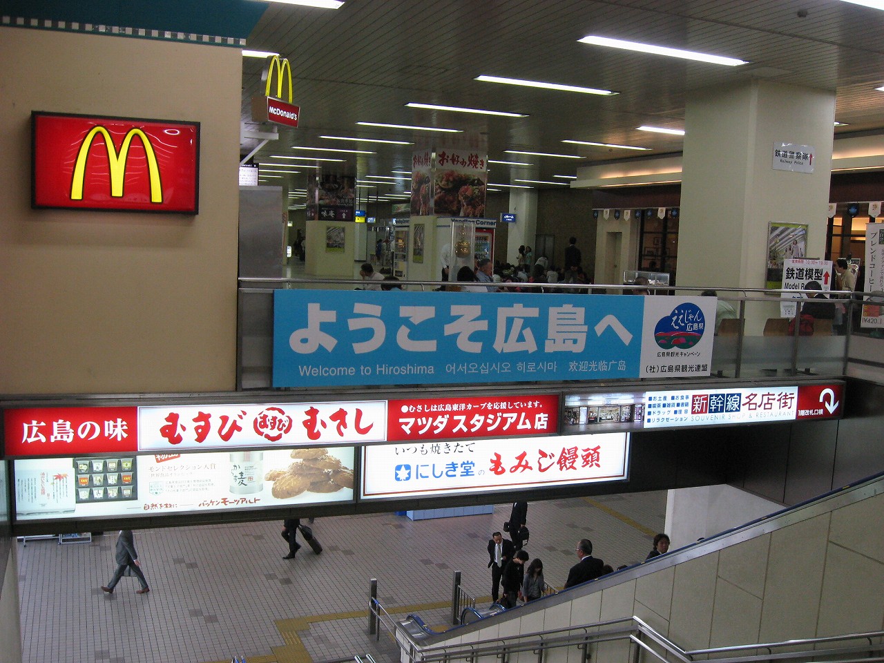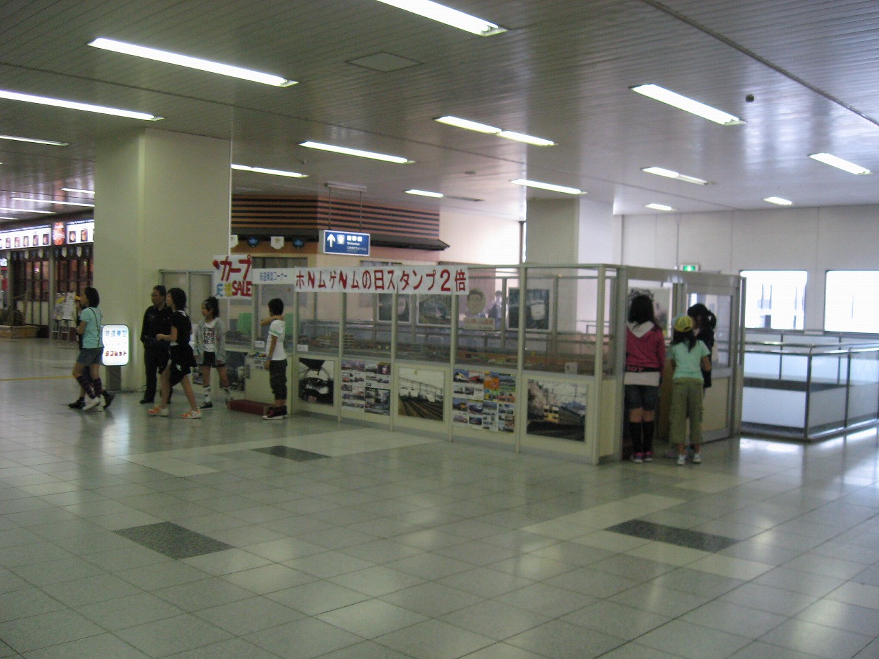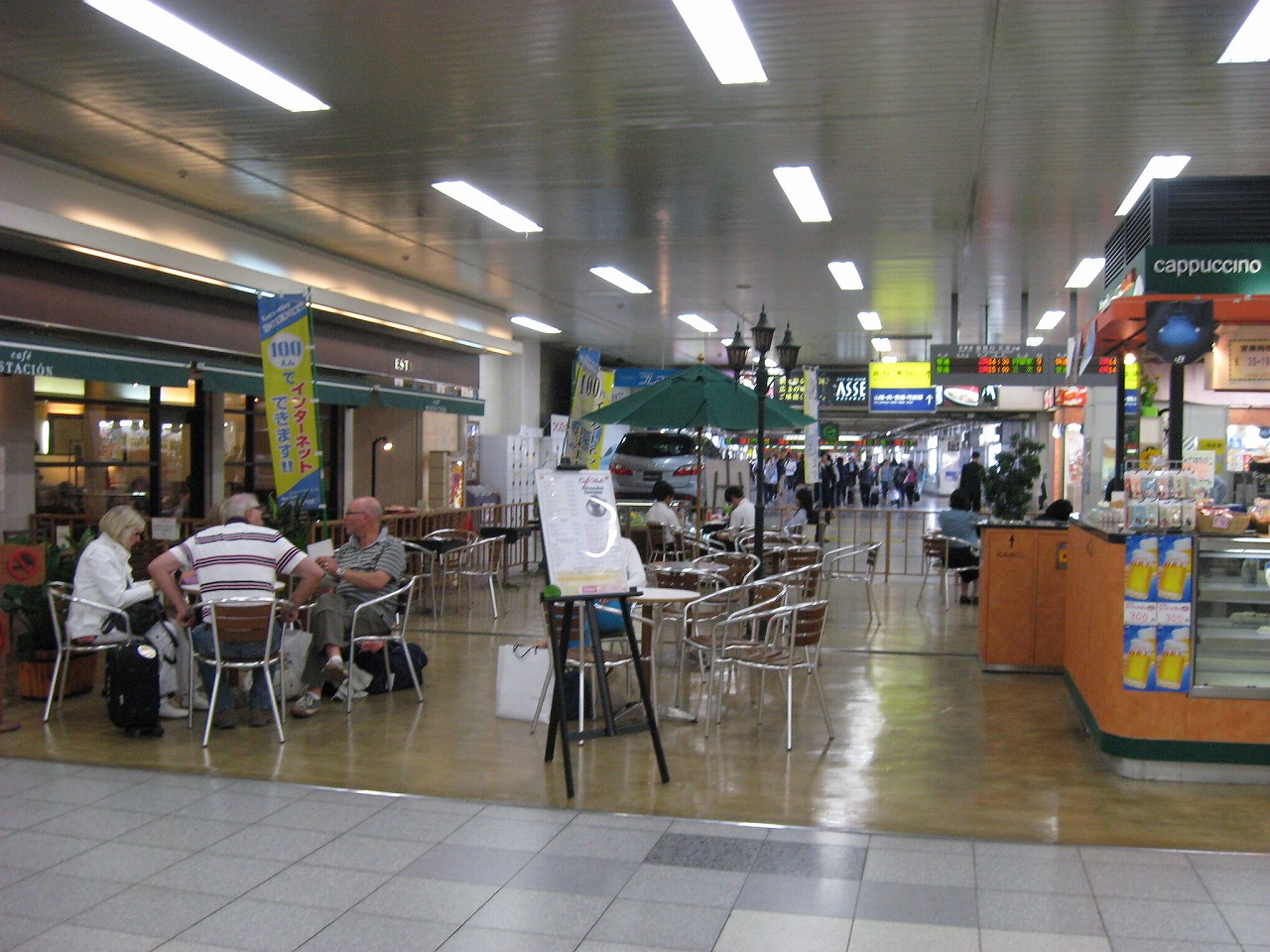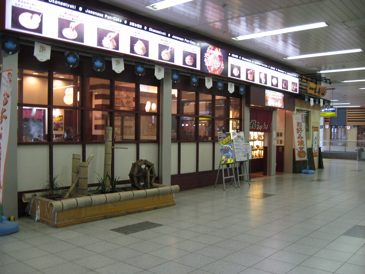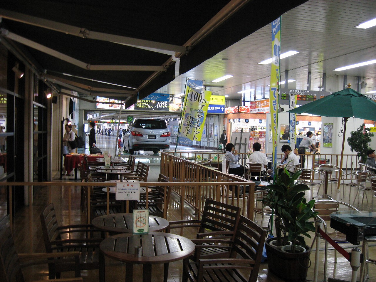 改札前コンコースに戻ってくると、やはりこっちが駅前側かなと思ってしまう…これだけ充実した裏口駅舎というのもなかなか見かけない。パリ風のテラス席のある喫茶店やマクド、お好みの店に鉄モの店となかなかに濃いコンコースだった。改札内にはマツダの車も上げてあったしなぁ…