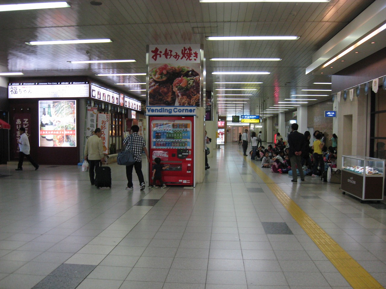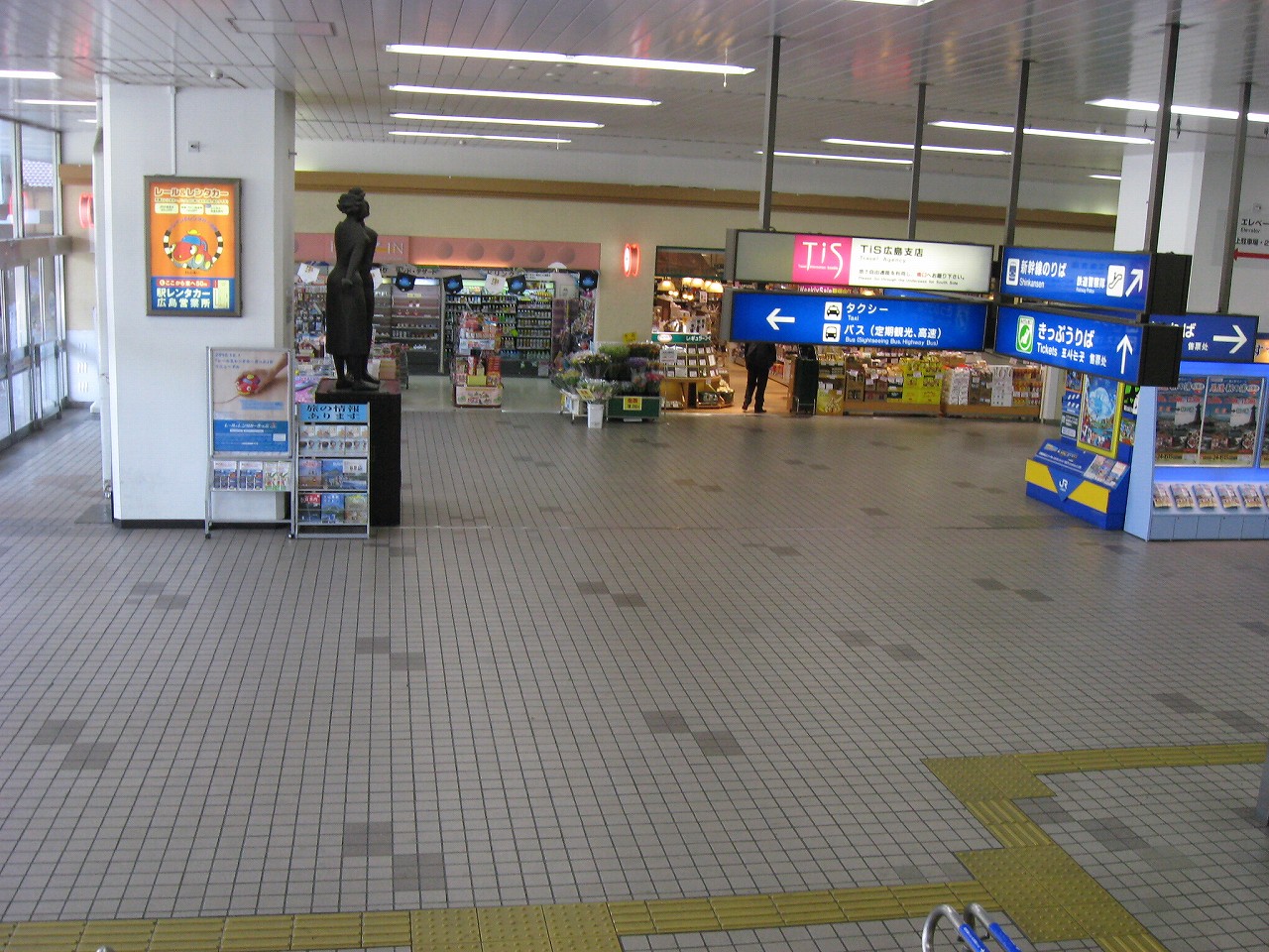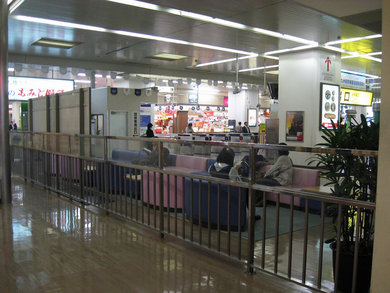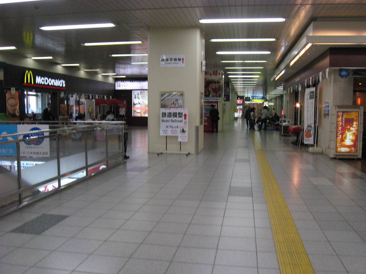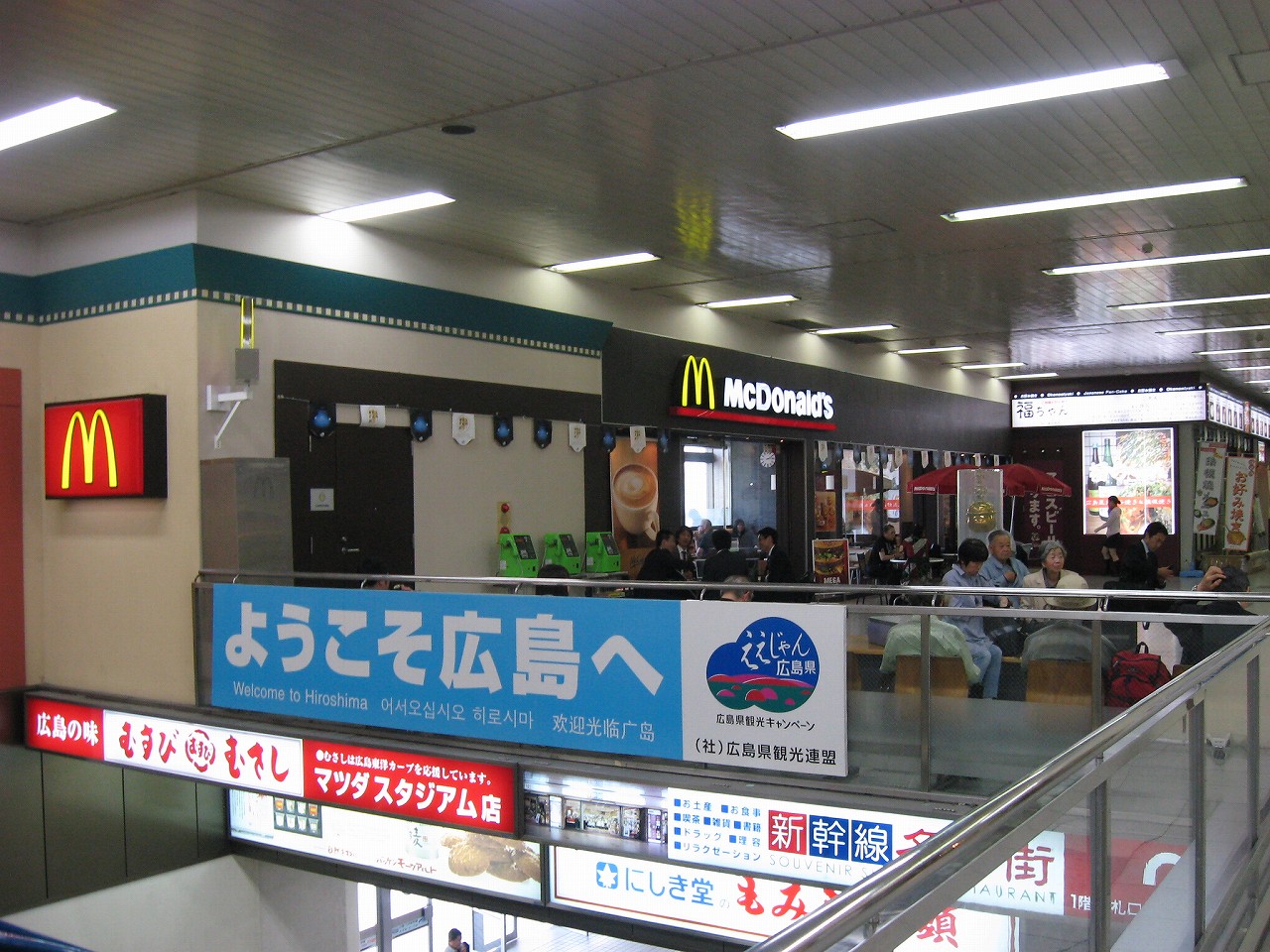 改札前コンコースに戻ってくると、やはりこっちが駅前側かなと思ってしまう…これだけ充実した裏口駅舎というのもなかなか見かけない。パリ風のテラス席のある喫茶店やマクド、お好みの店に鉄モの店となかなかに濃いコンコースだった。改札内にはマツダの車も上げてあったしなぁ…
