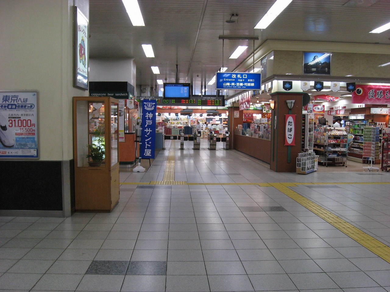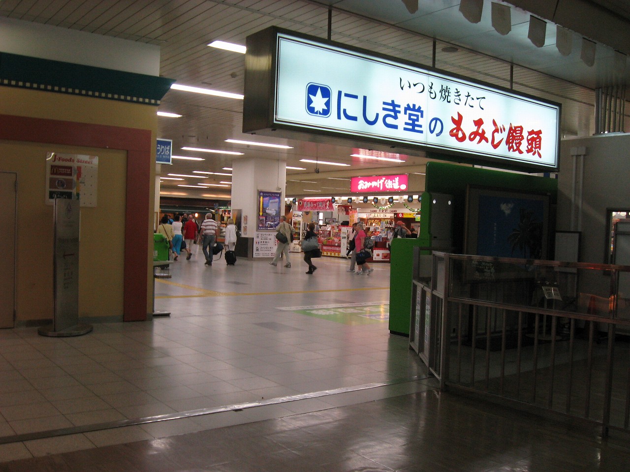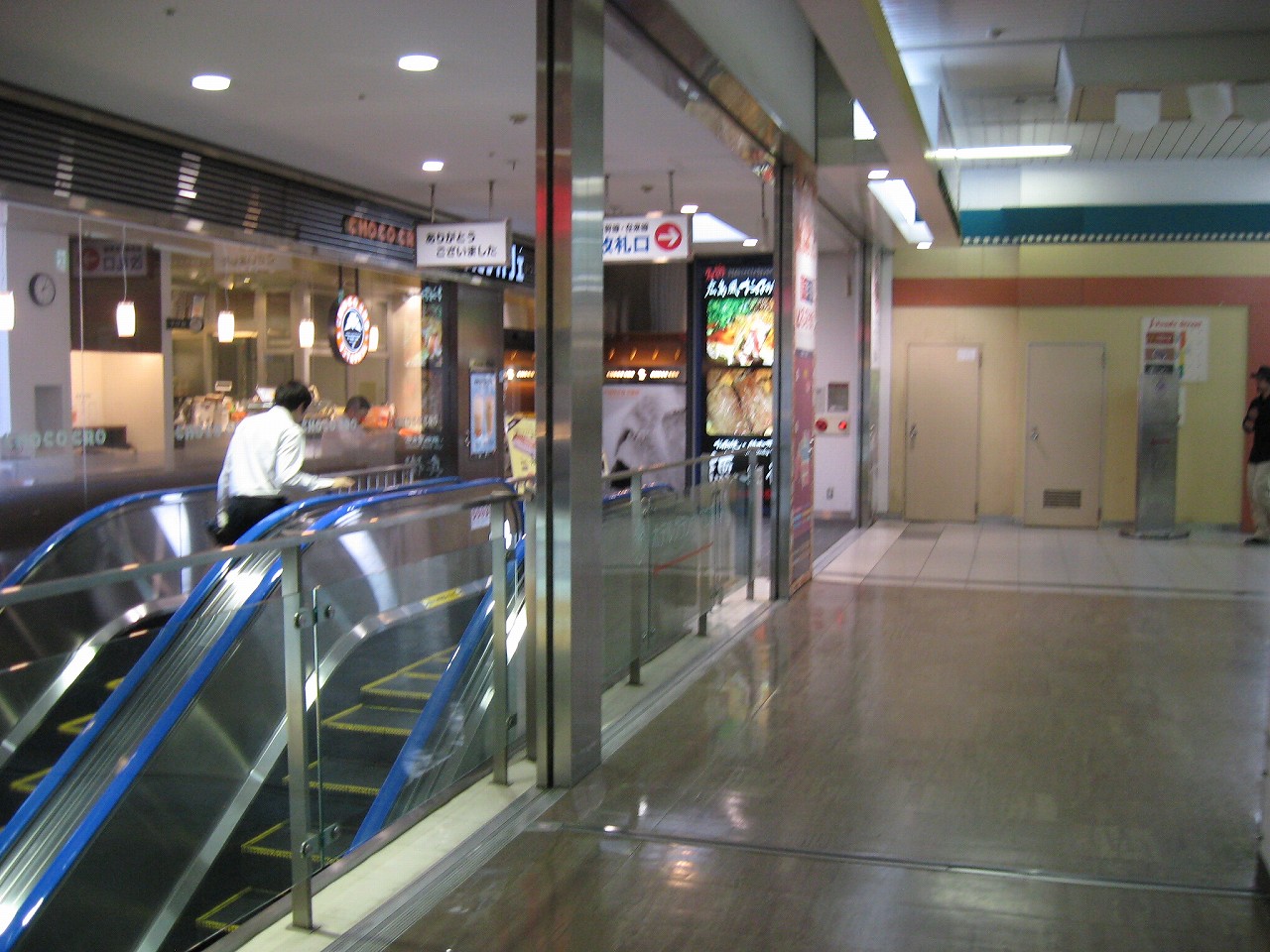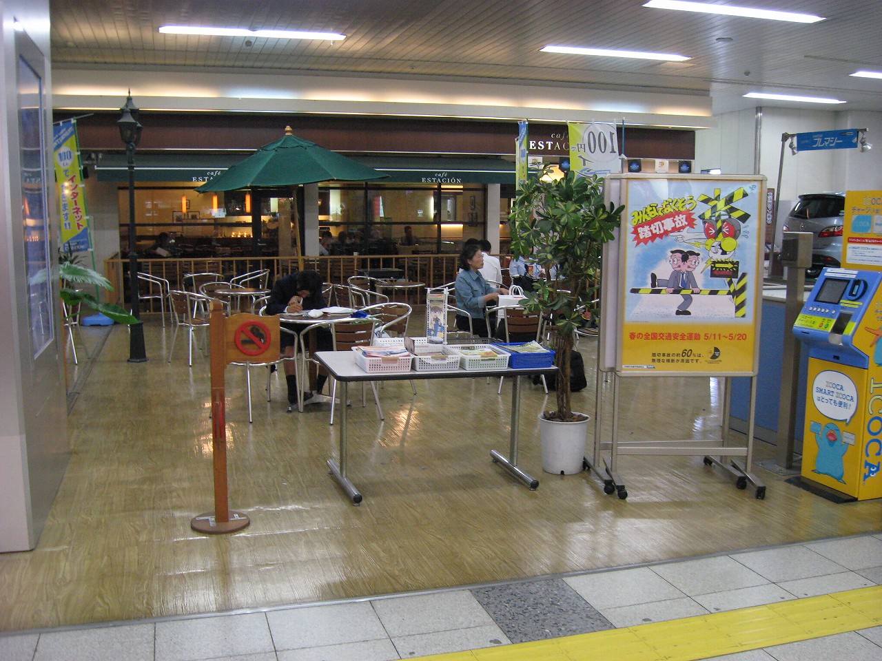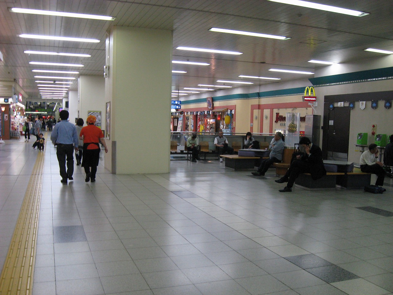 改札前コンコースに戻ってくると、やはりこっちが駅前側かなと思ってしまう…これだけ充実した裏口駅舎というのもなかなか見かけない。パリ風のテラス席のある喫茶店やマクド、お好みの店に鉄モの店となかなかに濃いコンコースだった。改札内にはマツダの車も上げてあったしなぁ…