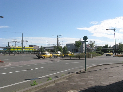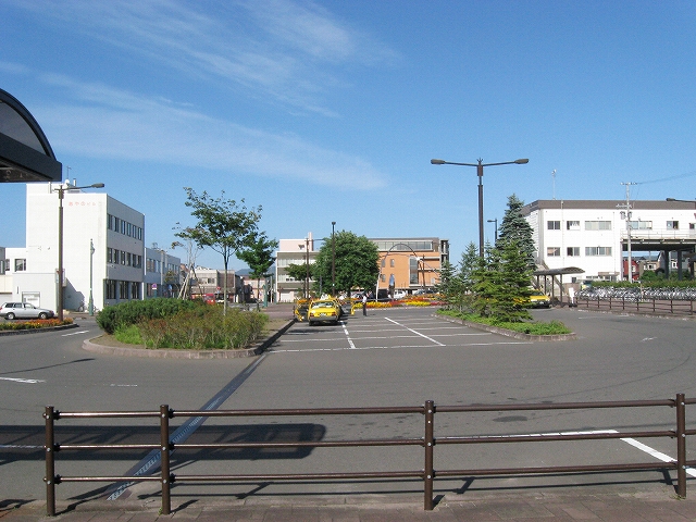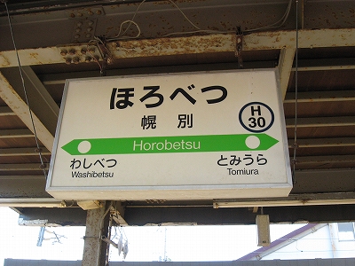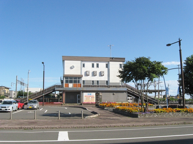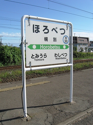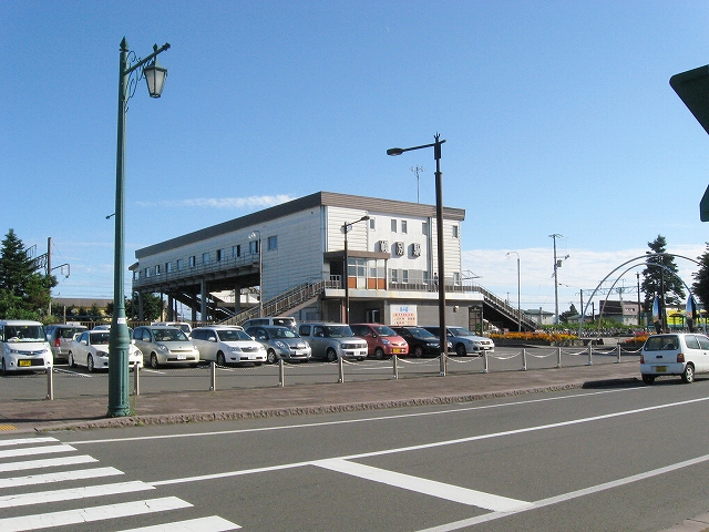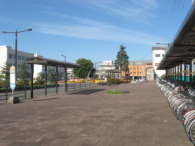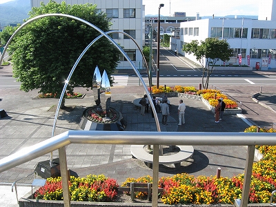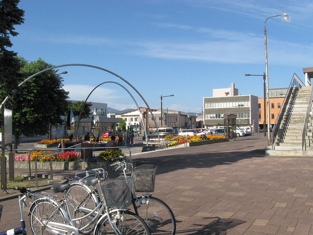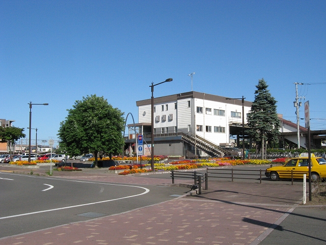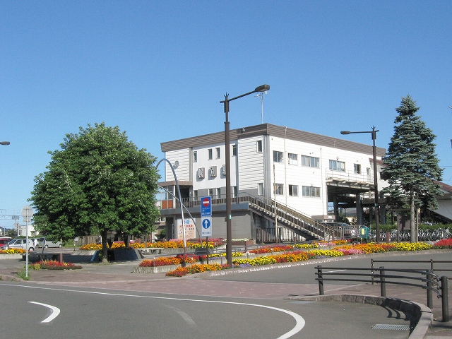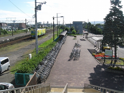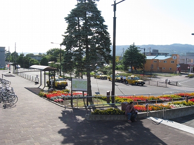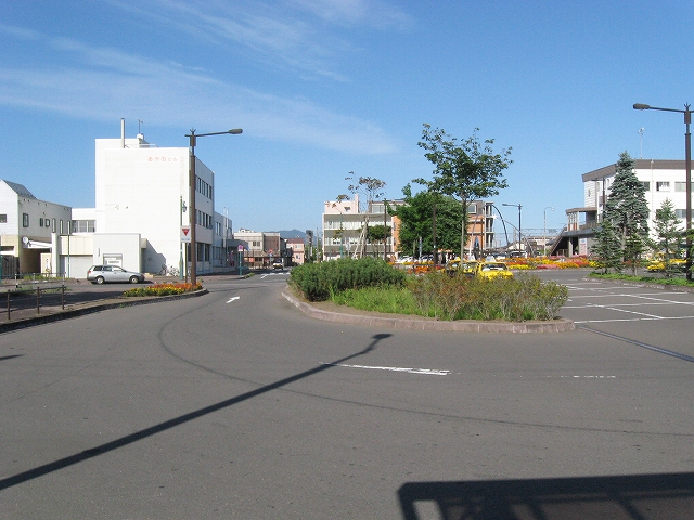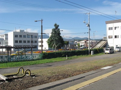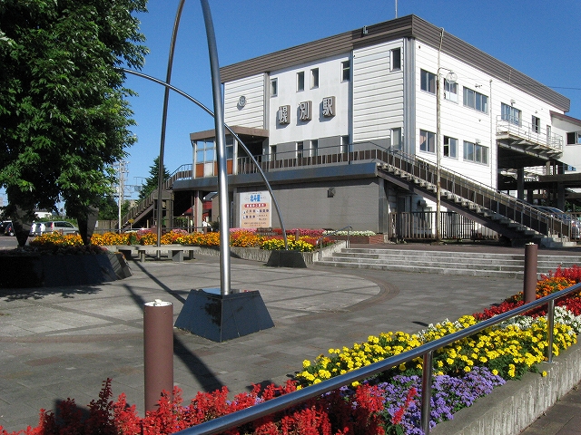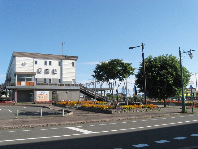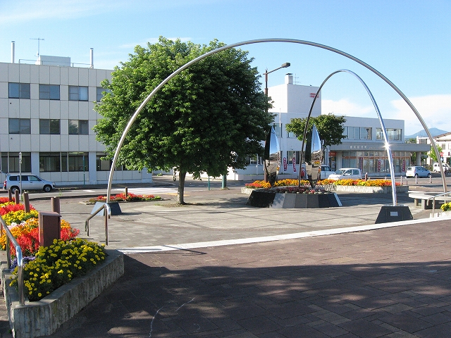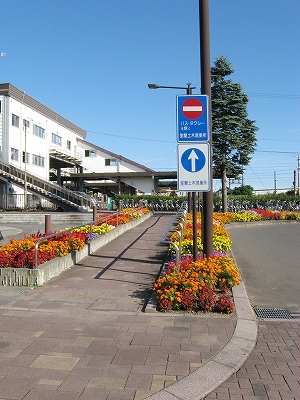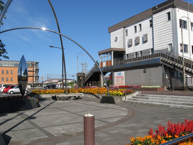 タラップ両脇に下ろす四角な橋上駅、そして袂は花でいっぱい。日中はしんと静かで、地の名も北海道のどこかの駅という感じがする。自転車も一糸乱れすならんで路駐もなく、ここだけ行儀がいい街なのかと思った。モニュメントがあるのも真面目そうな感じだ。どこともわからない感じだが、ここは登別市内随一の市街地。しかし旅行者は降りることはあまりなさそうな、地の人の駅である。