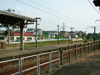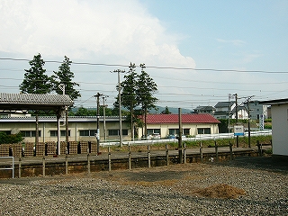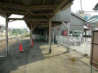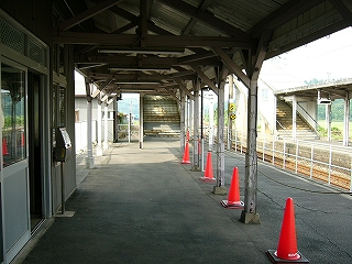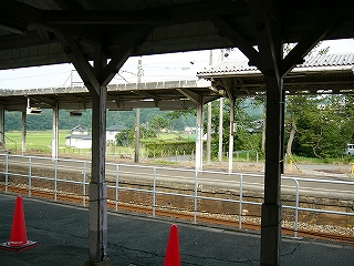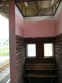 ホームの端の方は舗装の違いなどでがたがたに荒れている。ほったらかしのようだったが、それはそれでよかった。待合所が変わっていて、丸太風の装飾のある風除けに囲われた、ものすごく狭い空間に椅子が置いてある。はじめその丸太も古い木造のものと思ったが、違っていて、あれっ、と遅く気づいた。近年、改装したものだった。手を入れはしたんだな…。