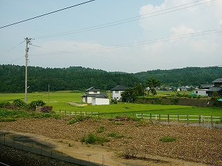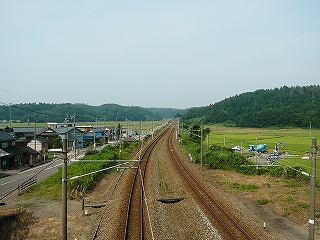 駅の牛ノ谷側にはわずかにそよぐ黄みがかった水田が山裾まできっちり広がっていて、心地がよかった。そしてその向こうに鬱々とした低い森が控える。さっきの牛ノ谷峠だ。しかし落ち着いて見回すと、プラットホームのあたりは新旧の宅地で、この辺はやはり土地が安いのかなどと考えはじめたりした。ここなら福井にも加賀にも通いやすいかもしれない。