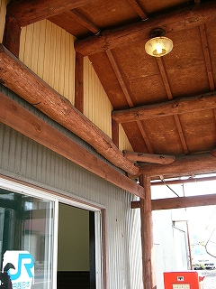しかしやはりログハウス風の装飾は内部だけなんだ。そうと思ったら、ポーチの屋根が怪しく、丸太組みになっていた。さてはこれから来ていたんだな。しかしこのポーチは元来こうだったのかと思えるような色になっていた。