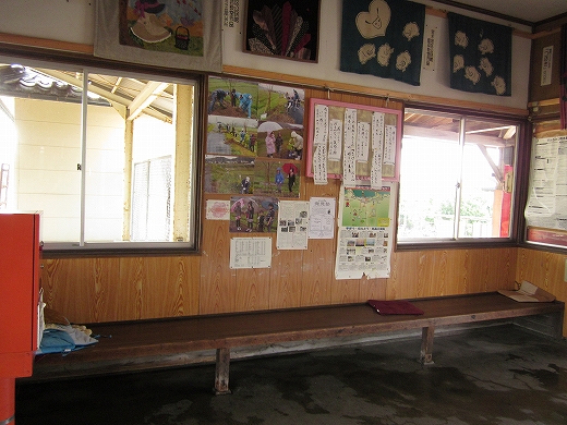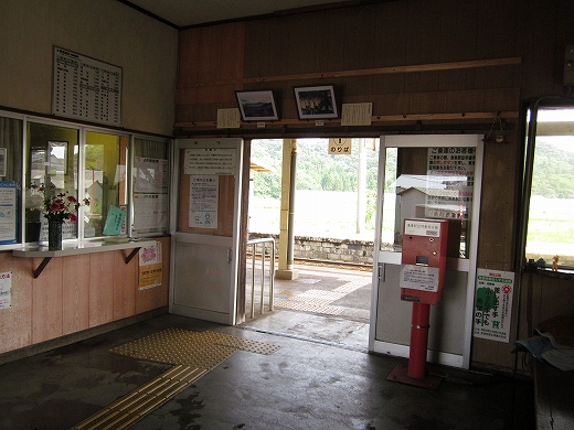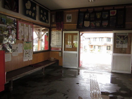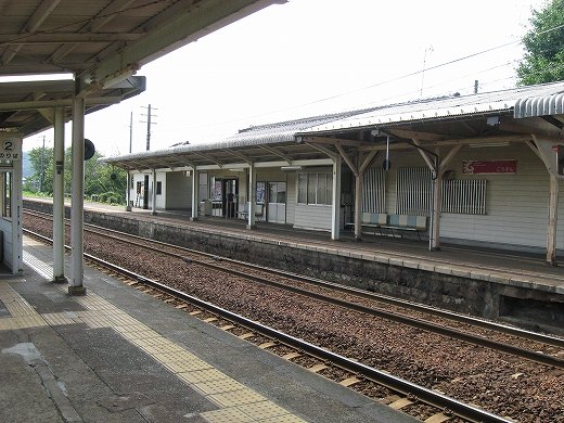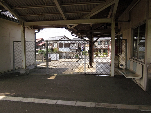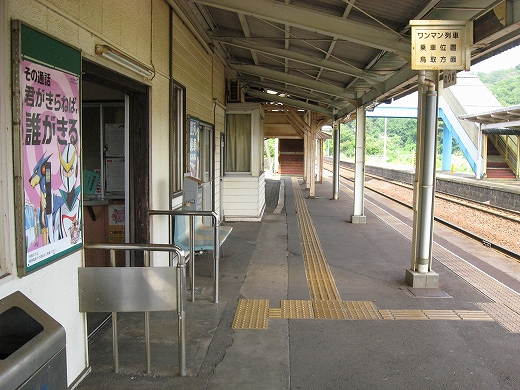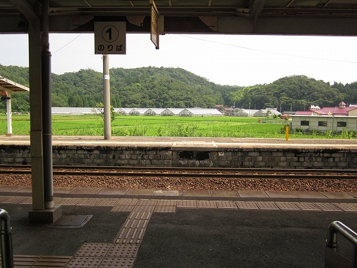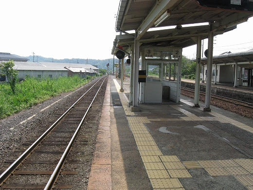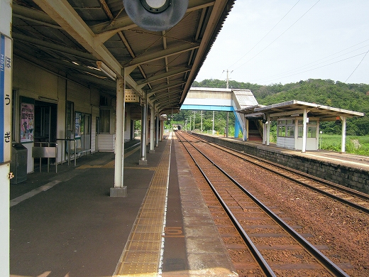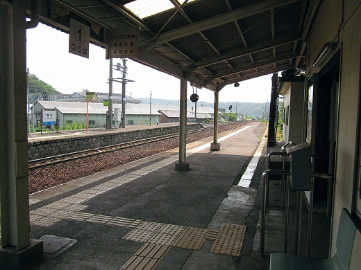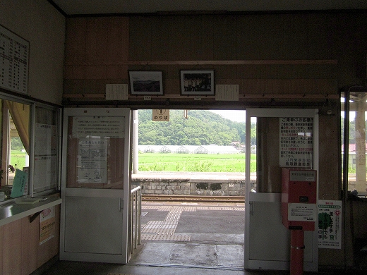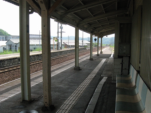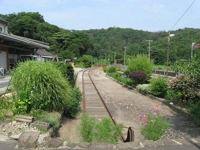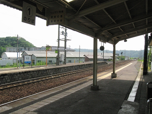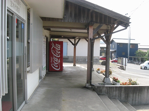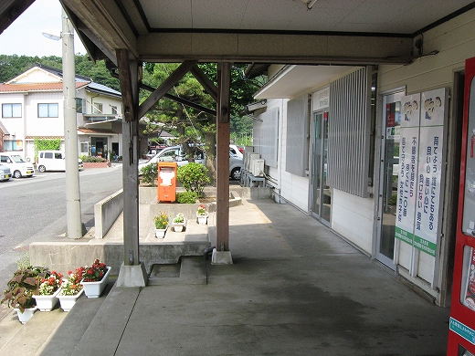 ここにはなんか変な奴でもかつてきたのか? こんなとある集落に?とおもうが、駅はやはり周囲に溶け合う切妻の車寄せで、そこに駅名が掲げられていた。いちぶを江州銀行のATMにしているのも、山陰らしい。貨物側線が花に囲われ、きれいに残っている。いまでも荷卸しするかと思うくらいだ。