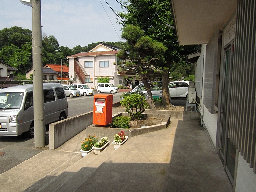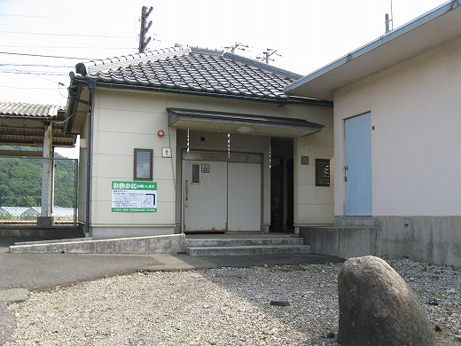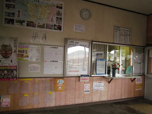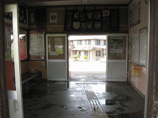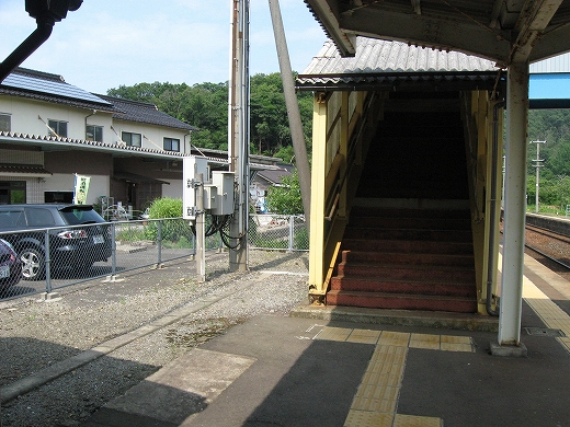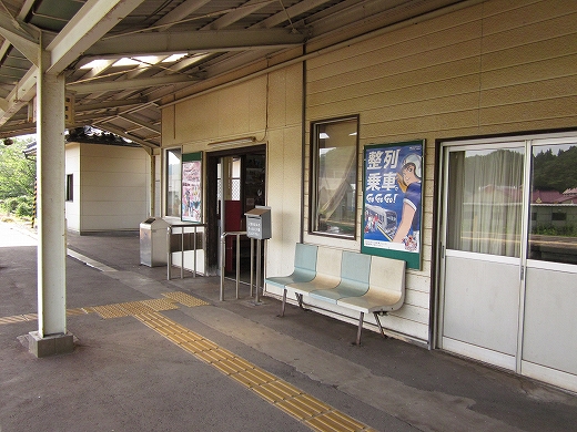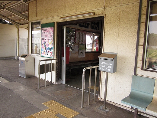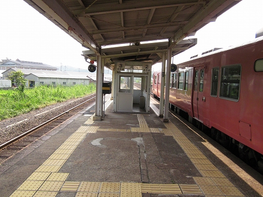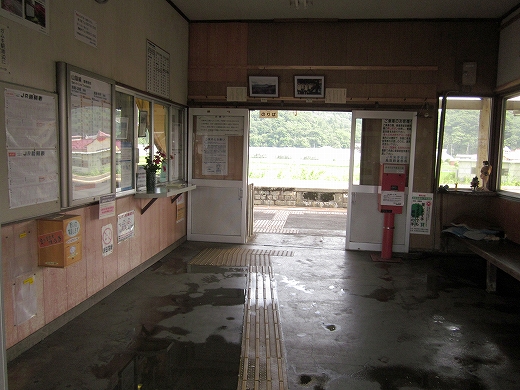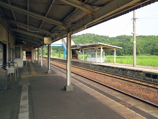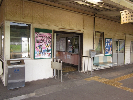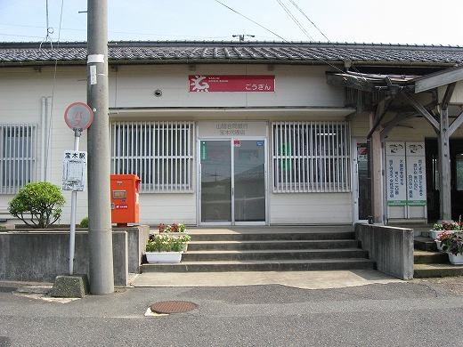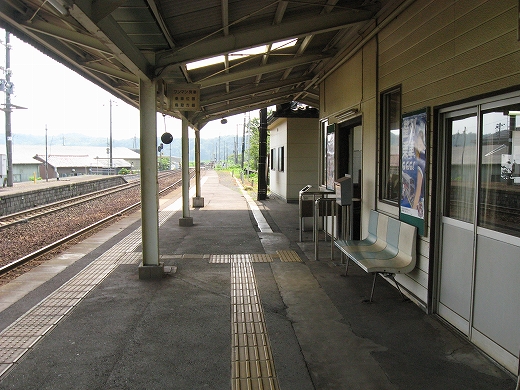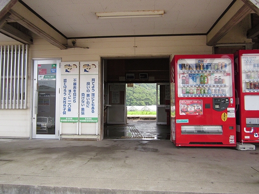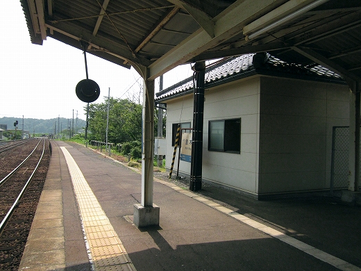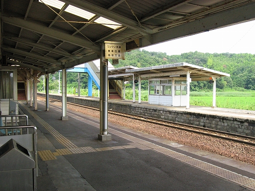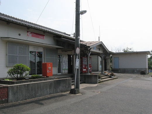 ここにはなんか変な奴でもかつてきたのか? こんなとある集落に?とおもうが、駅はやはり周囲に溶け合う切妻の車寄せで、そこに駅名が掲げられていた。いちぶを江州銀行のATMにしているのも、山陰らしい。貨物側線が花に囲われ、きれいに残っている。いまでも荷卸しするかと思うくらいだ。