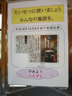裏手の駅舎は中もほとんど同じものだが、待合室の内部だけは違っていて、机も椅子もない。新聞記事が貼りつけてあり、椅子などが損壊にあったのだという。それを読んでいると、裏にもいた先の老爺の一人が、どうかしました?、と訊いてきた。このことについて訊ねたりするのはいやらしいので、ここは駅がきれいですね、と、初めの印象を語ってごまかすと、その人、「駅は、どこも、きれいなもんよ。少し向こうの青野ケ原なんて、もっと…いい。」と、硬い顔のまま世辞は受け取らない。しかし私が隠したのを見透かさせたようなものでもあった。けれどもその人も無愛想過ぎたと思ったのか、「ここはほんまはふつうの待合室とちごて、コミュニティルームいうて、あ、それはまあ向こうのことやけど、ふつうのとはちがうんやわ」と、だから入るな、という意味かとも取れたが、とりあえず説明することで和らげて、その人は駅裏の下校生を見送りに外へ出て行った。どこもきれいよ、というのは、うちの駅はたいしたことない、と譲ったのだろう。しかし荒廃しきった駅というものがほかにあるのを知ってしまっている今、ここの駅はかなり良いものだった。およそ破壊しようとは思わせないようなきちんと整備された人の目の行き届きそうな駅だけに、かなりの不満や怨みがあったのだと窺われた。きれいに纏った公共物でも、税政に関して誰かに不満や怨みがあるのも体現しなければならないとすると、駅の運命というのもまた過酷である。