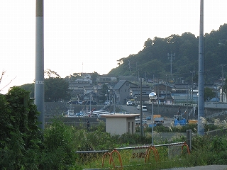 ホーム端から見た市振の集落。手前が市振漁港。