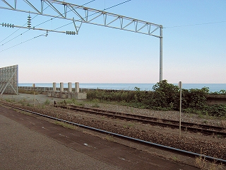 それで今ホームに出ているが、あの踏切と雪よけというのは、隣の親不知駅にもあった。そういえば互いにホームも一つで、構内の風景がかなり似ているから、私は市振と親不知を、双子の駅、ということに決めた。こうしても間違いなさそうだ。ではどっちが、というと、やはり親不知の方が抜けたものがあった。ここはまだ、何となく街に行きたい気持を引きずっているようなのだった。
