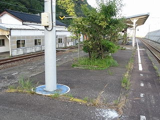 この市振駅の特徴で、ホームにある支柱の根元にはこんなふうに水輪が描かれていた。何か水の中に立っているみたい。植え込みは混合して伸び放題。