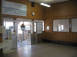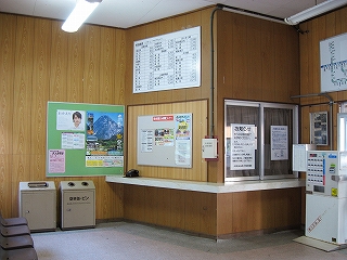 据え付け長椅子のある駅舎内。