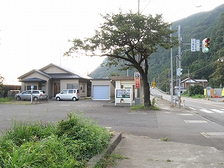 市振駅入口。駅の横には駐在所がある。この木はどこか市振らしい。