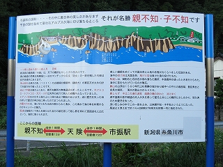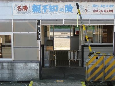 そうか、白砂青松ではなかったんだ、こんなものか、と、海辺の貧相な構内踏切を渡ろうとすると、その先の木造の雪よけに、名勝、親不知、と記されていた。これはだいぶ昔のスタイルだ。親不知ももう、はやらなくなり、放置されてきたのが薫った。