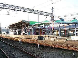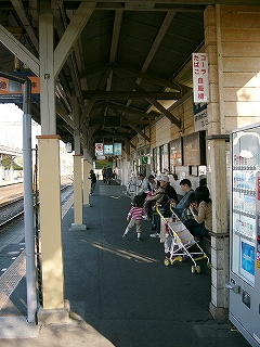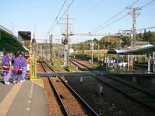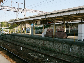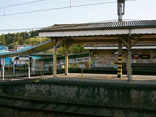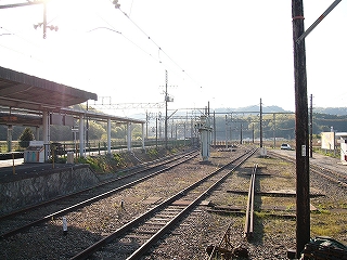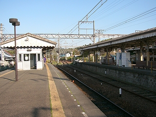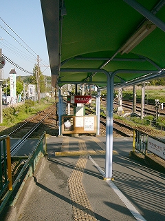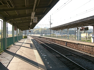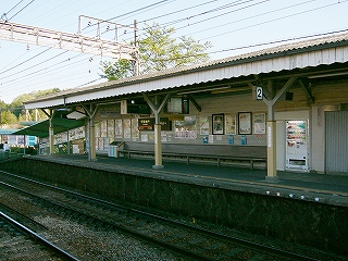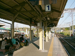 今しがた着いたホームは2番線で、ここが駅舎から最も離れていた。 大阪方面行きの列車の発着するホームだ。 壁を掘り込んだように細長い待合所があり、外にはずいぶんと長い長椅子もあった。 ホームの裏側は田んぼと里山である。