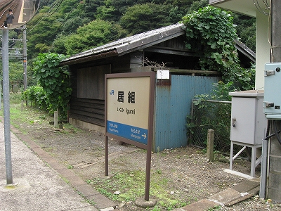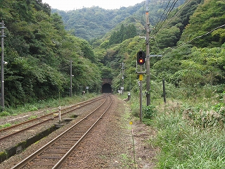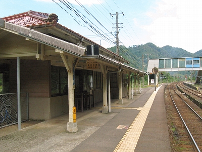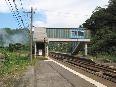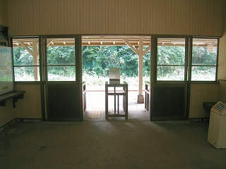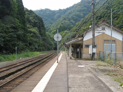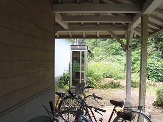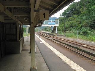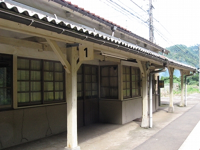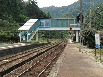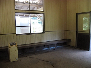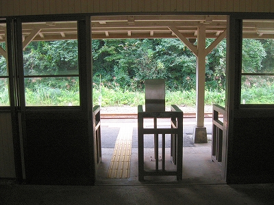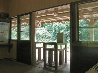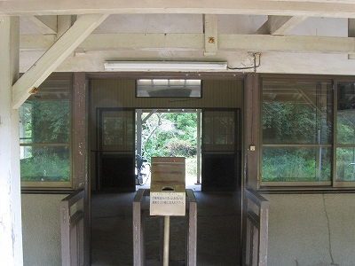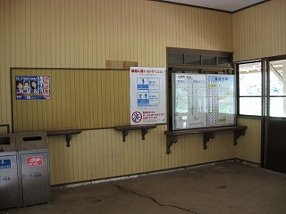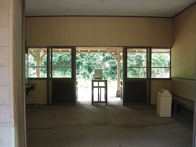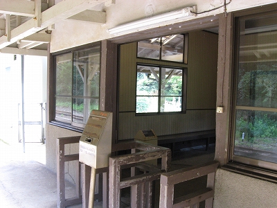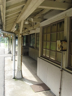 あたりは山が迫って、遠くにぽつんと赤黒い灯火、なんかヒグラシの響きが似合いそうだ。時間が押していることもあり早速、昼なのに暗い陋屋に潜(もぐ)ると、微かに酸鼻を催す黴くささで どっと重苦しい空気が立ち込めている。「なんだこれは…」 新しい時刻表が旧窓口へ粗雑に打ち付けられるこの空間は、これといった美点や特色はなく、もはや取り上げられることもなく忘れ去られているといった感じがぴったりだった。厠はおぞましいほど古めかしい黒板張りだが、ほっとしたことに、使用できぬように斜交いに打ちつけられていた。