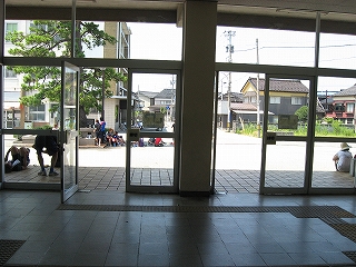 さきの学生らは水場に群がって自棄的に頭から水をかぶったり、駅の軒下の日陰に腰かけたり、いっぽうで日なたで隊列を組んだりの様々だった。半袖にジャージのズボンなどで、なんの途中なんだろうと思うが、しばらく観察して察するに、登山のための夏季歩行訓練の休憩らしいようだった。 「そっか、ここは立山の町だもんな。」 こんなふうに自由に団体が休めるくらい、街ではないのだけど、駅の建物だけ見ると、すぐ前に市街を擁しているような趣きだった。その建物の装飾のなさは、あらかじめ駅前の町の賑やかさに飾られるためのものであるかのようでさえあって、それは駅や旅情というより、役場や公共施設だった。かといって、デザインすればいいのでもないのだから、やはり、駅と同時には見えはしない街の印象、が駅舎を色付けし、また、駅舎が街を、締めくくるのだろう。