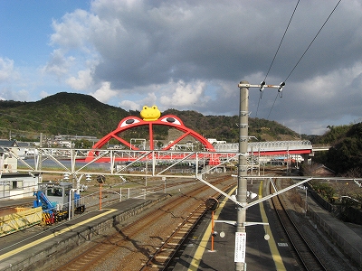 印南駅はなかなか規格がいいようで、三線が気持ちよくカーブを描いている。構内としてはそっけないが、特急が停まってもおかしくないほどだ。やっと平野部に出たか、とのびのびした気分になり、無限の吸気たる海風が鼻孔に飽和しつづける。ときおり強く風は吹き、その冷たさには顔をしかめずにはいられない。街いまだ見えねども、すでに地開け、風光の予感はあり、しかれども海の見えぬことに、少しばかし安堵している、そういう自分。風のやむときは、ホームを歩いていく私の穏やかさを、柔らかい陽差しが愛撫する。やはり南の印象を印すという地の名のいうとおりなのだろうか。隠れるように蜜柑が生っていたり、椿が咲いているのを見つけた。あの血色のかえる大橋も、深く旅の始まる前としては、或る玩具、ないし雑貨だった。