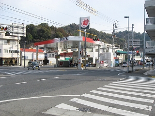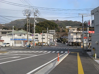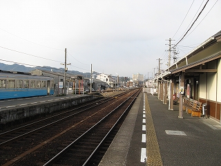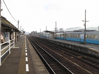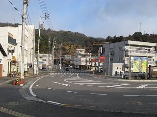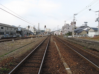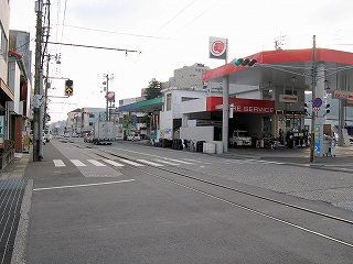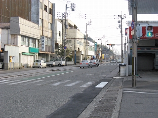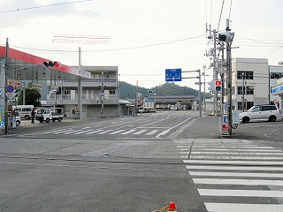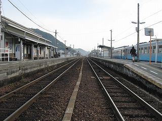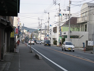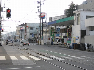 その交差点を過ぎて1件分隣にまた、同じぐらいの交差点があった。そこには、×印の信号や架線、しかもちょうど電停まである。ここがちょっと地位のある街に見えてきた。電停は伊野駅前電停で、振り返ると汽車線の駅舎が少し小さくなっていた。この電車線は高知と伊野を結ぶ土佐電気鉄道の軌道。その区間はJRと平行していて、二重になっている。この路線のこともあって、伊野までが高知近郊、という気がしつつあった。JR線も高知・伊野間は本数が多い。伊野電停の次は終着、伊野で、本式の駅がある。このとき知っていたら行っていたかもしれない…。