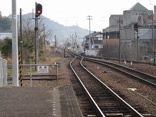 1番線ホームにて、須崎方面を眺めて。工場のようなものがぱらぱらと見えた。